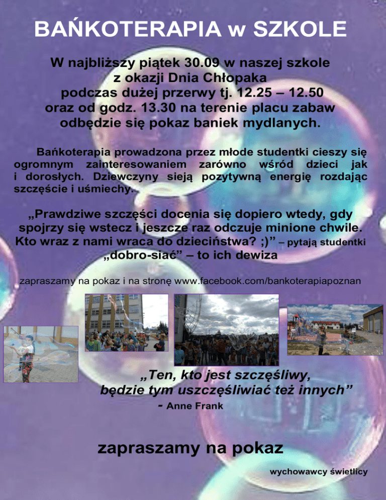BAŃKOTERAPIA w SZKOLE W najbliższy piątek 30.09 w naszej szkole z okazji Dnia Chłopaka podczas dużej przerwy tj. 12.25 – 12.50 oraz od godz. 13.30 na terenie placu zabaw odbędzie się pokaz baniek mydlanych. Bańkoterapia prowadzona przez młode studentki cieszy się ogromnym zainteresowaniem zarówno wśród dzieci jak i dorosłych. Dziewczyny sieją pozytywną energię rozdając szczęście i uśmiechy. „Prawdziwe szczęści docenia się dopiero wtedy, gdy spojrzy się wstecz i jeszcze raz odczuje minione chwile. Kto wraz z nami wraca do dzieciństwa? ;)” – pytają studentki „dobro-siać” – to ich dewiza zapraszamy na pokaz i na stronę www.facebook.com/bankoterapiapoznan „Ten, kto jest szczęśliwy, będzie tym uszczęśliwiać też innych” - Anne Frank zapraszamy na pokaz wychowawcy świetlicy