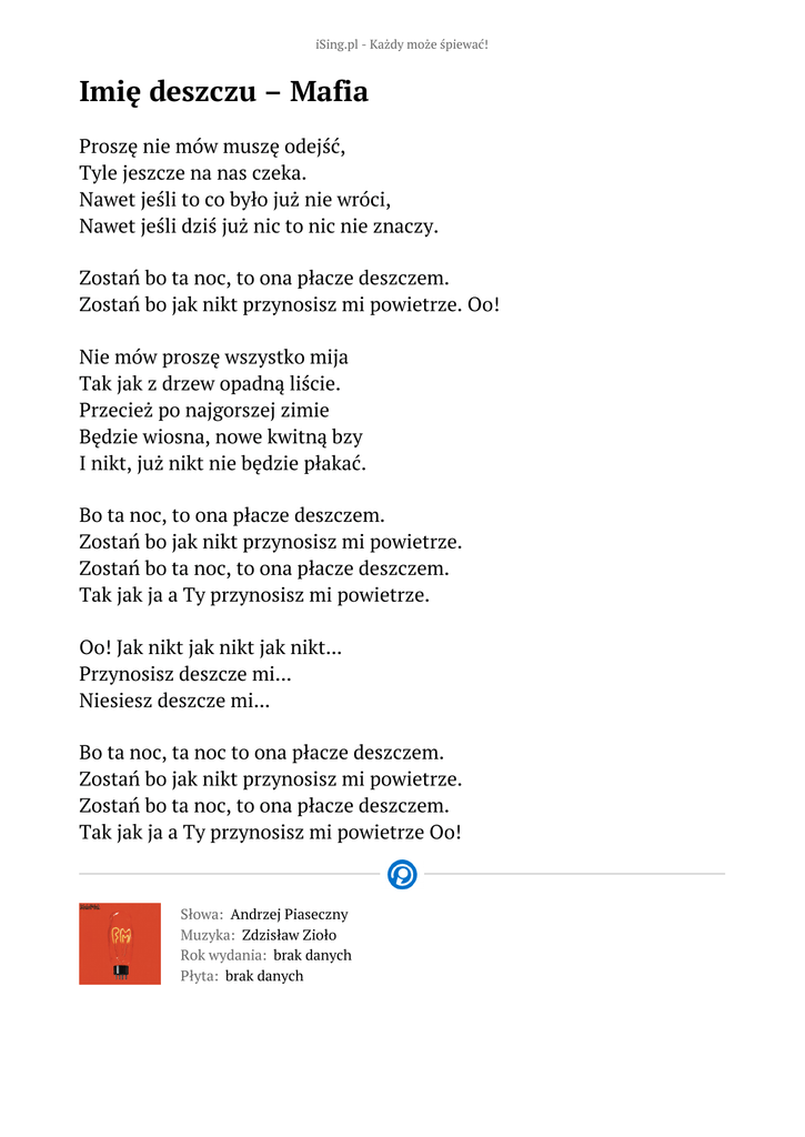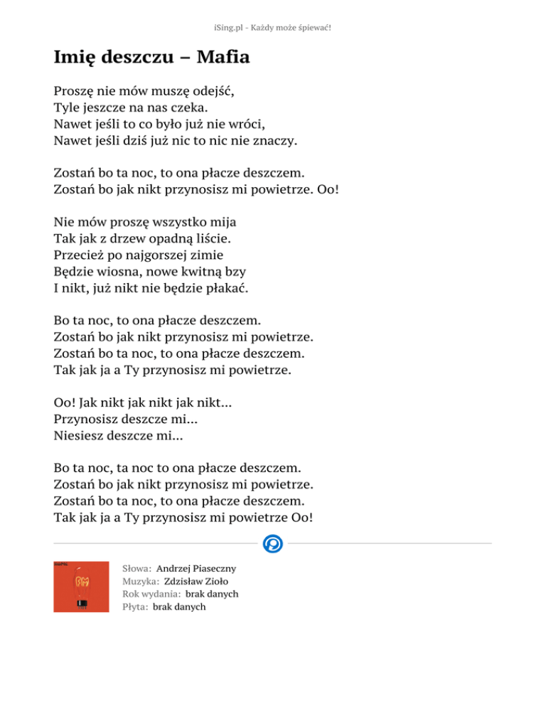 iSing.pl - Każdy może śpiewać! Imię deszczu – Mafia Proszę nie mów muszę odejść, Tyle jeszcze na nas czeka. Nawet jeśli to co było już nie wróci, Nawet jeśli dziś już nic to nic nie znaczy. Zostań bo ta noc, to ona płacze deszczem. Zostań bo jak nikt przynosisz mi powietrze. Oo! Nie mów proszę wszystko mija Tak jak z drzew opadną liście. Przecież po najgorszej zimie Będzie wiosna, nowe kwitną bzy I nikt, już nikt nie będzie płakać. Bo ta noc, to ona płacze deszczem. Zostań bo jak nikt przynosisz mi powietrze. Zostań bo ta noc, to ona płacze deszczem. Tak jak ja a Ty przynosisz mi powietrze. Oo! Jak nikt jak nikt jak nikt... Przynosisz deszcze mi... Niesiesz deszcze mi... Bo ta noc, ta noc to ona płacze deszczem. Zostań bo jak nikt przynosisz mi powietrze. Zostań bo ta noc, to ona płacze deszczem. Tak jak ja a Ty przynosisz mi powietrze Oo! Słowa: Andrzej Piaseczny Muzyka: Zdzisław Zioło Rok wydania: brak danych Płyta: brak danych