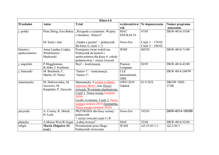 Klasa 6 b Przedmiot Autor Tytuł wydawnictwo/ rok Nr dopuszczenia