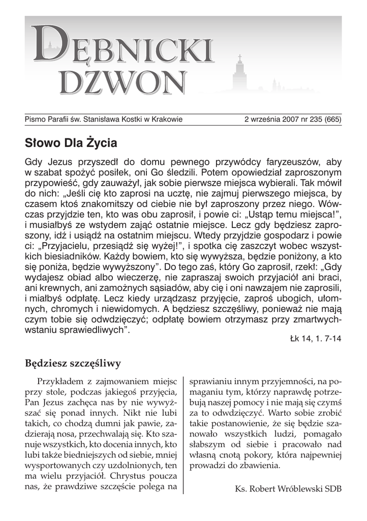 Pismo Parafii św. Stanisława Kostki w Krakowie 2 września 2007 nr 235 (665) Słowo Dla Życia Gdy Jezus przyszedł do domu pewnego przywódcy faryzeuszów, aby w szabat spożyć posiłek, oni Go śledzili. Potem opowiedział zaproszonym przypowieść, gdy zauważył, jak sobie pierwsze miejsca wybierali. Tak mówił do nich: „Jeśli cię kto zaprosi na ucztę, nie zajmuj pierwszego miejsca, by czasem ktoś znakomitszy od ciebie nie był zaproszony przez niego. Wówczas przyjdzie ten, kto was obu zaprosił, i powie ci: „Ustąp temu miejsca!”, i musiałbyś ze wstydem zająć ostatnie miejsce. Lecz gdy będziesz zaproszony, idź i usiądź na ostatnim miejscu. Wtedy przyjdzie gospodarz i powie ci: „Przyjacielu, przesiądź się wyżej!”, i spotka cię zaszczyt wobec wszystkich biesiadników. Każdy bowiem, kto się wywyższa, będzie poniżony, a kto się poniża, będzie wywyższony”. Do tego zaś, który Go zaprosił, rzekł: „Gdy wydajesz obiad albo wieczerzę, nie zapraszaj swoich przyjaciół ani braci, ani krewnych, ani zamożnych sąsiadów, aby cię i oni nawzajem nie zaprosili, i miałbyś odpłatę. Lecz kiedy urządzasz przyjęcie, zaproś ubogich, ułomnych, chromych i niewidomych. A będziesz szczęśliwy, ponieważ nie mają czym tobie się odwdzięczyć; odpłatę bowiem otrzymasz przy zmartwychwstaniu sprawiedliwych”. Łk 14, 1. 7-14 Będziesz szczęśliwy Przykładem z zajmowaniem miejsc przy stole, podczas jakiegoś przyjęcia, Pan Jezus zachęca nas by nie wywyższać się ponad innych. Nikt nie lubi takich, co chodzą dumni jak pawie, zadzierają nosa, przechwalają się. Kto szanuje wszystkich, kto docenia innych, kto lubi także biedniejszych od siebie, mniej wysportowanych czy uzdolnionych, ten ma wielu przyjaciół. Chrystus poucza nas, że prawdziwe szczęście polega na sprawianiu innym przyjemności, na pomaganiu tym, którzy naprawdę potrzebują naszej pomocy i nie mają się czymś za to odwdzięczyć. Warto sobie zrobić takie postanowienie, że się będzie szanowało wszystkich ludzi, pomagało słabszym od siebie i pracowało nad własną cnotą pokory, która najpewniej prowadzi do zbawienia. Ks. Robert Wróblewski SDB ZAPROSZENIE METROPOLITY KRAKOWSKIEGO NA XV PIELGRZYMKĘ RODZIN DO KALWARII ZEBRZYDOWSKIEJ Pragnę zaprosić Was, drogie rodziny archidiecezji krakowskiej – a wraz z wami także wszystkich, dla których małżeństwo i rodzina są fundamentalną wartością człowieka i społeczeństwa – na coroczną pielgrzymkę do Kalwarii Zebrzydowskiej w niedzielę 9 września. Pielgrzymka to nie tylko wysiłek fizyczny, lecz przede wszystkim wysiłek ducha, by lepiej odczytać Boże powołanie względem siebie, swojego życia w małżeństwie i rodzinie. To uczenie się patrzenia na to, co przeżywamy, nie tylko ludzkimi oczyma, ale odkrywanie spojrzenia Boga zwróconego na mnie i pytanie, jak w Jego oczach wygląda moje życie, małżeństwo, rodzina. Modlitwa na dróżkach i przed cudownym obrazem Matki Bożej Kalwaryjskiej otwiera nasze umysły i serca na lep- 2 sze poznanie i przyjęcie Bożego zamysłu wobec małżeństwa i rodziny. W czasie Drogi krzyżowej prowadzić nas będzie testament Ojca Świętego Jana Pawła II. Jest on księgą życia nie tylko dla osób duchownych, ale także dla każdego chrześcijanina. Sługa Boży odsłonił przed nami drogę, którą wiernie trzeba kroczyć pośród trudów życia, aby dojść do Domu Ojca. W testamencie Sługi Bożego odnajdziemy wiele głębokich i ważnych prawd o życiu małżeńskim i rodzinnym. Msza Święta o godzinie 11.00 będzie wielką modlitwą rodzin ze wszystkich parafii naszej archidiecezji. Jako pasterz Kościoła krakowskiego wraz z biskupami, kapłanami i wszystkim pielgrzymami przez wstawiennictwo Matki Bożej Kalwaryjskiej pragnę prosić dobrego Boga o wierność i uczciwość w małżeństwach, o wzajemną życzliwość i zgodę w rodzinach. Nade wszystko zaś będziemy się modlić o miłość, aby ona zwyciężała w każdym kryzysie, próbie i cierpieniu oraz w codziennym trudzie budowania małżeństwa i rodziny. W tym roku o modlitewne wsparcie naszych próśb poprosimy również dwóch wielkich świętych, którzy wyszli ze świętych rodzin i budowali wokół siebie duchową rodzinę zakonną. Będziemy więc przyzywać wstawiennictwa św. Jacka, dominikanina, w jubileuszowym roku 750-lecia jego śmierci, i św. Szymona z Lipnicy, bernardyna, którego 3 czerwca tego roku kanonizował Ojciec Święty Benedykt XVI. Na placu Rajskim oddamy cześć ich relikwiom. Zwracam się z gorącą prośbą do kapłanów, osób zakonnych i doradców życia rodzinnego o dobre przygotowanie pielgrzymki i o wspólną modlitwę z rodzinami w parafiach oraz w Kalwarii Zebrzydowskiej w czasie pielgrzymki. Z radością oczekuję na Waszą obecność w niedzielę 9 września, by razem z Wami u stóp Matki Bożej Kalwaryjskiej, wielkiej Wychowawczyni świętych, prosić Boga, aby małżeństwa i rodziny naszej archidiecezji krocząc drogą miłości i wierności małżeńskiej, wzrastały w świętości. Na trud pielgrzymowania z serca wszystkim błogosławię. Stanisław Kardynał Dziwisz Arcybiskup Metropolita Krakowski Kraków, dnia 17 sierpnia 2007 3 DZIĘKUJĘ PROSZĘ Jeżeli po przeczytaniu Dziękuję – Proszę zrodzi się w nas potrzeba serca aby podzielić się z kimś potrzebującym, aby zaspokoić czyjąś prośbę to wystarczy tylko podejść do punktu odzieży u p. Halinki, w naszej parafii i pozostawić tam to czym chcemy się podzielić. Można tam również pozostawić informację o innych rzeczach, którymi chcielibyśmy się podzielić. Jeżeli prośba będzie dotyczyła pieniędzy, to można je w kopercie opisanej dla kogo pozostawić w zakrystii naszego kościoła lub w kancelarii parafialnej. Prosimy o: Oferujemy: • • • • • • • • • • przetwory domowe, • odzież dziecięcą i młodzieżową, • 2 szafy dwudrzwiowe w tym 1 z nads