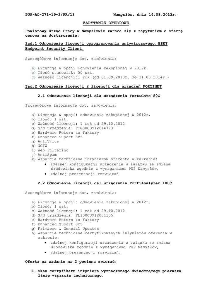 PUP-AO-271-19-2/PR/13 Namysłów, dnia 14.08.2013r. ZAPYTANIE OFERTOWE Powiatowy Urząd Pracy w Namysłowie zwraca się z zapytaniem o ofertę cenową na dostarczenie: Zad.1 Odnowienie licencji oprogramowania antywirusowego: ESET Endpoint Security Client. Szczegółowe informację dot. zamówienia: a) Licencja w opcji odnowienia zakupionej w 2012r. b) Ilość stanowisk: 50 szt. c) Ważność licencji:1 rok (od 01.09.2013r. do 31.08.2014r.) Zad.2 Odnowienie licencji 2 licencji dla urządzeń FORTINET 2.1 Odnowienie licencji dla urządzenia FortiGate 80C Szczegółowe informację dot. zamówienia: a) b) c) d) e) f) g) h) i) j) k) Licencja w opcji: odnowienia zakupionej w 2012r. Ilość: 1 szt. Ważność licencji: 1 rok od 29.10.2012 S/N urządzenia: FTG80C3912614773 Hardware Return to faktory Enhanced Suport 8x5 AntiVirus NGFW Web Filtering AntiSpam Wsparcie techniczne inżynierów oferenta w zakresie: zdalnej konfiguracji urządzenia w związku ze zmianą środowiska zgodnie z wymaganiami PUP Namysłów, zdalnej prezentacji rozwiązań 2.2 Odnowienie licencji dal urządzenia FortiAnalyzer 100C Szczegółowe informację dot. zamówienia: a) b) c) d) e) f) g) h) Licencja w opcji: odnowienia zakupionej w 2012r. Ilość: 1 szt. Ważność licencji: 1 rok od 29.10.2012 S/N urządzenia: FL100C3912001155 Hardware Return to faktory Enhanced Suport 8x5 Frimawre & General Updates Wsparcie techniczne certyfikowanych inżynierów oferenta w zakresie: zdalnej konfiguracji urządzenia w związku ze zmianą środowiska zgodnie z wymaganiami PUP Namysłów, zdalnej prezentacji rozwiązań. Oferta na zadanie nr 2 powinna zwierać: 1. Skan certyfikatu inżyniera wyznaczonego świadczącego pierwszą linię wsparcia technicznego. 2. Dane kontaktowe wyznaczonego inżyniera wsparcia technicznego tj. nr telefonu oraz email. Zad.3 Odnowienie wsparcia technicznego i rozszerzenie licencji oprogramowania Axence Navision 3.1 Przedłużenie subskrypcji na Service Agreement dla Licencji nVision Licencja:(N75, I55, U55, H55, D55) z podziałem na konsolę nr 1:(N59,I49,U49,H49,D49) i konsolę nr 2:(N6,I6,U6,H6,D6) a) Ważność licencji: 1 rok od daty zakupu b) Pomoc techniczna: 5d x 8h c) Aktualizacja oprogramowania do najnowszej wersji w okresie trwania wsparcia technicznego. 3.2 Rozszerzenie licencji o 10 modułów Network nVision Posiadana licencja to:(N65, I55, U55, H55, D55) rozszerzona do (N75, I55, U55, H55, D55) z podziałem na: Konsola nr 1:(N69,I49,U49,H49,D49) – zwiększona o 10 szt. Konsola nr 2:(N6,I6,U6,H6,D6) – bez zmian. Ważność licencji: bezterminowa Oferty należy przesłać droga elektroniczną na adres [email protected] lub do Powiatowego Urzędu Pracy w Namysłowie (parter, sekretariat pok. nr 9) do dnia 29 sierpnia 2013r. godziny 10:00 (liczy się data, godzina wpływu). Oferent zobowiązuje się dostarczyć zmówiony towar oraz usługę do 14 dni od podpisania umowy, lub złożenia zamówienia przez PUP Namysłów Płatność zostanie zrealizowana na podstawie Faktury VAT z 14 dniowym terminem płatności. Dopuszcza się składanie ofert częściowych na całe zadania np. do zadania nr 2 oferta musi zawierać podzadania 2.1 oraz 2.2 (analogicznie zadanie nr 3)wraz z cena całego zadania - bez cen składowych podzadań. O wyborze oferty decyduje najniższa cena całego zadania. Ofertowany sprzęt lub usługa musi posiadać nie gorszych parametry niż wymienione w zapytaniu ofertowym. Uwaga: Oferty niekompletne lub złożone po terminie nie będą rozpatrywane. Z poważaniem, Dyrektor PUP Namysłów Iwona Kamińska