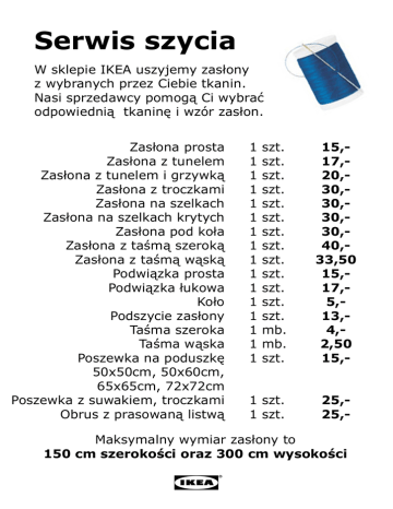 Serwis szycia W sklepie IKEA uszyjemy zasłony z wybranych przez Ciebie tkanin. Nasi sprzedawcy pomogą Ci wybrać odpowiednią tkaninę i wzór zasłon. Zasłona prosta Zasłona z tunelem Zasłona z tunelem i grzywką Zasłona z troczkami Zasłona na szelkach Zasłona na szelkach krytych Zasłona pod koła Zasłona z taśmą szeroką Zasłona z taśmą wąską Podwiązka prosta Podwiązka łukowa Koło Podszycie zasłony Taśma szeroka Taśma wąska Poszewka na poduszkę 50x50cm, 50x60cm, 65x65cm, 72x72cm Poszewka z suwakiem, troczkami Obrus z prasowaną listwą 1 1 1 1 1 1 1 1 1 1 1 1 1 1 1 1 szt. szt. szt. szt. szt. szt. szt. szt. szt. szt. szt. szt. szt. mb. mb. szt. 1 szt. 1 szt. 15,17,20,30,30,30,30,40,33,50 15,17,5,13,4,2,50 15,25,25,- Maksymalny wymiar zasłony to 150 cm szerokości oraz 300 cm wysokości