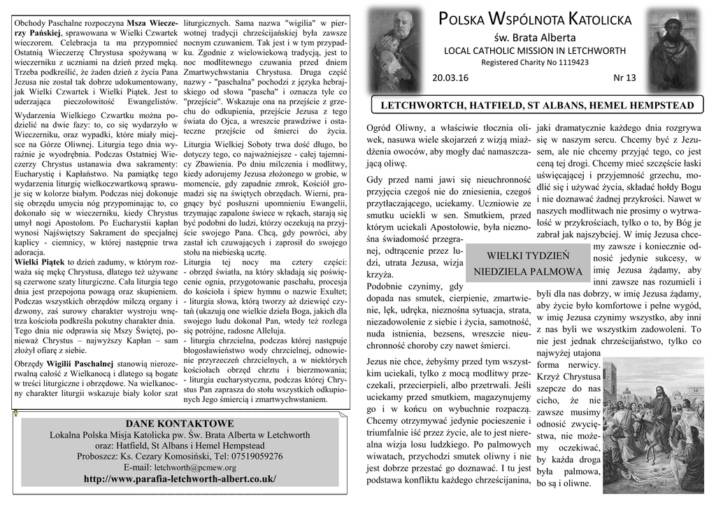 Obchody Paschalne rozpoczyna Msza Wieczerzy Pańskiej, sprawowana w Wielki Czwartek wieczorem. Celebracja ta ma przypomnieć Ostatnią Wieczerzę Chrystusa spożywaną w wieczerniku z uczniami na dzień przed męką. Trzeba podkreślić, że żaden dzień z życia Pana Jezusa nie został tak dobrze udokumentowany, jak Wielki Czwartek i Wielki Piątek. Jest to uderzająca pieczołowitość Ewangelistów. liturgicznych. Sama nazwa "wigilia" w pierwotnej tradycji chrześcijańskiej była zawsze nocnym czuwaniem. Tak jest i w tym przypadku. Zgodnie z wielowiekową tradycją, jest to noc modlitewnego czuwania przed dniem Zmartwychwstania Chrystusa. Druga część nazwy - "paschalna" pochodzi z języka hebrajskiego od słowa "pascha" i oznacza tyle co "przejście". Wskazuje ona na przejście z grzeWydarzenia Wielkiego Czwartku można po- chu do odkupienia, przejście Jezusa z tego dzielić na dwie fazy: to, co się wydarzyło w świata do Ojca, a wreszcie prawdziwe i ostaWieczerniku, oraz wypadki, które miały miej- teczne przejście od śmierci do życia. sce na Górze Oliwnej. Liturgia tego dnia wy- Liturgia Wielkiej Soboty trwa dość długo, bo raźnie je wyodrębnia. Podczas Ostatniej Wie- dotyczy tego, co najważniejsze - całej tajemniczerzy Chrystus ustanawia dwa sakramenty: cy Zbawienia. Po dniu milczenia i modlitwy, Eucharystię i Kapłaństwo. Na pamiątkę tego kiedy adorujemy Jezusa złożonego w grobie, w wydarzenia liturgię wielkoczwartkową sprawu- momencie, gdy zapadnie zmrok, Kościół groje się w kolorze białym. Podczas niej dokonuje madzi się na świętych obrzędach. Wierni, prasię obrzędu umycia nóg przypominając to, co gnący być posłuszni upomnieniu Ewangelii, dokonało się w wieczerniku, kiedy Chrystus trzymając zapalone świece w rękach, starają się umył nogi Apostołom. Po Eucharystii kapłan być podobni do ludzi, którzy oczekują na przyjwynosi Najświętszy Sakrament do specjalnej ście swojego Pana. Chcą, gdy powróci, aby kaplicy - ciemnicy, w której następnie trwa zastał ich czuwających i zaprosił do swojego adoracja. stołu na niebieską ucztę. Wielki Piątek to dzień zadumy, w którym roz- Liturgia tej nocy ma cztery części: waża się mękę Chrystusa, dlatego też używane - obrzęd światła, na który składają się poświęsą czerwone szaty liturgiczne. Cała liturgia tego cenie ognia, przygotowanie paschału, procesja dnia jest przepojona powagą oraz skupieniem. do kościoła i śpiew hymnu o nazwie Exultet; Podczas wszystkich obrzędów milczą organy i - liturgia słowa, którą tworzy aż dziewięć czydzwony, zaś surowy charakter wystroju wnę- tań (ukazują one wielkie dzieła Boga, jakich dla trza kościoła podkreśla pokutny charakter dnia. swojego ludu dokonał Pan, wtedy też rozlega Tego dnia nie odprawia się Mszy Świętej, po- się potrójne, radosne Alleluja. nieważ Chrystus – najwyższy Kapłan – sam - liturgia chrzcielna, podczas której następuje złożył ofiarę z siebie. błogosławieństwo wody chrzcielnej, odnowieObrzędy Wigilii Paschalnej stanowią nieroze- nie przyrzeczeń chrzcielnych, a w niektórych rwalną całość z Wielkanocą i dlatego są bogate kościołach obrzęd chrztu i bierzmowania; w treści liturgiczne i obrzędowe. Na wielkanoc- - liturgia eucharystyczna, podczas której Chryny charakter liturgii wskazuje biały kolor szat stus Pan zaprasza do stołu wszystkich odkupionych Jego śmiercią i zmartwychwstaniem. DANE KONTAKTOWE Lokalna Polska Misja Katolicka pw. Św. Brata Alberta w Letchworth oraz: Hatfield, St Albans i Hemel Hempstead Proboszcz: Ks. Cezary Komosiński, Tel: 07519059276 E-mail: [email protected] http://www.parafia-letchworth-albert.co.uk/ POLSKA WSPÓLNOTA KATOLICKA św. Brata Alberta LOCAL CATHOLIC MISSION IN LETCHWORTH Registered Charity No 1119423 20.03.16 Nr 13 LETCHWORTCH, HATFIELD, ST ALBANS, HEMEL HEMPSTEAD Ogród Oliwny, a właściwie tłocznia oliwek, nasuwa wiele skojarzeń z wizją miażdżenia owoców, aby mogły dać namaszczającą oliwę. jaki dramatycznie każdego dnia rozgrywa się w naszym sercu. Chcemy być z Jezusem, ale nie chcemy przyjąć tego, co jest ceną tej drogi. Chcemy mieć szczęście łaski Gdy przed nami jawi się nieuchronność uświęcającej i przyjemność grzechu, moprzyjęcia czegoś nie do zniesienia, czegoś dlić się i używać życia, składać hołdy Bogu przytłaczającego, uciekamy. Uczniowie ze i nie doznawać żadnej przykrości. Nawet w smutku uciekli w sen. Smutkiem, przed naszych modlitwach nie prosimy o wytrwaktórym uciekali Apostołowie, była niezno- łość w przykrościach, tylko o to, by Bóg je zabrał jak najszybciej. W imię Jezusa chceśna świadomość przegramy zawsze i koniecznie odnej, odtrącenie przez luWIELKI TYDZIEŃ nosić jedynie sukcesy, w dzi, utrata Jezusa, wizja NIEDZIELA PALMOWA imię Jezusa żądamy, aby krzyża. inni zawsze nas rozumieli i Podobnie czynimy, gdy dopada nas smutek, cierpienie, zmartwie- byli dla nas dobrzy, w imię Jezusa żądamy, nie, lęk, udręka, nieznośna sytuacja, strata, aby życie było komfortowe i pełne wygód, niezadowolenie z siebie i życia, samotność, w imię Jezusa czynimy wszystko, aby inni nuda istnienia, bezsens, wreszcie nieu- z nas byli we wszystkim zadowoleni. To nie jest jednak chrześcijaństwo, tylko co chronność choroby czy nawet śmierci. najwyżej utajona Jezus nie chce, żebyśmy przed tym wszyst- forma nerwicy. kim uciekali, tylko z mocą modlitwy prze- Krzyż Chrystusa czekali, przecierpieli, albo przetrwali. Jeśli szepcze do nas uciekamy przed smutkiem, magazynujemy cicho, że nie go i w końcu on wybuchnie rozpaczą. zawsze musimy Chcemy otrzymywać jedynie pocieszenie i odnosić zwyciętriumfalnie iść przez życie, ale to jest niere- stwa, nie możealna wizja losu ludzkiego. Po palmowych my oczekiwać, wiwatach, przychodzi smutek oliwny i nie by każda droga jest dobrze przestać go doznawać. I tu jest była palmowa, 