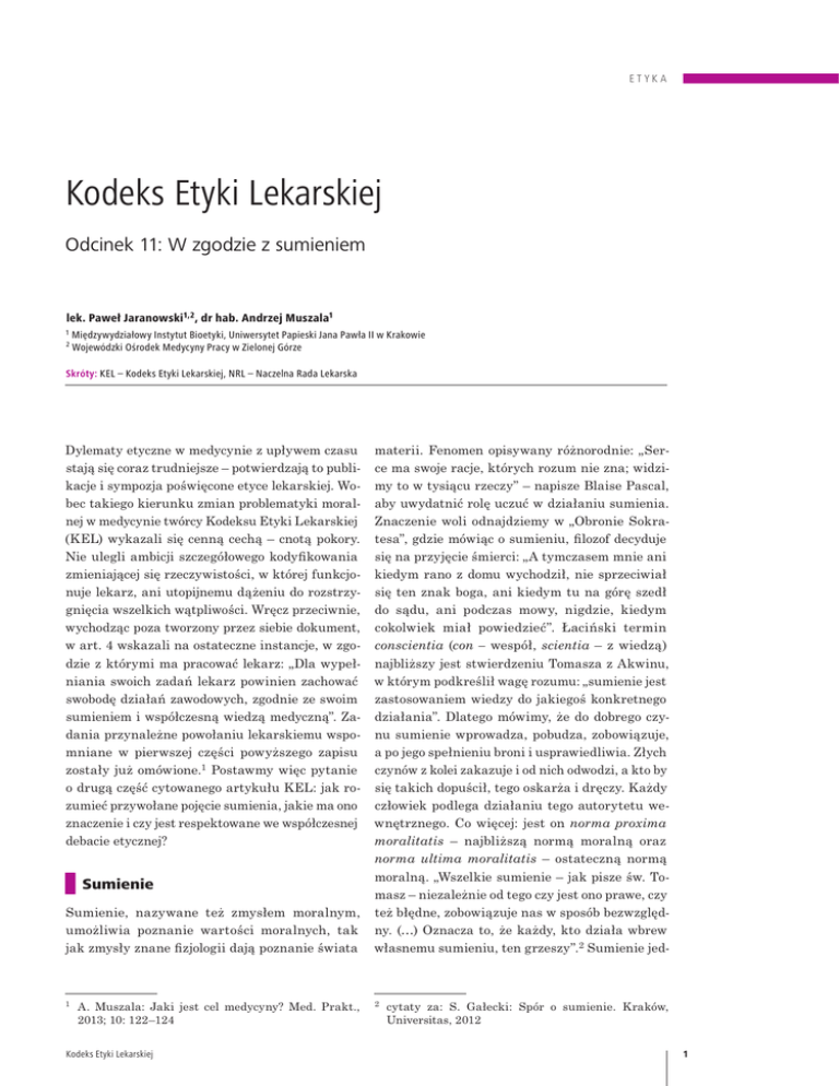 ETYKA Kodeks Etyki Lekarskiej Odcinek 11: W zgodzie z sumieniem lek. Paweł Jaranowski1,2 , dr hab. Andrzej Muszala1 1 2 iędzywydziałowy Instytut Bioetyki, Uniwersytet Papieski Jana Pawła II w Krakowie M Wojewódzki Ośrodek Medycyny Pracy w Zielonej Górze Skróty: KEL – Kodeks Etyki Lekarskiej, NRL – Naczelna Rada Lekarska Dylematy etyczne w medycynie z upływem czasu stają się coraz trudniejsze – potwierdzają to publi‑ kacje i sympozja poświęcone etyce lekarskiej. Wo‑ bec takiego kierunku zmian problematyki moral‑ nej w medycynie twórcy Kodeksu Etyki Lekarskiej (KEL) wykazali się cenną cechą – cnotą pokory. Nie ulegli ambicji szczegółowego kodyfikowania zmieniającej się rzeczywistości, w której funkcjo‑ nuje lekarz, ani utopijnemu dążeniu do rozstrzy‑ gnięcia wszelkich wątpliwości. Wręcz przeciwnie, wychodząc poza tworzony przez siebie dokument, w art. 4 wskazali na ostateczne instancje, w zgo‑ dzie z którymi ma pracować lekarz: „Dla wypeł‑ niania swoich zadań lekarz powinien zachować swobodę działań zawodowych, zgodnie ze swoim sumieniem i współczesną wiedzą medyczną”. Za‑ dania przynależne powołaniu lekarskiemu wspo‑ mniane w pierwszej części powyższego zapisu zostały już omówione.1 Postawmy więc pytanie o drugą część cytowanego artykułu KEL: jak ro‑ zumieć przywołane pojęcie sumienia, jakie ma ono znaczenie i czy jest respektowane we współczesnej debacie etycznej? Sumienie, nazywane też zmysłem moralnym, umożliwia poznanie wartości moralnych, tak jak zmysły znane fizjologii dają poznanie świata materii. Fenomen opisywany różnorodnie: „Ser‑ ce ma swoje racje, których rozum nie zna; widzi‑ my to w tysiącu rzeczy” – napisze Blaise Pascal, aby uwydatnić rolę uczuć w działaniu sumienia. Znaczenie woli odnajdziemy w „Obronie Sokra‑ tesa”, gdzie mówiąc o sumieniu, filozof decyduje się na przyjęcie śmierci: „A tymczasem mnie ani kiedym rano z domu wychodził, nie sprzeciwiał się ten znak boga, ani kiedym tu na górę szedł do sądu, ani podczas mowy, nigdzie, kiedym cokolwiek miał powiedzieć”. Łaciński termin conscientia (con – wespół, scientia – z wiedzą) najbliższy jest stwierdzeniu Tomasza z Akwinu, w którym podkreślił wagę rozumu: „sumienie jest zastosowaniem wiedzy do jakiegoś konkretnego działania”. Dlatego mówimy, że do dobrego czy‑ nu sumienie wprowadza, pobudza, zobowiązuje, a po jego spełnieniu broni i usprawiedliwia. Złych czynów z kolei zakazuje i od nich odwodzi, a kto by się takich dopuścił, tego oskarża i dręczy. Każdy człowiek podlega działaniu tego autorytetu we‑ wnętrznego. Co więcej: jest on norma proxima moralitatis – najbliższą normą moralną oraz norma ultima moralitatis – ostateczną normą moralną. „Wszelkie sumienie – jak pisze św. To‑ masz – niezależnie od tego czy jest ono prawe, czy też błędne, zobowiązuje nas w sposób bezwzględ‑ ny. (…) Oznacza to, że każdy, kto działa wbrew własnemu sumieniu, ten grzeszy”.2 Sumienie jed‑ 1 2 Sumienie A. Muszala: Jaki jest cel medycyny? Med. Prakt., 2013; 10: 122–124 Kodeks Etyki Lekarskiej cytaty za: S. Gałecki: Spór o sumienie. Kraków, Universitas, 2012 1 ETYKA nak może błądzić: przez brak wiedzy o tym, co jest dobre (etyka) bądź przez osobiste skłonności i motywy (błędnie ukształtowane sumienie). Co więcej – działanie według sumienia nie oznacza kierowania się uczuciami. Niekiedy trudno odróż‑ nić prawdziwy sąd rozumu od emocji, rozróżnić między głosem sumienia a siłą uczuć. Potrzeba więc autorytetów zewnętrznych, z którymi lekarz mógłby konfrontować, uzgadniać swoje wybory. Taką właśnie rolę pełni KEL. Wolność sumienia, klauzula sumienia Sumienie stanowi część człowieczeństwa, a wol‑ ność sumienia – to elementarne prawo, którym mierzy się wolność człowieka. Toteż w Powszech‑ nej Deklaracji Praw Człowieka w art. 18 zapisa‑ no: „Każdy człowiek ma prawo do wolności myśli, sumienia i wyznania”. Podobnie w Konstytucji Rzeczpospolitej Polskiej znajdziemy art. 53, ust. 1: „Każdemu zapewnia się wolność sumienia i reli‑ gii”. W demokracji często czyni się odniesienia do wolności sumienia, ponieważ współgrają one z pojęciem indywidualnej wolności, uznawanej w takim ustroju za wartość. Państwo stara się być neutralne w sprawach religii i moralności, po‑ zostawiając wybory w tych sferach obywatelom. W zakresie życia prywatnego przyjmuje się to za‑ zwyczaj za oczywistość. Niemniej możliwość od‑ wołania się do sumienia w przestrzeni publicznej, w obliczu uchwalanych praw pozytywnych, jest podawana w wątpliwość. W tej płaszczyźnie nowo‑ żytne państwo przyjmuje za swój cel zachowanie ładu i pokoju społecznego. Wobec tego pojawiają się obawy, że obywatel ze swoim autonomicznym sumieniem będzie źródłem niepokojów i konflik‑ tów. „Obywatel posiada niejako absolutną wol‑ ność sumienna w sferze prywatnej, ale ma coraz większe ograniczenia w sferze publicznej, która rządzi się innymi prawami. W życiu prywatnym może się szerzyć anarchia moralna i religijna, ale w życiu publicznym ma obowiązywać rygoryzm pozytywistycznego kontraktualizmu. Obywatel ma prawo, zgodnie ze swoim sumieniem, wszyst‑ ko zrobić w swoim domu, ale niewiele (albo nic) nie może z nim uczynić w urzędzie czy w miejscu 2 pracy”.3 W takim kontekście przestrzeni publicz‑ nej ludzie sumienia spotykają się z niechęcią, jeśli nie z wrogością, „państwu potrzebni są bowiem lojalni urzędnicy, bezmyślni wykonawcy ustaw i przepisów państwowych”.4 Gwarancje wolności sumienia znikają pod rygorem przepisów szcze‑ gółowych. Ignoruje się, że to prawo wymaga uza‑ sadnienia moralnego, nie moralność legitymizacji prawnej. Dzisiaj sprzeciw sumienia nie skutkuje karą śmierci, lecz naciskami