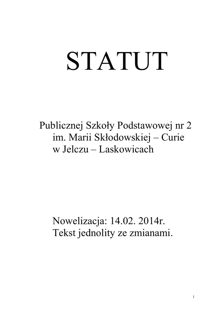 STATUT Publicznej Szkoły Podstawowej nr 2 im. Marii Skłodowskiej – Curie w Jelczu – Laskowicach Nowelizacja: 14.02. 2014r. Tekst jednolity ze zmianami. 1 SPIS TREŚCI I. POSTANOWIENIA WSTĘPNE 2 II. CELE I ZADANIA SZKOŁY 5 III. ORGANY SZKOŁY ORAZ ICH ZADANIA 13 IV. ORGANIZACJA SZKOŁY 22 V. 28 NAUCZYCIELE I INNI PRACOWNICY SZKOŁY VI. PRAWA I OBOWIĄZKI RODZICÓW 35 VII. ZASADY REKRUTACJI UCZNIÓW 37 VIII. PRAWA I OBOWIAZKI UCZNIÓW 40 IX. RODZAJE NAGRÓD I KAR 45 X. TRADYCJE SZKOŁY 49 XI. WEWNĄTRZSZKOLNY SYSTEM OCENIANIA 51 XII. POSTANOWIENIA KOŃCOWE 68 2 I. POSTANOWIENIA WSTĘPNE §1 1. Publiczna Szkoła Podstawowa Nr 2 im. Marii Skłodowskiej – Curie , zwana dalej „szkołą”, jest obowiązkową, sześcioklasową, publiczną szkołą podstawową nauczającą w języku polskim. 2. W szkole są prowadzone oddziały przedszkolne, tzw. „zerówki”. 3. Siedzibą szkoły jest miasto Jelcz-Laskowice , aleja Młodych 1. 4. Uczniami szkoły są dzieci objęte obowiązkiem szkolnym w granicach obwodu szkoły. 5. Granice obwodu szkoły określa Rada Miejska w Jelczu-Laskowicach w uzgodnieniu z Kuratorium Oświaty. 6. W szkole prowadzona jest świetlica, której celem jest zapewnienie uczniom zorganizowanej opieki wychowawczej oraz pomocy w nauce. 7. W szkole znajduje się stołówka, której celem jest umożliwienie uczniom szkoły podstawowej i gimnazjum korzystania z odpłatnego lub bezpłatnego wyżywienia. 8. Szkoła działa na podstawie następujących aktów prawnych: 3 8.1. Ustawa z dnia 7 września 1991 o systemie oświaty (Dz. U. z 2004 r. Nr 256 , poz. 2572 z późniejszymi zmianami). 8.2. Rozporządzenie MEN z dnia 21 maja w sprawie ramowych statutów publicznego przedszkola oraz publicznych szkół (Dz. U. z 2001r. Nr 61, poz.624 z późniejszymi zmianami ). §2 1. Organem prowadzącym szkołę i zapewniającym warunki realizacji obowiązku szkolnego jest Gmina Jelcz-Laskowice. 2. Organem sprawującym nadzór pedagogiczny jest Dolnośląski Kurator Oświaty. 3. Czas trwania cyklu kształcenia w szkole trwa 6 lat. 4. Do realizacji celów statutowych szkoła zapewnia możliwość korzystania z : 4.1. sal lekcyjnych i gabinetów przedmiotowych z niezbędnym wyposażeniem. 4.2. świetlicy 4.3. biblioteki 4.4. stołówki 4.5. sali gimnastycznej i boisk sportowych 4.6. Pływalni Miejskiej Zasady korzystania z Pływalni Miejskiej określają odrębne ustalenia. 4.7. gabinetu pielęgniarskiego 4 4.8. pomieszczeń do działalności samorządu uczniowskiego, sklepiku, redakcji gazetki szkolnej 4.9. szatni 4.10. pomieszczeń gospodarczych. 5. Szkoła prowadzi w klasach I – VI obowiązkową naukę jednego języka zachodniego. 6. Szkoła prowadzi współpracę z uczelniami wyższymi poprzez: 6.1. opiekę nad praktykami pedagogicznymi studentów 6.2. prowadzenie na terenie szkoły innowacji, eksperymentów i badań pedagogicznych przez pracowników naukowych i studentów 6.3. udział uczniów szkoły w kołach przedmiotowych organizowanych przez wyższe uczelnie. 5 II. CELE I ZADANIA SZKOŁY §3 1. Celem pracy szkoły jest zapewnienie uczniom pełnego rozwoju umysłowego, moralno- emocjonalnego i fizycznego zgodnie z ich potrzebami i możliwościami, zachowując warunki poszanowania ich godności osobistej oraz wolności światopoglądowej i wyznaniowej. W realizacji tego zadania szkoła respektuje przepisy prawa, a także zobowiązania wynikające z Powszechnej Deklaracji Praw Człowieka ONZ, Deklaracji Praw Dziecka ONZ oraz Konwencji o Prawach Dziecka. 2. Szkoła umożliwia zdobycie wiedzy i umiejętności niezbędnych do uzyskania świadectwa ukończenia szkoły podstawowej poprzez: 2.1. atrakcyjny i nowatorski proces nauczania 2.2. zapewnienie bezpłatnego nauczania w zakresie podstaw programowych obowiązkowych przedmiotów ogólnokształcących i ramowego planu nauczania 2.3. umożliwienie uczniom realizowania indywidualnego programu nauczania oraz ukończenia szkoły w skróconym czasie na zasadach określonych przez MEN 2.4. zapewnienie uczniom z zaburzeniami rozwojowymi, nauczania indywidualnego oraz udziału w zajęciach wyrównawczych 2.5. organizacji zajęć pozalekcyjnych 2.6. organizacji zajęć korekcyjno – kompensacyjnych 2.7. indywidualizację procesu nauczania 2.8. różnicowanie stopnia trudności prac klasowych, sprawdzianów, zadań domowych 6 2.9. stosowanie różnorodnych form odpowiedzi uczniów 2.10. diagnozowanie osiągnięć uczniów 2.11. stosowanie podziału oddziału na grupy w zakresie prowadzenia przedmiotów: informatyka, wychowanie fizyczne, język obcy 2.12. doposażenie sal lekcyjnych w niezbędny sprzęt i pomoce dydaktyczne. 3. Szkoła umożliwia absolwentom dalsze kształcenie w gimnazjum oraz wstępny wybór dalszych kierunków kształcenia (szkoła średnia, szkoła wyższa) poprzez : 3.1. rozpoznawanie i rozwijanie zainteresowań uczniów na zajęciach lekcyjnych i pozalekcyjnych 3.2. prowadzenie preorientacji zawodowej 3.3. organizowanie spotkań uczniów i ich rodziców z przedstawicielami Biura Pracy dotyczących potrzeb lokalnego rynku pracy 3.4. organizowanie spotkań uczniów i ich rodziców z przedstawicielami dyrekcji i Samorządów Uczniowskich szkół średnich 3.5. organizowanie spotkań wychowawców kl. VI i wych. kl. I gimnazjum celem przekazywania informacji o uczniach- absolwentach szkoły podstawowej (dot. postępów w nauce, zachowania, aktywności, zainteresowań, środowiska rodzinnego itp.) 3.6. prowadzenie poradnictwa psychologiczno – pedagogicznego. 4. Szkoła kształtuje środowisko wychowawcze sprzyjające realizowaniu celów i zasad określonych w ustawie o systemie oświaty poprzez: 4.1. systematyczne diagnozowanie i monitorowanie zachowań uczniów 4.2. systematyczne informowanie rodziców uczniów o postępach w nauce i rozwoju osobowości ucznia 7 4.3. organizację comiesięcznych dyżurów konsultacyjnych nauczycieli dla rodziców uczniów 4.4. stosowanie różnorodnych form spotkań wychowawcy ucznió