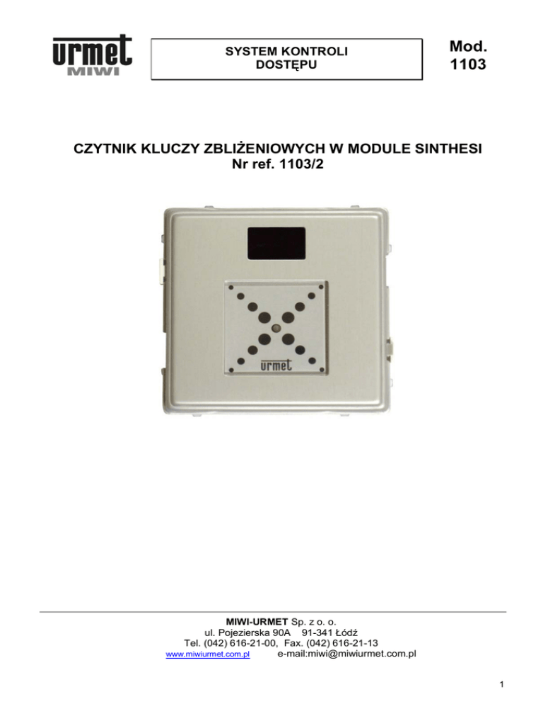 SYSTEM KONTROLI DOSTĘPU Mod. 1103 CZYTNIK KLUCZY ZBLIŻENIOWYCH W MODULE SINTHESI Nr ref. 1103/2 MIWI-URMET Sp. z o. o. ul. Pojezierska 90A 91-341 Łódź Tel. (042) 616-21-00, Fax. (042) 616-21-13 www.miwiurmet.com.pl e-mail:[email protected] 1 NR REF. 1103/2 SYSTEMY KONTROLI DOSTĘPU CHARAKTERYSTYKA OGÓLNA DANE TECHNICZNE CHARAKTERYSTYKA OGÓLNA Czytnik kluczy zbliżeniowych umożliwia sterowanie elektrozaczepem za pomocą specjalnych kluczy zbliżeniowych znajdujących się w polu czytnika. W module można zaprogramować max. do 500 kluczy w wersji podstawowej oraz do 2000 kluczy z zastosowaniem dodatkowej kości pamięci. Czytnik nr ref. 1103/2 wykonany jest na bazie panela SINTHESI wielkości 1 modułu. Może on być montowany jako niezależny system otwierania drzwi lub stosowany łącznie w ramach systemów domofonowych lub videodomofonowych jako dodatkowe sterowanie elektrozaczepem. Czas otwarcia drzwi jest ustawiany w przedziale od 0,5 do 99 sekund. Funkcja otwarcia drzwi może być aktywowana poprzez zbliżenie do panela klucza lub poprzez przycisk zwierny posiadający funkcję „wymuszenie otwarcia drzwi”. Czytnik może dokonywać kontroli dostępu w zależności od przedziału czasowego. Aby ta funkcja działała potrzebny jest elektroniczny zegar który by sterował stykami oznaczonymi jako „ wymuszenie otwarcia drzwi”, zwierając lub rozwierając je na czas zaprogramowany w zegarze przez użytkownika. Innymi Do zasilania modułu zamka kodowego wymagane jest napięcie 12V prądu stałego lub przemiennego. DANE TECHNICZNE Napięcie zasilania 12 Vac ± 20% lub 10,5 ÷ 15 Vdc Pobór prądu 310mA -5°C ÷ +50°C Temperatura pracy Charakterystyka wyjścia przekaźnikowego Napięcie załączane Max. 30V Prąd załączony Max. 3,5A Obciążenie Max. 40VA/25W Pojemność systemu Standard: 500 kluczy Po rozszerzeniu: 2000 kluczy OPIS ZACISKÓW POD PRZEWODY +/~ -/~ GND PS+ PSNO C NC 2 dodatni styk na napięcia stałego (DC) lub napięciowy styk zasilania przemiennego (AC), ujemny styk na napięcia stałego (DC) lub napięciowy styk zasilania przemiennego (AC), styk wspólny dla przycisków funkcji dodatkowych, styk przycisków: „wymuszenie otwarcia drzwi”, styk przycisków: „wymuszenie otwarcia drzwi”, styk przekaźnika normalnie otwarty, styk wspólny, styk przekaźnika normalnie zamknięty, MIWI-URMET Sp. z o.o. 91-341 Łódź ul. Pojezierska 90a tel. (42) 616-21-00 fax. (42) 616-21-13 PROGRAMOWANIE KLUCZY NADRZĘDNYCH INSTRUKCJA OBSŁUGI Aby uruchomić elektrozaczep (otworzyć drzwi) przy użyciu klucza zbliżeniowego należy przybliżyć zaprogramowany wcześniej klucz do pola czytnika. Wówczas trzy cyfrowy wyświetlacz pokaże typ aktywacji oraz ewentualny numer klucza, który spowodował aktywację. W zależności od rodzaju wymuszenia otwarcia drzwi wyświetlacz pokaże: 1) wymuszenie otwarcia drzwi 2) klucz niezaprogramowany 3) „nnn” numer klucza użytkownika KONFIGURACJA Urządzenie jest fabrycznie zaprogramowane do wyświetlenia numeru klucza użytkownika w trakcie otwierania drzwi, przy pomocy dwukolorowego wyświetlacza LED. Wyłączenie wyświetlacza Aby wyłączyć wyświetlacz należy przełożyć zworę JP2 z pozycji „L” w pozycję „NO”. Praca bez wyświetlania nr klucza Aby ustawić czytnik do pracy bez wyświetlania nr klucza należy przełożyć zworę JP1 z pozycji „D” w pozycję „NO”. PROGRAMOWANIE KLUCZY NADZRĘDNYCH Aby można było zaprogramować urządzenie oraz przypisać do niego klucze poszczególnych użytkowników należy zdefiniować klucz nadrzędny tzw. MASTER. Czytnik umożliwia zdefiniowanie od 1 do 3 kluczy tego typu. Z uwagi na funkcję kluczy nadrzędnych zaleca się aby były one przechowywane przez osobę zajmującą się konserwacją systemu. Aby zaprogramować klucze MASTER należy: 1) Zasilić urządzenie i sprawdzić następujące sekwencje wyświetlacza: http://www.miwiurmet.com.pl e-mail:[email protected] a) znak (test wyświetlacza); b) skrót (inicjalizacja) Dwukolorowy wyświetlacz zmieni kolor z czerwonego na zielony i powróci do koloru czerwonego, wyświetlana kropka wskazuje że urządzenie działa poprawnie (w przypadku jeśli wyświetlacz jest włączony tzn. zwora JP2 w pozycji „D”). 2) Nacisnąć jednokrotnie czerwony przycisk znajdujący się z tyłu modułu czytnika. Wówczas na wyświetlaczu pojawi się nr wersji oprogramowania: np. Znak (wersja oprogramowania); oraz znak 3) Ponownie na krótko nacisnąć przycisk w celu rozpoczęcia procedury programowania kluczy MASTER. Wyświetlacz pokaże: 4) Zbliżyć do pola wyświetlacza dowolny klucz aby nadać mu funkcję MASTER. Wówczas jedna z kresek na wyświetlaczu przemieści się z dołu do góry oraz dodatkowo urządzenie wygeneruje ciągły sygnał dźwiękowy. Aby reakcja czytnika była najbardziej efektywna należy zbliżać klucz do urządzenia powierzchnią, na której znajduje się logo firmy lub wygenerowany nr klucza. W celu potwierdzenia czy klucz został zaprogramowany jako nadrzędny należy zbliżyć go do czytnika, wówczas jedna z kresek (znajdująca się w górnej pozycji) powinna zacząć migać a urządzenie wygeneruje 3 krótkie sygnały potwierdzenia. Aby zakończyć procedurę programowania kluczy nadrzędnych i wrócić do normalnego trybu pracy należy zbliżyć do pola czytnika jeden z zaprogramowanych kluczy na czas około 7s. Po tym czasie wyświetlacz pokaże; Po kilku sekundach na wyświetlaczu powinna pojawić się migająca kropka sygnalizująca normalny tryb pracy (w przypadku jeśli wyświetlacz jest włączony tzn. zwora JP2 w pozycji „D”). 3 SYSTEMY KONTROLI DOSTĘPU NR REF. 1103/2 INSTRUKCJA OBSŁUGI NR REF. 1103/2 SYSTEMY KONTROLI DOSTĘPU PROGRAMOWANIE WCZYTYWANIE KLUCZY UŻYTKOWNIKÓW PROGRAMOWANIE Aby zainicjować programowanie należy zbliżyć i przytrzymać dowolny klucz nadrzędny (MASTER) do pola czytnika. Wyświetlacz po tej operacji pokaże kilka trybów programowania jeden po drugim. A