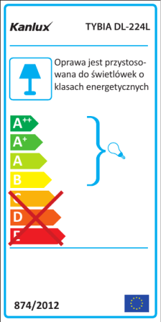 TYBIA DL-224L Oprawa jest przystosowana do świetlówek o klasach energetycznych A++ A+ A B C D E C 874/2012
