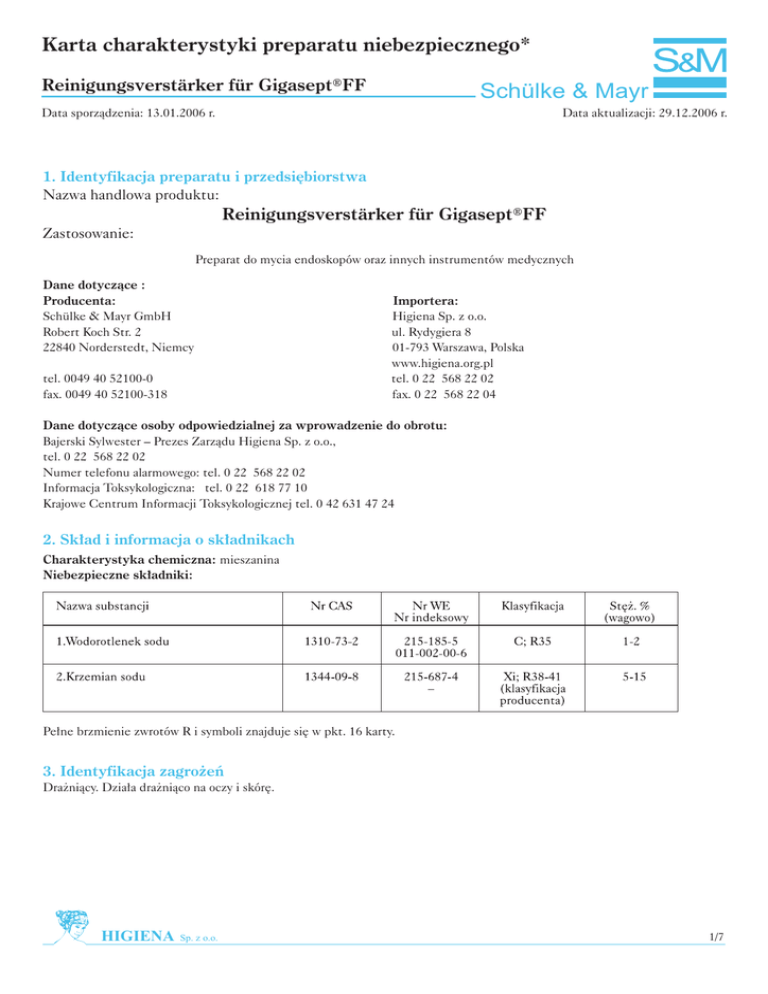 Karta charakterystyki preparatu niebezpiecznego* Schülke & Mayr Reinigungsverstärker für Gigasept®FF Data sporz¹dzenia: 13.01.2006 r. Data aktualizacji: 29.12.2006 r. 1. Identyfikacja preparatu i przedsiêbiorstwa Nazwa handlowa produktu: Reinigungsverstärker für Gigasept®FF Zastosowanie: Preparat do mycia endoskopów oraz innych instrumentów medycznych Dane dotycz¹ce : Producenta: Schülke & Mayr GmbH Robert Koch Str. 2 22840 Norderstedt, Niemcy tel. 0049 40 52100-0 fax. 0049 40 52100-318 Importera: Higiena Sp. z o.o. ul. Rydygiera 8 01-793 Warszawa, Polska www.higiena.org.pl tel. 0 22 568 22 02 fax. 0 22 568 22 04 Dane dotycz¹ce osoby odpowiedzialnej za wprowadzenie do obrotu: Bajerski Sylwester – Prezes Zarz¹du Higiena Sp. z o.o., tel. 0 22 568 22 02 Numer telefonu alarmowego: tel. 0 22 568 22 02 Informacja Toksykologiczna: tel. 0 22 618 77 10 Krajowe Centrum Informacji Toksykologicznej tel. 0 42 631 47 24 2. Sk³ad i informacja o sk³adnikach Charakterystyka chemiczna: mieszanina Niebezpieczne sk³adniki: Pe³ne brzmienie zwrotów R i symboli znajduje siê w pkt. 16 karty. 3. Identyfikacja zagro¿eñ Dra¿ni¹cy. Dzia³a dra¿ni¹co na oczy i skórê. HIGIENA Sp. z o.o. 1/7 Karta charakterystyki preparatu niebezpiecznego* Reinigungsverstärker für Gigasept®FF Data sporz¹dzenia: 13.01.2006 r. Schülke & Mayr Data aktualizacji: 29.12.2006 r. 3. Identyfikacja zagro¿eñ Dra¿ni¹cy. Dzia³a dra¿ni¹co na oczy i skórê. 4. Pierwsza pomoc Wskazówki ogólne: W przypadku awarii lub z³ego samopoczucia nale¿y skonsultowaæ siê z lekarzem. Kontakt ze skór¹: Natychmiast zdj¹æ zanieczyszczon¹ odzie¿. Natychmiast przemyæ skórê du¿¹ iloœci¹ wody. Jeœli wystêpuj¹ objawy podra¿nienia, skontaktowaæ siê z lekarzem. Kontakt z oczami: Natychmiast p³ukaæ oczy du¿¹ iloœci¹ wody, przez co najmniej 10 minut przy odwiniêtych powiekach (wyj¹æ szk³a kontaktowe). Unikaæ silnego strumienia wody ze wzglêdu na ryzyko mechanicznego uszkodzenia rogówki. Jeœli objawy podra¿nienia utrzymuj¹ siê, skontaktowaæ siê z lekarzem. Drogi oddechowe: W przypadku wyst¹pienia objawów zatrucia wynieœæ poszkodowanego na œwie¿e powietrze, zapewniæ spokój, chroniæ przed utrat¹ ciep³a. Po po³kniêciu: W przypadku po³kniêcia skontaktowaæ siê z lekarzem. 5. Postêpowanie w przypadku po¿aru Odpowiednie œrodki gaœnicze: Woda, proszki i piany gaœnicze, dwutlenek wêgla. Œrodki gaœnicze, których nie wolno u¿ywaæ ze wzglêdów bezpieczeñstwa: Nieznane. Szczególne zagro¿enia: Nieznane. Niebezpieczne produkty rozk³adu: Nie okreœlono. Specjalne wyposa¿enie ochronne dla stra¿aków: W wysokich temperaturach mog¹ powstawaæ substancje szkodliwe dla zdrowia. Na³o¿yæ odzie¿ ochronn¹ gazoszczeln¹ i aparat izoluj¹cy drogi oddechowe. Inne informacje: Nie dopuœciæ do przedostania siê œrodków gaœniczych do kanalizacji i cieków wodnych. Zawiadomiæ otoczenie o po¿arze. Usun¹æ z obszaru zagro¿enia wszystkie osoby niebior¹ce udzia³u w likwidowaniu po¿aru. Powiadomiæ Pañstwow¹ Stra¿ Po¿arn¹, a w razie koniecznoœci tak¿e Policjê Pañstwow¹, najbli¿sze w³adze terenowe i najbli¿sz¹ jednostkê Ratownictwa Chemicznego. 6. Postêpowanie w przypadku niezamierzonego uwolnienia do œrodowiska. Indywidualne œrodki ostro¿noœci: Stosowaæ œrodki ochrony indywidualnej jak podano w punkcie 8. Œrodki ostro¿noœci w zakresie ochrony œrodowiska: W razie awarii nie dopuszczaæ do zrzutów do œrodowiska. Zabezpieczyæ produkt przed przedostaniem siê do kana³ów œciekowych, wód gruntowych, gleby. Próbowaæ zebraæ jak tylko to mo¿liwe, do odpowiednich pojemników celem dalszej utylizacji. Metody oczyszczania: Ma³e iloœci rozlanej cieczy usuwaæ przy pomocy materia³ów ch³onnych (we³niane lub bawe³niane tkaniny); du¿e iloœci rozlanego preparatu pokryæ materia³em absorbuj¹cym (piasek, trociny, uniwersalne œrodki wi¹¿¹ce), starannie zebraæ i umieœciæ w odpowiednim, dobrze oznakowanym pojemniku na odpady. 7. Postêpowanie z preparatem oraz jego magazynowanie. Postêpowanie z preparatem: Podczas stosowania nie jeœæ, nie piæ, nie paliæ tytoniu. Przestrzegaæ zasad higieny osobistej. Stosowaæ œrodki ochrony indywidualnej (jak podano w punkcie 8). Pracowaæ w dobrze wentylowanych pomieszczeniach. Nie u¿ywaæ zanieczyszczonych, pustych opakowañ do innych celów. Przy sporz¹dzaniu roztworów preparatu nale¿y korzystaæ z instrukcji do³¹czonej do koncentratu. Roztwór roboczy zu¿yæ jak najszybciej. Nie magazynowaæ roztworów roboczych. Zabezpieczenia przed po¿arem i wybuchem: Nie s¹ wymagane. Produkt nie jest klasyfikowany jako ³atwo palny. Magazynowanie: Przechowywaæ zawsze w oryginalnych opakowaniach. Opakowania przechowywaæ szczelnie zamkniête. Preparat magazynowaæ w temperaturze pokojowej, w miejscach suchych, dobrze wentylowanych. Nie eksponowaæ preparatu na dzia³anie promieni s³onecznych. Chroniæ przed zamarzaniem. Nie przechowywaæ razem ze œrodkami spo¿ywczymi. Przechowywaæ z dala od kwasów. HIGIENA Sp. z o.o. 2/7 Karta charakterystyki preparatu niebezpiecznego* Reinigungsverstärker für Gigasept®FF Data sporz¹dzenia: 13.01.2006 r. Schülke & Mayr Data aktualizacji: 29.12.2006 r. 8. Kontrola nara¿enia i œrodki ochrony indywidualnej Wskazówki dodatkowe odnoœnie wymogów stawianych urz¹dzeniom technicznym: Zapewniæ skuteczn¹ wentylacjê, aby utrzymywaæ emisjê poni¿ej dopuszczalnych stê¿eñ. Je¿eli wentylacja wywiewna nie jest wystarczaj¹ca, stosowaæ odpowiednie ochrony indywidualne uk³adu oddechowego. Substancje szkodliwe, wartoœci najwy¿szych dopuszczalnych stê¿eñ, które nale¿y kontrolowaæ: Wskazówki dodatkowe: Rozporz¹dzenie MPiPS (DzU nr 217/2002, poz.1833, zm. DzU nr 212/2005, poz. 1769); rozporz¹dzenie RM (DzU nr 114/1996, poz. 545) wraz z póŸniejszymi zmianami. Oznaczanie w powietrzu na stanowiskach pracy: Rozporz¹dzenie MZ (DzU nr 73/2005, poz. 645). PN-EN