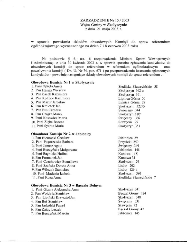 ZARZĄDZENIE Nr 15 / 2003 Wójta Gminy w Skołyszynie z dnia 21 maja 2003 r. w sprawie powołania składów obwodowych Komisji do spraw referendum ogólnokrajowego wyznaczonego na dzień 7 i 8 czerwca 2003 roku Na podstawie § 6, ust. 6 rozporządzenia Ministra Spraw Wewnętrznych i Administracji z dnia 30 kwietnia 2003 r. w sprawie sposobu zgłaszania kandydatów do obwodowych komisji do spraw referendum w referendum ogólnokrajowym oraz powoływania komisji ( Dz. U. Nr 74, póz. 671 ) po przeprowadzeniu losowania zgłoszonych kandydatów - powołuję następujące składy obwodowych komisji do spraw referendum . Obwodowa Komisja Nr l w Skołyszynie 1. Pani Opięła Aneta 2. Pan Hasiak Wiesław 3. Pan Łacek Kazimierz 4. Pan Kędzior Kazimierz 5. Pan Mazur Jarosław 6. Pan Kmiotek Jan 7. Pan Buś Czesław 8. Pan Czajka Marek 9. Pani Kasowicz Maria 10. Pani Zięba Bożena 11. Pani Sychta Maria Siedliska Sławęcińskie 58 Skołyszyn 162 a Skołyszyn 161 Lipnica Górna 50 Lipnica Górna 28 Skołyszyn 322/5 Święcany 344 Skołyszyn 197 Święcany 366 Sławęcin 79 Skołyszyn 353 Obwodowa Komisja Nr 2 w Jabłonicy 1. Pan Biernacki Czesław 2. Pani Pogorzelska Barbara 3. Pani Janusz Agata 4. Pani Buczyńska Małgorzata 5. Pani Bagnicka Halina 6. Pan Furmanek Jan 7. Pani Czechowicz Bogusława 8. Pani Szańska Dorota Anna 9. Pan Wilczak Stanisław 10. Pani Maduzia Izabela 11. Pani Koza Anna Jabłonica 29 Przysieki 250 Święcany 349 Jabłonica 146 Kunowa 115 Kunowa 31 Skołyszyn 29 Lisów 202 Lisów 129 a Skołyszyn 380 Siedliska Sławęcińskie 7 Obwodowa Komisja Nr 3 w Bączalu Dolnym 1. Pani Gizara Aleksandra Anna 2. Pan Wojdyła Stanisław 3. Pan Lipiński Krzysztof Jan 4. Pan Buś Stanisław 5. Pan Jaskólski Paweł 6. Pan Zając Leszek 7. Pan Buczyński Marcin Skołyszyn 341 Bączal Górny 124 Skołyszyn 348 Święcany 531 Sławęcin 72 Bączal Górny 47 Jabłonica 146 8. Pani Furmanek Agata 9. Pan Grzywacz Lesław 10. Pan Zwoliński Stanisław 11. Pani Okarma Grażyna Lisów 58 Bączal Dolny 164 Bączal Dolny 47 Skołyszyn 345 Obwodowa Komisja Nr 4 w Przysiekach 1. Pani Kędzior Aneta 2. Pan Hajnosz Szymon 3. Pan Wilczak Rafał 4. Pan Pawluś Marek 5. Pan Musiał Janusz 6. Pani Opięła Marzena 7. Pan Firak Jan 8. Pan Panek Wiesław 9. Pan Barzyk Czesław 10. Pan Kołodziej Marcin 11. Pan Drozdowicz Sławomir Siepietnica 63 Skołyszyn 120 Lisów 129 a Przysieki 361 Przysieki 102 Siedliska Sławęcińskie 58 Skołyszyn 201 Przysieki 296 Przysieki 233 Skołyszyn 254 a Skołyszyn 322715 Obwodowa Komisja Nr 5 w Harklowej 1. Pani Gajewska Iwona 2. Pan Kurowski Stanisław 3. Pan Słowik Adam 4. Pani Hasiak Edyta 5. Pan Maczuga Ryszard 6. Pani Jasion Ewa 7. Pani Kopacz Renata 8. Pani Piróg Maria 9. Pan Maduzia Piotr 10. Pani Lichota Lilia 11. Pani Gołosińska Urszula Harklowa 282 Lisów 69 Święcany 233 Skołyszyn 162 a Pusta Wola 39 Harklowa 164 Przysieki 176 Harklowa 444 Skołyszyn 380 Jabłonica 56 Harklowa 480 Obwodowa Komisja Nr 6 w Święcanach 1. Pan Kozioł Krzysztof Jan 2. Pani Korneusz Marta 3. Pani Gawłowicz Dorota 4. Pan Hajnosz Piotr 5. Pani Mucha Elżbieta 6. Pan Kozioł Łukasz 7. Pani Furman Elżbieta 8. Pan Radliński Krzysztof Jerzy 9. Pani Kędzior Anna 10. Pan Bławat Łukasz 11. Pan Zabawa Józef Święcany 482 a Święcany 101 Święcany 347 Skołyszyn 120 Święcany 4 A Święcany 290 Święcany 478 a Skołyszyn 348 a Święcany 325 Skołyszyn 195 Skołyszyn 182 Obwodowa Komisja Nr 7 w Lipnicy Górnej 1. Pani Biernacka Alina 2. Pani Bylinowska Magdalena 3. Pan Piątek Sławomir 4. Pan Czechowicz Tomasz 5. Pan Filipak Czesław Skołyszyn 334 Jabłonica 78 Lipnica Górna 55 Skołyszyn 29 Jabłonica 142 6. Pani Kędzior Jolanta 7. Pan Korneusz Edward 8. Pani Hajduk Agnieszka 9. Pan Marszałek Michał 10. Pani Woźniak Dorota 11. Pani Szutkowska Janina Lipnica Górna 50 Święcany 347 Skołyszyn 171 Lipnica Górna 53 Sławęcin 33 Jasło ul. Kopernika 12/60 Obwodowa Komisja Nr 8 w Lisowie 1. Pan Szański Grzegorz Piotr 2. Pan Zięba Krzysztof 3. Pani Misiołek Marta 4. Pan Ciekielski Zdzisław 5. Pani Wenc Krystyna 6. Pani Janusz Małgorzata 7. Pan Gawłowicz Marian 8. Pani Dziedzic Emilia 9. Pani Wilczak Marzena 10. Pan Krawczyk Bogusław 11. Pani Zięba Krystyna Lisów 202 Lisów 56 Skołyszyn 317 Lisów 163 Święcany 349 Lisów 29 Święcany 347 Lisów 135 Lisów 129 a Kunowa 136 Skołyszyn 322/1 Obwodowa Komisja Wyborcza Nr 9 w Siepietnicy 1. Pani Jeleń Grażyna 2. Pan Zabawa Grzegorz 3. Pan Skuba Tomasz 4. Pan Bochenek Jan 5. Pani Misiołek Grażyna 6. Pani Myśliwiec Aneta 7. Pani Furmanek Helena 8. Pan Gubernat Wacław 9. Pani Wójcikiewicz Agata 10. Pani Słowik Anna 11. Pani Zając Teresa Harklowa 356 Skołyszyn 182 Harklowa 136 A Siepietnica 60 Skołyszyn 317 Siepietnica 108 Skołyszyn 33 Siepietnica 104 Siepietnica 68 Przysieki 180 Skołyszyn 186 Obwodowa Komisja Wyborcza Nr 10 w Kunowej 1. Pani Kurowska Joanna 2. Pan Hasiak Hubert 3. Pani Wróżek Krystyna 4. Pani Misiołek Magdalena 5. Pan Bochenek Szczepan 6. Pan Dziedzic Piotr 7. Pan Pietrowski Robert 8. Pan Kołodziej Stanisław 9. Pan Szpak Bogdan 10. Pan Bagnicki Krzysztof 11. Pani Zięba Krystyna Lisów 69 Skołyszyn 162 a Kunowa 15 Skołyszyn 317 Siepietnica 60 Harklowa 437 Lisów 135 Skołyszyn 134 Skołyszyn 419 Kunowa 115 Harklowa 294 a