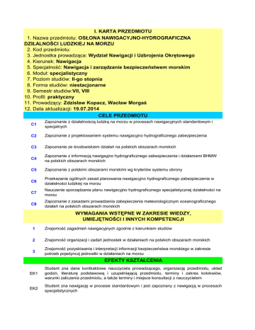 I. KARTA PRZEDMIOTU 1. Nazwa przedmiotu: OSŁONA NAWIGACYJNO-HYDROGRAFICZNA DZIŁALNOŚCI LUDZKIEJ NA MORZU 2. Kod przedmiotu: 3. Jednostka prowadząca: Wydział Nawigacji i Uzbrojenia Okrętowego 4. Kierunek: Nawigacja 5. Specjalność: Nawigacja i zarządzanie bezpieczeństwem morskim 6. Moduł: specjalistyczny 7. Poziom studiów: II-go stopnia 8. Forma studiów: niestacjonarne 9. Semestr studiów:VII, VIII 10. Profil: praktyczny 11. Prowadzący: Zdzisław Kopacz, Wacław Morgaś 12. Data aktualizacji: 19.07.2014 CELE PRZEDMIOTU C1 Zapoznanie z działalnością ludzką na morzu w procesach nawigacyjnych standardowym i specjalnych C2 Zapoznanie z projektowaniem systemu nawigacyjno hydrograficznego zabezpieczenia C3 Zapoznanie ze środowiskiem działań na polskich obszarach morskich C4 Zapoznanie z informacją nawigayjno hydrograficznego zabezpieczenia i działaniami BHMW na polskich obszarach morskich C5 Zapoznanie z polskimi obszarami morskimi wg kryteriów systemu obrony C6 Przekazanie ogólnych zasad planowania nawigacyjno hydrograficznego zabezpieczenia w działalności ludzkiej na morzu C7 Nauczenie sporządzania planu nawigacyjno hydrograficznego specjalistycznej działalności na morzu C8 Zapoznanie z zasadami prowadzenia zabepieczenia meteorologicznym oceanograficznego działań na polskich obszarach morskich WYMAGANIA WSTĘPNE W ZAKRESIE WIEDZY, UMIEJĘTNOŚCI I INNYCH KOMPETENCJI 1 Znajomość zagadnień nawigacyjnych zgodnie z kierunkiem studiów 2 Znajomość organizacji i zadań jednostek w działaniach na polskich obszarach morskich 3 Znajomość pozyskiwania i interpretacji informacji bezpieczeństwa morskiego w zakresie potrzeb pojedynczj jednostki w działaniach na morzu EFEKTY KSZTAŁCENIA EK1 Student zna dane kontkaktowe nauczyciela prowadzącego, organizację przedmiotu, układ godzin, literaturę podstawową i uzupełniającą przedmiotu, terminy i zakres kolokwiów, warunki zaliczenia przedmiotu, a także terminy i miejsce konsultacji z nauczycielem EK2 Student zna nawigację w procesie standardowym i jest zapoznany z nawigacją w procesach specjalistycznych EK3 Student zna zasady projektowania systemów nawigacyjno hydrograficznego zabezpieczenia w procesach nawigacyjnych EK4 Student zna przeznaczenie grup informacji nawigacyjnych i hydrograficznych oraz sposoby ich pozyskiwania dla potrzeb działań jednostek na polskich obszarach morskich EK5 Student zna zasady obrony na polskich obszarach morskich i potrzeby informacji nawigacyjnych dla działań obronnych EK6 Student zna zasady stosowania informacji z Planu Nawigacyjno Hydrograficznego w działaniach jednostek na polskich obszarach morskich EK7 Student umie sporządzać Plan Nawigacyjno Hydrograficznych specjalistycznej działalności na polskich obszarach morskich EK8 Student zna metody pozyskiwania informacji meterologicznych i oceanograficznych w działaniach jednostek na polskich obszarach morskich STRUKTURA PRZEDMIOTU Forma zajęćwykłady Liczba godzin Forma zajęććwiczenia Liczba godzin EK1 W1 2 EK2 W2 1 EK3 W3 2 C1 2 EK4 W4 1 EK5 W5 2 C2 2 EK6 W6 1 C3 2 EK7 W7 1 C4 4 EK8 W8 2 C5 2 Suma godzin 12 Forma zajęćlaboratoria Liczba godzin 12 0 TREŚCI PROGRAMOWE W1 Zajęcia wprowadzające, przedstawienie się nauczyciela akademickiego. Informacja o miejscu i znaczeniu przedmiotu Nawigacyjno Hydrograficzne Zabezpieczenie Działań Bojowych w kształtowaniu przyszłych oficerów okrętowych. Przedstawienie celów i struktury przedmiotu, zasady oceny i kontroli postępów studentów. Podanie literatury podstawowej i uzpełniającej przedmiotu. W2 Nawigacyjno hydrograficzne zabezpieczenie standrdowego procesu nawigacyjnego . Nawigacyjno hydrograficzne zabezpieczenie specjalnego procesu nawigacyjnego. Projektowanie systemu nawigacyjno hydrograficznego zabezpieczenia dla zapewnienia bezpieczeństwa morskiego. W3 Charakterystyka działań jednostek na polskich obszarach morskich - charakterystyka środowiska nawigacyjnego (geograficzno - fizyczna, prawne i operacyjne). Rodzaje działań na morzu. C1 Operacowanie charakterystyki nawigacyjno hydrograficznej polskich obszarów morskich dla potrzeb prac specjalnych. W4 BHMW. Rola i główne zadania. Infoormacje nawigacyjne i hydrograficzne w systemie nawigacyjno hydrograficznym na polskich obszarach morskich. Zdania BHMW jako służby państwowej. W5 Podział polskich obszarów morskich wg kryterów działań obronnych. C2 Wytyczenie charakterystki topograficznej i hydrograficznej obszarów dogodnych dla działań przeciwnika na polskich obszarów morskich. W6 Ogólne zasady planowania nawigayjno hydrograficznego zabezpieczenia w działaniach jednostek. Metodyka projektowania , organizacja dokumentacji. C3 Projekt organizacji zespołu projektującego nawigacyjno hydrograficzne zabezpieczenie. W7 Nawigacyjno hydrograficzne zabezpieczenie specjalistycznej dziłalnosci na polskich obszarach morskich. C4 Wykonanie obliczeń elementów specjalistycznej działaności dla zadanego akwenu. W8 Zasady ogólne prowadzenia zabezpieczenia meteorologiczno oceanograficznego na polskich obszarach morskich. C5 Wykonanie projektu zabezpieczenia meteorologiczno oceanograficznego dla wybranego rodzaju działalności jednostek na polskich obszarach morskich. L9 Kolokwium. NARZĘDZIA DYDAKTYCZNE 1 Notebook z projektorem 2 Rzutnik światła dziennego i foliogramy 3 Tablica i kolorowe pisaki 4 Tablice nawigacyjne 5 Kalkulatory 6 Mapy morskie i przyrządy nawigacyjne SPOSOBY OCENY (F-FORMUJĄCA, P-PODSUMOWUJĄCA) F1 Indywidualne sprawozdania z ćwiczeń 1 do 5 P2 Kolokwium W1 do W8 OBCIĄŻENIE PRACĄ STUDENTA Średnia liczba godzin na zrealizowanie aktywności Forma aktywności semestr VII VIII razem Godziny kontaktowe z nauczycielem 12 12 24 Przygotowanie się do wykładów i ćwiczeń 18 26 44 Samodzielne opracowanie zagadnień 18 26 44 Rozwiązywanie zadań domowych 6 6 12 SUMA GODZIN W SEMESTRZE 54 70 r.a 124 PUNKTY ECTS W SEMESTRZE 3 4 r.a 7 LITERATURA PODSTAWOWA I UZUPEŁNIAJĄCĄ 1
