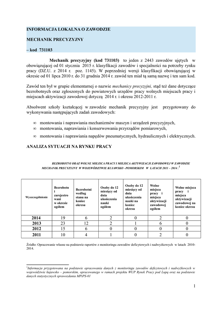 INFORMACJA LOKALNA O ZAWODZIE MECHANIK PRECYZYJNY – kod 731103 Mechanik precyzyjny (kod 731103) to jeden z 2443 zawodów ujętych w obowiązującej od 01 stycznia 2015 r. klasyfikacji zawodów i specjalności na potrzeby rynku pracy (DZ.U. z 2014 r. poz. 1145). W poprzedniej wersji klasyfikacji obowiązującej w okresie od 01 lipca 2010 r. do 31 grudnia 2014 r. zawód ten miał tą samą nazwę i ten sam kod. Zawód ten był w grupie elementarnej o nazwie mechanicy precyzyjni, stąd też dane dotyczące bezrobotnych oraz zgłoszonych do powiatowych urzędów pracy wolnych miejscach pracy i miejscach aktywizacji zawodowej dotyczą 2014 r. i okresu 2012-2011 r. Absolwent szkoły kształcącej w zawodzie mechanik precyzyjny jest wykonywania następujących zadań zawodowych: przygotowany do • • montowania i naprawiania mechanizmów maszyn i urządzeń precyzyjnych, montowania, naprawiania i konserwowania przyrządów pomiarowych, • montowania i naprawiania napędów pneumatycznych, hydraulicznych i elektrycznych. ANALIZA SYTUACJI NA RYNKU PRACY BEZROBOTNI ORAZ WOLNE MIEJSCA PRACY I MIEJSCA AKTYWIZACJI ZAWODOWEJ W ZAWODZIE MECHANIK PRECYZYJNY W WOJEWÓDZTWIE KUJAWSKO –POMORSKIM W LATACH 2011 – 2014 . Wyszczególnienie 2014 2013 2012 2011 Bezrobotn i zarejestro wani w okresie ogółem 19 23 15 10 Bezrobotni według stanu na koniec okresu 6 12 6 4 Osoby do 12 miesięcy od dnia ukończenia nauki ogółem 2 2 0 1 Osoby do 12 miesięcy od dnia ukończenia nauki na koniec okresu 0 1 0 0 Wolne miejsca pracy i miejsca aktywizacji zawodowej ogółem 2 6 0 2 1 Wolne miejsca pracy i miejsca aktywizacji zawodowej na koniec okresu 0 0 0 0 Źródło: Opracowanie własne na podstawie raportów z monitoringu zawodów deficytowych i nadwyżkowych w latach 20102014. 1 Informacja przygotowana na podstawie opracowania danych z monitoringu zawodów deficytowych i nadwyżkowych w województwie kujawsko – pomorskim, opracowanego w ramach projektu WUP Rynek Pracy pod Lupą oraz na podstawie danych statystycznych sprawozdania MPiPS-01 1 W 2014 roku na 1 ofertę pracy przypadało 9,5 bezrobotnych zarejestrowanych w okresie, w 2013 roku na 1 ofertę pracy przypadało 3,8 bezrobotnych zarejestrowanych w okresie, w 2012 roku – brak ofert pracy, w 2011 roku 5 bezrobotnych. Większa liczba nowych rejestracji bezrobotnych niż zgłoszonych wolnych miejsc pracy lub aktywizacji zawodowej spowodowała, że w 2014 roku oraz w latach 2011 – 2013 zawód ten został sklasyfikowany jako zawód nadwyżkowy, tzn. taki, na który na rynku pracy istnieje mniejsze zapotrzebowanie niż liczba osób poszukujących pracy w tym zawodzie.2 BEZROBOTNI ORAZ WOLNE MIEJSCA AKTYWIZACJI ZAWODOWEJ W ZAWODZIE MECHANIK PRECYZYJNY W 2014R. WEDŁUG POWIATÓW MECHANIK PRECYZYJNY Powiat Bezrobotni nowozarejestrowani w 2014r. Województwo kujawskopomorskie Wolne miejsca pracy i miejsca aktywizacji zawodowej zgłoszone w 2014r. 19 Bydgoszcz grodzki 8 Bydgoszcz ziemski 1 Grudziądz grodzki 0 Grudziądz ziemski 0 Toruń grodzki 2 Toruń ziemski 2 Włocławek grodzki 0 Włocławek ziemski 0 Aleksandrów Kujawski 1 Brodnica 2 Chełmno 1 Golub-Dobrzyń 0 Inowrocław 0 Lipno 1 Mogilno 0 Nakło nad Notecią 1 Radziejów 0 Rypin 0 Sępólno Krajeńskie 0 Świecie 0 Tuchola 0 Wąbrzeźno 0 Żnin 0 Źródło: Załącznik 3 do Sprawozdania MPiPS-01 o rynku pracy Bezrobotni wg stanu w dniu 31.12.2014r. 2 6 0 0 0 0 0 0 0 0 0 0 0 0 1 0 0 1 0 0 0 0 0 0 0 3 1 0 0 1 0 0 0 0 0 1 0 0 0 0 0 0 0 0 0 0 0 0 2 Podziału na zawody deficytowe, zrównoważone i nadwyżkowe dokonuje się na podstawie wskaźnika intensywności nadwyżki (deficytu) wyrażonego jako iloraz liczby zgłoszonych wolnych miejsc pracy i miejsc aktywizacji zawodowej w badanym okresie, w danym zawodzie i liczby zarejestrowanych bezrobotnych w badanym okresie, w danym zawodzie. Zawody deficytowe to takie, dla których wskaźnik przekracza wartość 1,1; zawody zrównoważone to te, dla których wartość wskaźnika mieści się w przedziale od 0,9 do 1,1; natomiast zawody nadwyżkowe to te, w których przypadku wskaźnik wynosi poniżej 0,9. 2 WYNIKI BADAŃ PRACODAWCÓW W badaniach zrealizowanych w latach 2011-2014 pracodawcy nie zgłosili planowanego zwiększenia ani zmniejszenia zatrudnienia osób w zawodzie mechanik precyzyjny . 3 ANALIZA KSZTAŁCENIA W ZAWODZIE, OFERTA KSZTAŁCENIA – SYSTEM OŚWIATY SZKOLNEJ I POZASZKOLNEJ Wg danych pochodzących z Systemu Informacji Oświatowej udostępnionych przez Centrum Informatyczne Edukacji na stronie www.cie.men.gov.pl w województwie kujawskopomorskim zawód mechanik precyzyjny można zdobyć w jednej zasadniczej szkole zawodowej . LICZBA UCZNIÓW KONTYNUUJĄCYCH NAUKĘ W ZAWODZIE MECHANIK PRECYZYJNY W WOJEWÓDZTWIE KUJAWSKO – POMORSKIM W LATACH 2011-2014 30 26 25 20 18 15 10 8 5 0 2013 2012 2011 3 Badanie 2000 pracodawców jest realizowane w ramach projektu WUP Rynek Pracy pod Lupą. Raporty z badań pracodawców zrealizowanych w latach 2010 – 2013 znajdują się na stronie www.podlupa.wup.torun.pl. 3 LICZBA ABSOLWENTÓW W ZAWODZIE MECHANIK PRECYZYJNY W WOJEWÓDZTWIE KUJAWSKO – POMORSKIM W LATACH SZKOLNYCH 2010/2011 – 2012/2013 18 16 16 14 12 10 8 9 7 6 4 2 0 2013 2012 2011 Rozporządzenie Ministra Edukacji Narodowej z dnia 23 grudnia 2011 roku w sprawie klasyfikacji zawodów szkolnictwa zawodowego ( Dz. U. z 2012 poz.7 z późn. zm.) określa, że zawód mechanik precyzyjny od 1 września 2012 roku można zdobyć w zasadniczej szkole zawodowej oraz na kursie kwalifikacyjnym. Dla zawodu mechanik precyzyjny wyodrębniono następującą kwalifikację: • montaż i naprawa maszyn i urządzeń precyzyjnych. Powiatowe urzędy pracy w województwie kujawsko-pomorskim na 2011 rok zaplanowały zorganizowanie 5 szkoleń związanych z zawodem mechanik precyzyjny. Szkolenia w tym zakresie dotyczą głównie: mechaniki urządzeń chłodniczych, klimatyzacyjnych . 4 Natomiast w roku 2013 Powiatowe urzędy pracy jak i instytucje szkoleniowe nie pla