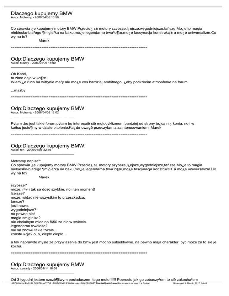Dlaczego kupujemy BMW Autor: Motramp - 2006/04/06 10:50 _____________________________________ Co sprawia ¿e kupujemy motory BMW.Przecie¿ s± motory szybsze,l¿ejsze,wygodniejsze,tañsze.Mo¿e to magia niebiesko-bia³ego ¶migie³ka na baku,mo¿e legendarna trwa³o¶æ,mo¿e fascynacja konstrukcj± a mo¿e uniwersalizm.Co wy na to? Marek ============================================================================ Odp:Dlaczego kupujemy BMW Autor: Mazby - 2006/04/06 11:00 _____________________________________ Oh Karol, ta zima daje w ko¶æ. Wiem,¿e ruch na witrynie ma³y ale mo¿e cos bardziej ambitnego, ¿eby podkrêciæ atmosferke na forum. ...mazby ============================================================================ Odp:Dlaczego kupujemy BMW Autor: Motramp - 2006/04/06 12:02 _____________________________________ Pytam ,bo jest takie forum.pytam bo interesujê siê motocyklizmem bardziej od strony je¿ca ni¿ konia, no i w koñcu jeste¶my w dziale pitolenie.Ka¿d± uwagê przeczytam z zainteresowaniem. Marek ============================================================================ Odp:Dlaczego kupujemy BMW Autor: ron - 2006/04/06 22:19 _____________________________________ Motramp napisa³: Co sprawia ¿e kupujemy motory BMW.Przecie¿ s± motory szybsze,l¿ejsze,wygodniejsze,tañsze.Mo¿e to magia niebiesko-bia³ego ¶migie³ka na baku,mo¿e legendarna trwa³o¶æ,mo¿e fascynacja konstrukcj± a mo¿e uniwersalizm.Co wy na to? Marek szybsze? moze. r4v i tak sa dosc szybkie. no i ten moment! lzejsze? moze. widac nie wszystkim to przeszkadza. tansze? jesli nowe. wygodniejsze? na pewno nie! magia smigielka? nie chcialbym miec np f650 za nic w swiecie. legendarna trwalosc? nie sa znowu takie trwale... konstrukcja? o, o, cieplo cieplo... a tak naprawde mysle ze przywiazanie do bmw jest mocno subiektywne. na pewno maja charakter. byc moze za to sie je kocha. ============================================================================ Odp:Dlaczego kupujemy BMW Autor: czwarty - 2006/04/14 18:58 _____________________________________ Od 3 tygodni jestem szczê¶liwym posiadaczem tego moto!!!!!! Poprostu jak go zobaczy³em to siê zakocha³em ARCHIWUM FoRUM BOXER-MOTOR - MOTOCYKLE BMW sklep BOXER-PARTS.eu MamboBoard czê¶ci i akcesoria Forum Component version: 1.4 Stable Generated: 8 March, 2017, 20:41 os±d¼cie sami!!!!!!!Mokrego dyngusa!!!!!!!!!!:evil: Niestety nie ten rozmiar zdjêcia!!!:( Edytowany przez: czwarty, w: 2006.04.14 18:59 ============================================================================ Odp:Dlaczego kupujemy BMW Autor: consigliero - 2006/04/14 21:08 _____________________________________ To moje nowe cacko http://www.boxer-motor.com/components/com_mamboboard/uploaded/images/12.jpg ============================================================================ Odp:Dlaczego kupujemy BMW Autor: polarfox - 2006/04/17 11:17 _____________________________________ jak pitoöenie to pitolenie. fajnie ze jest to forum,jestem na dyzurze od 3 dni i juz mi sie bezpieczniki pala.to dobrze wtedy pomarzyc.zwlaszcza korci mnie, zeby opisac moja wyprawe z dziewczyna na Krete 2003 moze by komus tes sie zachcialo pomarzyc.. co do bemek: jezdzilem simsonem,potem mz150 i 250.hm,wtedy to byly czasy, king of the road. simsonem wokol pomorza, raz z berlina do warszawy w 12 godzin za TIR ami, zeby szybciej..plecki bolaly oj bolaly.w warszawie wtedy mozna bylo jeszcze kolezanki ze studiow zabrac na simsona..chociaz juz sie zaczynaly gorsze czasy. branie bylo od fiata 126 wzwyz.wtedy jeszcze nie bylo klopotow z parkowaniem.. MZ 250: to byl k. zajeb,zle wywazone, probowalo wywalic na zakretach.ale jak sie przesiadlem z simsona to na mztce na myslalem ze mnie zwieje z kanapy.(ale tylko za 1 razem) znowu king of ther road.. w skalki czestochowskie z kumplem na mztce: pelny sprzet , moto przeladowane a my 140 na godzine( no, powiedzmy 120) a ja sie dziwilem,ze pali 14 litrow.. w niemczech kupilem Yamahe Diversion 900. o, znowu ten king.. ciezkie to, pilo duzo- 8 do 9, ale wygodne, 6 lat tym pojezdzilem.opony musialem wymieniac co 10 000, bo darly sie,a ja jezdze bez jakiegois palenia gumy. wtedy zobaczylem BM ki. wydawaly mi sie drogie.raz sie skusilem zeby sie przejechac,ROADSTEREM. wrazenie bylo po mieciutkim bzyczeniu moich 4 rzedowych cylinderkow takie,jakbym lecial AN2...brr.i ten moment obrotowy, musialem kontrowac kerownica,zeby sie nie zwalic na skrzazowaniu ;-) stanowczo nie.,nie podobalo mi sie. ale nadal mnie intrygowalo, dlaczego germanie tak chetnie toto kupuja. wtedy przejechalem sie GS 1150.ale sie zdziwilem, charakterystyka ,wygody i mnostwo itp-ow -wtedy zrozumialem co to za moto. potem : spalanie 5-7,potem opony- wymienilem (metzeler tourance) dopiero po 26 000 km ( nie bede tego juz robilprzerazilem sie jak w tylnym kole pokazaly sie na biezniku ..druty.. kolo nie peklo, dojechalem do domu. dwa razy lezalem: raz na gownie na krecie, raz po pijanemu ( juz dawno nie pije) wtedy moto byl bez bez gmoli (chyba tak sie w pl nazywa te dziwne rury?) mocno sie dziwilem, ze oprocz dekla na cylindrze prawie bez zadrasniec ( troche szyba, troche mocowanie kufra, ale nie widac). jakbym to wywalil Yamaha, to zaplacilbym tysiace za plastiki.. teraz mam te rury.(gmole?) mole? motto: nie pytaj CZY sie wywalisz- tylko KIEDY.. taki madrala uze mnie. teraz wiem czemu wybralem BM GS:laugh: bylem na Krecie moja BMka. pieknie bylo, wygodnie. ABS. myslalem, ze tego nigdy nie bede potrzebowac. mylilem sie: juz teraz nie chce moto bez.. ARCHIWUM FoRUM BOXER-MOTOR - MOTOCYKLE BMW sklep BOXER-PARTS.eu MamboBoard czê¶ci i akcesoria Forum Component version: 1.4 Stable Generated: 8 March, 2017, 20:41 tyle na razie, bo co tu udowadniac dawno udowodnione.. pozdronienia piotr ============================================================================ Odp:Dlaczego kupujemy BMW Autor: Irek R1100RS - 2006/04/19 22:40 _____________________________________ A zes Panie zaczal stopniowac... Szybsze -> to zale