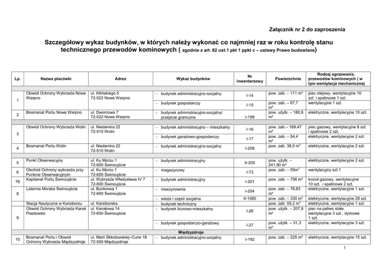 Załącznik nr 2 do zaproszenia Szczegółowy wykaz budynków, w których należy wykonać co najmniej raz w roku kontrolę stanu technicznego przewodów kominowych ( zgodnie z art. 62 ust.1 pkt 1 ppkt c – ustawy Prawo budowlane) Lp. 1 2 Nazwa placówki Obwód Ochrony Wybrzeża Nowe Warpno Bosmanat Portu Nowe Warpno Obwód Ochrony Wybrzeża Wolin 3 4 5 6 76 Adres Wykaz budynków Nr inwentarzowy − budynek administracyjno-socjalny I-14 − budynek gospodarczy I-15 ul. Dworcowa 7 72-022 Nowe Warpno − budynek administracyjno-socjalny/ przejście graniczne I-199 ul. Niedamira 22 72-510 Wolin − budynek administracyjno – mieszkalny I-16 − budynek garażowo-gospodarczy I-17 ul. Kilińskiego 5 72-022 Nowe Warpno Bosmanat Portu Wolin ul. Niedamira 22 72-510 Wolin − budynek administracyjno-socjalny I-208 Punkt Obserwacyjny ul. Ku Morzu 1 72-600 Świnoujście ul. Ku Morzu 1 72-600 Świnoujście ul. Wybrzeże Władysława IV 7 72-600 Świnoujście ul. Bunkrowa 1 72-600 Świnoujście − budynek administracyjny II-205 Obchód Ochrony wybrzeża przy Punkcie Obserwacyjnym Kapitanat Portu Świnoujście Latarnia Morska Świnoujście 8 Stacja Nautyczna w Karsiborzu Obwód Ochrony Wybrzeża Kanał Piastowski ul. Karsiborska ul. Kanałowa 14 72-600 Świnoujście − magazynowy I-73 − budynek administracyjny I-201 − maszynownia I-204 − wieża i część socjalna − budynek techniczny − budynek biurowo-mieszkalny II-1580 I-26 Powierzchnia pow. zab. – 111 m² pow. zab. – 67,7 m² pow. użytk. – 180,9 m² 10 Bosmanat Portu i Obwód Ochrony Wybrzeża Międzyzdroje ul. Marii Skłodowskiej–Curie 18 72-500 Międzyzdroje I-27 Międzyzdroje − budynek administracyjno-socjalny I-192 piec olejowy, wentylacyjne 10 szt. i spalinowe 1 szt. wentylacyjne 1 szt. elektryczne, wentylacyjne 10 szt. pow. zab.– 169,47 m² pow. zab. – 54,4 m² 2 pow. zab. 38,0 m piec gazowy, wentylacyjne 8 szt. i spalinowe 2 szt. elektryczne, wentylacyjne 2 szt. pow. użytk. – 241,90 m² 2 pow. zab. – 55m elektryczne, wentylacyjne 2 szt. pow. zab. – 756 m² kocioł gazowy, wentylacyjne 10 szt. i spalinowe 2 szt. elektryczne, wentylacyjne 1 szt. pow. zab. – 76,83 m² pow. zab. – 330 m² 2 pow. zab. 55,2 m pow. użytk. – 207,9 m² 9 − budynek gospodarczo-garażowy Rodzaj ogrzewania, przewodów kominowych ( w tym wentylacja mechaniczna) pow. użytk. – 31,3 m² pow. zab. – 225 m² elektryczne, wentylacyjne 2 szt. wentylacyjny szt.1 elektryczne, wentylacyjne 28 szt. elektryczne, wentylacyjne 1 szt. piec na paliwo stałe, wentylacyjne 3 szt., dymowe 1 szt. elektryczne, wentylacyjne 3 szt. elektryczne, wentylacyjne 15 szt. 1 − budynek warsztatowo-garażowy I-193 pow. zab. – 275 m² elektryczne, wentylacyjne 1szt. pow. zab. – 113,75 m² gazowe, wentylacyjne 3 szt. i spalinowe 1 szt. pow. zab. – 52 m² elektryczne, wentylacyjne 2 szt. pow. zab. – 142,7 m² pow. zab. – 84,0 m² pow. zab. – 92.5 m² pow. zab. – 147 m² z lokalnej kotłowni wentylacyjne 7 szt. gazowe, wentylacyjne 2 szt. spalinowe 1 szt. elektryczne, wentylacyjne 2 szt. Mrzeżyno Bosmanat Portu Mrzeżyno 11 ul. Marynarska 1 72-330 Mrzeżyno − budynek administracyjno-socjalny I-77 Kamień Pomorski 12 Bosmanat Portu Kamień Pomorski Ul. Wilków Morskich 2 72-400 Kamień Pomorski Obchód Ochrony Wybrzeża Dziwnów ul Mickiewicza 31 72-420 Dziwnów Kapitanat Portu Dziwnów Stacja Nautyczna w Dziwnowie 15 16 I-36 Dziwnów − budynek administracyjno- mieszkalny I-32 - budynek magazynowo-socjalny 13 14 - budynek biurowo-socjalny Kapitanat Portu Szczecin Biuro Spraw Obronnych Żeglugi Baza Oznakowania Nawigacyjnego Szczecin ul. Przymorze 4 72-420 Dziwnów ul. Przymorze 3 ul. Jana z Kolna 9 71-603 Szczecin ul. Ks. Sambora 4 70-232 Szczecin ul. Światowida 16 c 71-727 Szczecin I-33 − budynek warsztatowo-garażowy I-35 − budynek administracyjny I-67 - I-178 budynek techniczny Szczecin − budynek administracyjny I-202 − budynek administracyjny I-207 − budynek socjalno-warsztatowy − budynek stacji nautycznej − budynek portierni − budynek magazynowy 17 I-142 pow. zab. 414,80 2 m I-185 I-153 I-150 − budynek hali pław I-149 − budynek administracyjny 18 Kapitanat Portu Trzebież ul. Portowa 5b 72-020 Trzebież ul. Portowa 23 72-020 Trzebież − stacja szyfrów − budynek administracyjno- mieszkalny pow. zab. –132 m² pow. zab. 507,80 2 m I-186 I-146 I-200 I-11 2 pow. zab. – 869 m² I-135 − budynek administracyjno-warsztatowy − budynek biurowo-warsztatowy pow. zab. 137,6 m pow. zab. 233,15 2 m 2 pow. zab. 35,02 m 2 pow. zab. 24,90 m pow. zab. 268,00 2 m pow. zab. 812,00 2 m pow. zab. 104,00 2 m pow. zab. – 70 m² pow. zab. – 128 m² gazowe, wentylacyjne 3 szt. i spalinowe 1 szt. elektryczne, wentylacyjne 4 szt. kocioł gazowy, wentylacyjne 55 szt. i spalinowe 2 szt. miejskie, wentylacyjne 4 szt. kotłownia gazowa, wentylacyjne 14szt., spalinowe szt. 1, wentylacja wymuszona szt.1 z lokalnej kotłowni, wentylacyjne 25 szt., wentylacja wymuszona 2 szt. z lokalnej kotłowni, wentylacyjne 17 szt. elektryczne, wentylacyjne 1 szt. elektryczne, wentylacyjne 4 szt. elektryczne, wentylacyjne 12 szt. kotłownia gazowa, wentylacyjne 28 szt., spalinowe szt. 1, wentylacja wymuszona 1 szt. z lokalnej kotłowni, wentylacyjne 7 szt., elektryczne, wentylacyjne 3 szt. gazowe, wentylacyjne 4 szt. i spalinowe 1 szt. 2 Latarnia Morska Niechorze 19 ul. Portowa 5b 72-020 Trzebież − budynek sanitariatów ul. Polna 30 72-350 Niechorze − wieża i część mieszkalna − maszynownia Obwód Ochrony Wybrzeża Niechorze ul. Nadmorska 4 72-350 Niechorze ul. Grunwaldzka 2 72-346 Pobierowo gazowe, wentylacyjne 28 szt. spalinowe 1 szt. I-136 pow. zab. – 170 m² elektryczne, wentylacyjne 8 szt. wentylacja wymuszona 2 szt. pow. zab. – 293,20 m² elektryczne, wentylacyjne 6 szt. I-79 pow. zab. – 90,18 m² wentylacyjne 4 szt. I-58 pow. zab. – 73,86 m² wentylacyjne 16 szt. − budynek gospodarczo-magazynowy − sanitariaty I-80 pow