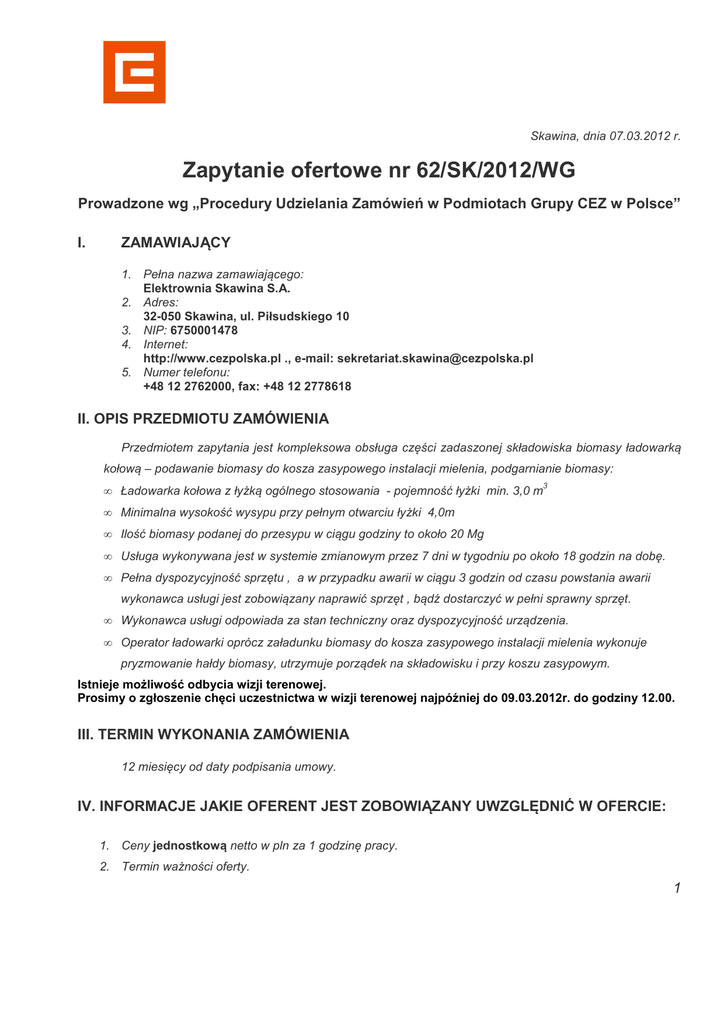 Skawina, dnia 07.03.2012 r. Zapytanie ofertowe nr 62/SK/2012/WG Prowadzone wg „Procedury Udzielania Zamówień w Podmiotach Grupy CEZ w Polsce” I. ZAMAWIAJĄCY 1. Pełna nazwa zamawiającego: Elektrownia Skawina S.A. 2. Adres: 32-050 Skawina, ul. Piłsudskiego 10 3. NIP: 6750001478 4. Internet: http://www.cezpolska.pl ., e-mail: [email protected] 5. Numer telefonu: +48 12 2762000, fax: +48 12 2778618 II. OPIS PRZEDMIOTU ZAMÓWIENIA Przedmiotem zapytania jest kompleksowa obsługa części zadaszonej składowiska biomasy ładowarką kołową – podawanie biomasy do kosza zasypowego instalacji mielenia, podgarnianie biomasy: • Ładowarka kołowa z łyżką ogólnego stosowania - pojemność łyżki min. 3,0 m 3 • Minimalna wysokość wysypu przy pełnym otwarciu łyżki 4,0m • Ilość biomasy podanej do przesypu w ciągu godziny to około 20 Mg • Usługa wykonywana jest w systemie zmianowym przez 7 dni w tygodniu po około 18 godzin na dobę. • Pełna dyspozycyjność sprzętu , a w przypadku awarii w ciągu 3 godzin od czasu powstania awarii wykonawca usługi jest zobowiązany naprawić sprzęt , bądź dostarczyć w pełni sprawny sprzęt. • Wykonawca usługi odpowiada za stan techniczny oraz dyspozycyjność urządzenia. • Operator ładowarki oprócz załadunku biomasy do kosza zasypowego instalacji mielenia wykonuje pryzmowanie hałdy biomasy, utrzymuje porządek na składowisku i przy koszu zasypowym. Istnieje możliwość odbycia wizji terenowej. Prosimy o zgłoszenie chęci uczestnictwa w wizji terenowej najpóźniej do 09.03.2012r. do godziny 12.00. III. TERMIN WYKONANIA ZAMÓWIENIA 12 miesięcy od daty podpisania umowy. IV. INFORMACJE JAKIE OFERENT JEST ZOBOWIĄZANY UWZGLĘDNIĆ W OFERCIE: 1. Ceny jednostkową netto w pln za 1 godzinę pracy. 2. Termin ważności oferty. 1 3. Dane kontaktowe osoby upoważnionej ze strony Oferenta do kontaktu z Zamawiającym. 4. Czas reakcji. 5. Rodzaj Ładowarki/pojemność łyżki. 6. Okres fakturowania – preferowany jedna faktura na miesiąc. 7. Termin płatności. 8. Podpisane oświadczenie stanowiące załącznik nr 1 do niniejszego zapytania. V. SZCZEGÓLNE WYMAGANIA W STOSUNKU DO WYKONAWSTWA: 1. Oświadczenie oferenta związane z wymaganiami w stosunku do wykonawstwa: a) Oświadczenie akceptujące postanowienia Ogólnych stanowiące załącznik nr 2 do niniejszego zapytania. Warunków Realizacji Zamówień b) Akceptacja terminu płatności wynoszącego 30 dni liczonych od daty otrzymania faktury przez Zamawiającego. VI. MIEJSCE ORAZ TERMIN SKŁADANIA OFERT 1. Oferta powinna być przesłana za pośrednictwem: poczty elektronicznej na adres wskazany [email protected], do dnia 13 marca 2012 roku. VII. SPOSÓB UDZIELANIA WYJAŚNIEŃ DOTYCZĄCYCH ZAPYTANIA OFERTOWEGO: 1. Każdy oferent ma prawo zwrócić się do zamawiającego o wyjaśnienie treści warunków zapytania ofertowego w terminie nie późniejszym niż 2 dni przed terminem składania ofert. 2. Korespondencja w toku procesu wyboru dostawcy, w tym pytania oferentów mogą mieć formę emailową. VIII. PRACOWNICY ZAMAWIAJĄCEGO KONTAKTOWANIA SIĘ Z OFERENTAMI: Imię i nazwisko: Władysław Gałgan Stanowisko służbowe: Specjalista ds. Logistyki UPRAWNIENI DO BEZPOSREDNIEGO Numer telefonu: +48 12 2778535 E-mail: [email protected] Osoba na stanowisku Specjalista ds. Logistyki posiada umocowanie do samodzielnej reprezentacji ZAMAWIAJĄCEGO i składania oświadczeń woli wymaganych trybem procedury zakupowej. 2 IX. ŚRODKI ODWOŁAWCZE: 1. Oferentom nie przysługuje prawo uczestnictwa w otwarciu ofert. 2. W postępowaniu oferentom nie przysługują żadne środki odwoławcze. X. POSTAWNOWIENIA KOŃCOWE: 1. O wyborze najkorzystniejszej oferty Zamawiający zawiadomi oferentów za pośrednictwem poczty elektronicznej (e-mail). 2. Drugi etap postępowania może zostać przeprowadzony za pomocą aukcji elektronicznej. Regulamin przeprowadzania aukcji oraz instrukcja obsługi znajduje się na stronie internetowej pod adresem: http://www.cezpolska.pl/pl/dla-dostavcow/pozostale-postepowania/aukcje- elektroniczne.html 3. Zamawiający zastrzega sobie prawo do odstąpienia bez podania przyczyny od wyboru oferty (ofert) i powierzenia komukolwiek wykonania prac objętych niniejszym zapytaniem bez prawa oferentów do dochodzenia od Zamawiającego roszczeń z odszkodowawczych. 4. Zamawiający zastrzega sobie prawo do negocjowania warunków z kilkoma dostawcami jednocześnie. 5. Oferent może przed upływem terminu składania ofert zmienić lub wycofać swoją ofertę. 6. W toku badania i oceny ofert Zamawiający może żądać od oferentów wyjaśnień dotyczących treści złożonych ofert. 7. Koszty przygotowania oferty ponosi Oferent. 8. Zamawiający, ma prawo swobodnego wyboru oferty, może przeprowadzić dodatkowe negocjacje z wybranymi oferentami, a także unieważnić postępowanie bez podania przyczyny. 9. Niniejsze zapytanie, stanowi zaproszenie dla Dostawców do wzięcia udziału w procesie składania 3 ofert w rozumieniu art. 70 § 1 k.c., mające na celu dostarczenie konkretnego produktu lub usługi. XI. ZAŁĄCZNIKI: Załącznik nr 1 – Oświadczenie oferenta. Załącznik nr 2 – Ogólne Warunki Realizacji Zamówień 3