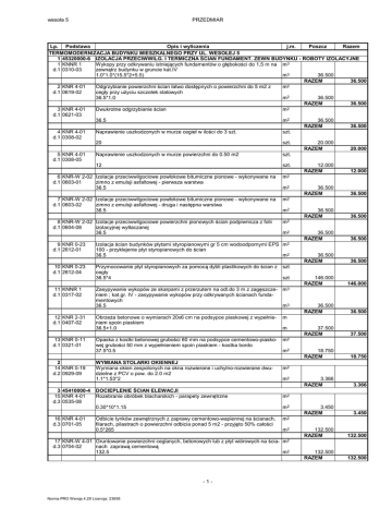 wesoła 5 PRZEDMIAR Lp. Podstawa Opis i wyliczenia j.m. Poszcz Razem TERMOMODERNIZACJA BUDYNKU MIESZKALNEGO PRZY UL. WESOŁEJ 5 1 45320000-6 IZOLACJA PRZECIWWILG. I TERMICZNA ŚCIAN FUNDAMENT. ZEWN BUDYNKU - ROBOTY IZOLACYJNE 1 KNNR 1 Wykopy przy odkrywaniu istniejących fundamentów o głębokości do 1,5 m na m3 d.1 0310-03 zewnątrz budynku w gruncie kat.IV 1.0*1.0*(15.5*2+5.5) m3 36.500 RAZEM 36.500 2 KNR 4-01 Odgrzybianie powierzchni ścian łatwo dostępnych o powierzchni do 5 m2 z m2 d.1 0619-02 cegły przy uŜyciu szczotek stalowych 36.5*1.0 m2 36.500 RAZEM 36.500 3 KNR 4-01 Dwukrotne odgrzybianie ścian m2 d.1 0621-03 36.5 m2 36.500 RAZEM 36.500 4 KNR 4-01 Naprawienie uszkodzonych w murze cegieł w ilości do 3 szt. szt. d.1 0308-02 20 szt. 20.000 RAZEM 20.000 5 KNR 4-01 Naprawienie uszkodzonych w murze powierzchni do 0.50 m2 szt. d.1 0308-05 12 szt. 12.000 RAZEM 12.000 6 KNR-W 2-02 Izolacje przeciwwilgociowe powłokowe bitumiczne pionowe - wykonywane na m2 d.1 0603-01 zimno z emulsji asfaltowej - pierwsza warstwa 36.5 m2 36.500 RAZEM 36.500 7 KNR-W 2-02 Izolacje przeciwwilgociowe powłokowe bitumiczne pionowe - wykonywane na m2 d.1 0603-02 zimno z emulsji asfaltowej - druga i następna warstwa 36.5 m2 36.500 RAZEM 36.500 8 KNR-W 2-02 Izolacje przeciwwilgociowe powierzchni pionowych ścian podpiwnicza z folii m2 d.1 0604-08 izolacyjnej wytłaczanej 36.5 m2 36.500 RAZEM 36.500 9 KNR 0-23 Izolacja ścian budynków płytami styropianowymi gr 5 cm wodoodpornymi EPS m2 d.1 2612-01 100 - przyklejenie płyt styropianowych do ścian 36.5 m2 36.500 RAZEM 36.500 10 KNR 0-23 Przymocowanie płyt styropianowych za pomocą dybli plastikowych do ścian z szt d.1 2612-04 cegły 36.5*4 szt 146.000 RAZEM 146.000 11 KNNR 1 Zasypywanie wykopów ze skarpami z przerzutem na odl.do 3 m z zagęszcze- m3 d.1 0317-02 niem ; kat.gr. IV - zasypywanie wykopów przy odkrywanych ścianach fundamentowych 36.5 m3 36.500 RAZEM 36.500 12 KNR 2-31 ObrzeŜa betonowe o wymiarach 20x6 cm na podsypce piaskowej z wypełnie- m d.1 0407-02 niem spoin piaskiem 36.5+1.0 m 37.500 RAZEM 37.500 13 KNR 0-11 Opaska z kostki betonowej grubości 60 mm na podsypce cementowo-piasko- m2 d.1 0321-01 wej grubości 50 mm z wypełnieniem spoin piaskiem - kostka bordo 37.5*0.5 m2 18.750 RAZEM 18.750 2 WYMIANA STOLARKI OKIENNEJ 14 KNR 0-19 Wymiana okien zespolonych na okna rozwierane i uchylno-rozwierane dwum2 d.2 0929-09 dzielne z PCV o pow. do 2.0 m2 1.1*1.53*2 m2 3.366 RAZEM 3.366 3 45410000-4 DOCIEPLENIE ŚCIAN ELEWACJI 15 KNR 4-01 Rozebranie obróbek blacharskich - parapety zewnętrzne m2 d.3 0535-08 0.30*10*1.15 m2 3.450 RAZEM 3.450 16 KNR 4-01 Odbicie tynków zewnętrznych z zaprawy cementowo-wapiennej na ścianach, m2 d.3 0701-05 filarach, pilastrach o powierzchni odbicia ponad 5 m2 - przyjęto 50% całości 0.5*265 m2 132.500 RAZEM 132.500 17 KNR-W 4-01 Gruntowanie powierzchni ceglanych, betonowych lub z płyt wiórowych na ścia- m2 d.3 0704-02 nach zaprawą cementową 132.5 m2 132.500 RAZEM 132.500 -1- Norma PRO Wersja 4.29 Licencja: 23658 wesoła 5 Lp. Podstawa 18 KNR 4-01 d.3 0535-05 analogia 19 KNR 0-17 d.3 2608-01 20 KNR 0-17 d.3 2610-02 21 KNR 0-17 d.3 2610-02 22 KNR 0-17 d.3 2610-07 23 KNR 0-17 d.3 2609-08 24 KNR 0-23 d.3 2612-09 25 KNR AT-31 d.3 0601-02 PRZEDMIAR Opis i wyliczenia Rozebranie rur spustowych z pcv nadającej się do uŜytku j.m. m 6.5*2 m Przygotowanie podłoŜa pod ocieplenie metodą lekką-mokrą - oczyszczenie mechaniczne i zmycie 15.5*6.1+15.5*7.5+5.5*7.5+5.5*3.5-1.1*1.53*11-1.5*2.1+15.51 m2 m2 Ocieplenie ścian budynków z cegły płytami styropianowymi gr. 10cm metodą m2 lekką-mokrą wraz z przyg. podłoŜa i ręczne wyk. wyprawy elewacyjnej cienkowarstwowej z got. suchej mieszanki akrylowej UWAGA: naleŜy wyrównać dodatkowo ściany styropianem lub klejem 249.937-18.25 m2 Ocieplenie ścian budynków z cegłypłytami styropianowymi gr. 6 cm metodą m2 lekką-mokrą wraz z przyg. podłoŜa i ręczne wyk. wyprawy elewacyjnej cienkowarstwowej z got. suchej mieszanki Ŝywicznej - cokół 0.5*36.5 m2 Ocieplenie ościeŜy o szer. do 30 cm Ocieplenie ścian budynków płytami sty- m2 ropianowymi gr. 2cm metodą lekką-mokrą wraz z przyg. podłoŜa i ręczne wyk. wyprawy elewacyjnej cienkowarstwowej z got. suchej mieszanki akrylowej 0.3*(4.2*11+5.5) m2 Ocieplenie ścian budynków płytami styropianowymi metodą lekką-mokrą przy uŜyciu gotowych zapraw klejących - ochrona naroŜników wypukłych kątownikiem metalowym 15.51/0.3+3.5*2+7.5*2+6.1*2 m Ocieplenie ścian budynków płytami styropianowymi - zamocowanie listwy cokołowej 36.5 m Malowanie elewacji farbą silikonową - wykonane ręcznie; podłoŜe silnie chłonące - GZYMS 42*0.4 m2 m m m2 26 NNRNKB (z.VI) Obróbki blacharskie z blachy powlekanej o szer.w rozwinięciu ponad 25 m2 d.3 202 0541-02 cm - parapety - uszczelnić pianką szczelinę między ościeŜnicą a murem 0.35*(1.15*11) m2 27 KNR-W 2-02 Rusztowania ramowe przyścienne RR - 1/30 wysokość do 10 m d.3 1609-01 15.5*7.5+15.5*6.1+5.5*7.0 13.000 RAZEM 13.000 265.147 RAZEM 265.147 231.687 RAZEM 231.687 18.250 RAZEM 18.250 15.510 RAZEM 15.510 85.900 RAZEM 85.900 36.500 RAZEM 36.500 16.800 RAZEM 16.800 4.428 RAZEM 4.428 m2 249.300 RAZEM 249.300 13.000 RAZEM 13.000 15.500 RAZEM 15.500 2.000 RAZEM 2.000 6.280 RAZEM 6.280 4.000 RAZEM 4.000 4.000 RAZEM 4.000 m m 4 45331210-1 WENTYLACJA 30 KNR-W 4-01 Przebicie otworów o powierzchni 0.05 m2 - 0.10 m2 w elementach z betonu d.4 0209-02 Ŝwirowego o grubości do 15 cm 2 m2 m2 31 KNR-W 2-17 Przewody wentylacyjne z blachy stalowej, kołowe, typ B/I o śr. do 100 mm d.4 0113-01 udział kształtek do 35 % 6.28 m2 32 KNR-W 2-17 Wywietrzaki dachowe cylindryczne lub gwiaździste o śr. do 100 mm d.4 0152-01 4 szt. m2 szt. 33 KNR-W 2-17 Kratki wentylacyjne typ A lub N o obwodzie do 800 mm - do przewodów stalo- szt. d.4 0138-01 wych i aluminiowych 4 szt. -2- Norma PRO Wersja 4.29 Licencja: 23658 Razem m2 28 KNR-W 2-02 Rury spustowe z PCW okrągłe o śr