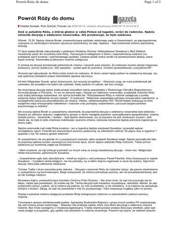 Powrót Róży do domu Page 1 of 2 Powrót Róży do domu Violetta Szostak, Piotr Żytnicki, Poznań, es 2009-09-16, ostatnia aktualizacja 2009-09-15 20:33:34.0 Dziś w południe Róża, o której głośno w całej Polsce od tygodni, wróci do rodziców. Sędzia zmieniła decyzję o odebraniu noworodka. Ale przekonuje, że była właściwa Wtorek, 15.30. Sędzia Jolanta Biniak, przewodnicząca wydziału rodzinnego sądu w Szamotułach, po pięciogodzinnej rozprawie za zamkniętymi drzwiami wpuszcza dziennikarzy na salę. Ogłasza: - Sąd postanowił zmienić poprzednią decyzję. 27 lipca sędzia Biniak zdecydowała o odebraniu Wioletcie Woźnej i Władysławowi Szwakowi z Błot Wielkich narodzonej sześć dni wcześniej córki Róży. Tłumaczyła to bałaganem w domu i nieporadnością rodziców (na podstawie opinii kuratora i szamotulskiego szpitala). Lekarze podali matce środki na powstrzymanie laktacji, piersi kazali ścisnąć. Noworodka przekazano rodzinie zastępczej. O zmianę tej decyzji wnioskowali pełnomocnik rodziny i rzecznik praw dziecka. Za rodzicami murem stanęli miejscowy proboszcz, pomoc społeczna i 300 sąsiadów - wysłali apel do premiera, ministra sprawiedliwości, prezydenta RP. Wczoraj sąd zdecydował, że Róża może wrócić do rodziców. W domu razem będą czekać na ostateczną decyzję, czy sąd ograniczy Szwakom prawa rodzicielskie (sprawa się toczy). 63-letni Władysław Szwak, ojciec dziewczynki, był wczoraj szczęśliwy: - Wreszcie czuję, że mnie potraktowali jak człowieka. Bo przedtem nie byłem jak człowiek, kiedy dziecko mi zabrali, tak bez niczego. Na wczorajszą decyzję wpływ miała przede wszystkim opinia specjalistów z Rodzinnego Ośrodka DiagnostycznoKonsultacyjnego w Poznaniu. To oni na zlecenie sądu, miesiąc po odebraniu noworodka, przebadali rodziców Róży oraz trójkę starszego rodzeństwa. Ich opinia brzmiała tak: "Pozostawienie Róży w rodzinie zastępczej z punktu widzenia dobra małoletniej nie jest celowe". O rodzicach: "Właściwie zaspokajają potrzeby emocjonalne małoletnich, w szczególności poczucia przynależności do rodziny, miłości, zainteresowania nimi. Wyniki badań wskazują na silne wzajemne więzi emocjonalne małoletnich i rodziców oraz pomiędzy rodzeństwem, poczucie bezpieczeństwa psychicznego w rodzinie". Ale wczoraj sędzia Biniak w uzasadnieniu stwierdziła, że poprzednia decyzja o odebraniu noworodka była właściwa. Dopiero po zabraniu dziecka i nagłośnieniu sprawy w domu nastąpiła poprawa, uporządkowano gospodarstwo, rodzina dostała pomoc - stwierdziła. I dodała: - Sąd będzie obserwował, czy ta poprawa nie jest chwilowym zrywem. Jeśli okaże się, że była to tylko chwilowa mobilizacja i pozorna zmiana, wówczas konieczna będzie ponowna ingerencja ze strony sądu. Sędzia ustanowiła nad małą Różą kuratora - raz w tygodniu będzie wizytował Szwaków i przesyłał sądowi szczegółowy raport. Poleciła też pracownikom pomocy społecznej, by odwiedzali rodzinę "do pięciu razy w tygodniu" i spędzali z nią "do sześciu godzin dziennie". W uzasadnieniu nie ma jednak nic o pozytywnych ocenach, jakie wystawili Szwakom biegli. Sędzia pominęła też fakt, że poprawę sądowy kurator zauważył już pod koniec lipca, zanim sędzia odebrała Różę rodzicom. Także pomoc społeczna już wcześniej zajęła się Szwakami. - Mam wrażenie, że sąd próbuje przenieść na innych winę za swoją niewłaściwą decyzję - mówi mec. Małgorzata Heller-Kaczmarska, pełnomocnik Szwaków. - Uzasadnienie sądu było skandaliczne - mówił po wyjściu z sali proboszcz Paweł Pawlicki, który towarzyszył w sądzie Szwakom. - Czytałem opinię biegłych, nie ma potrzeby, by w takim stopniu ingerować w życie tej rodziny. Sąd broni decyzji, która była całkowicie niesłuszna. Tomasz Tadla z biura rzecznika praw dziecka: - Decyzja o powrocie Róży do rodziców cieszy, ale pewne stwierdzenia w uzasadnieniu są kontrowersyjne. Biegli wskazywali, że rodzina potrzebuje pomocy, ale nie ponadstandardowej, bez aż tak ścisłego nadzoru. Mirosława Kątna, przewodnicząca Komitetu Ochrony Praw Dziecka: - Nie dziwi mnie, że sąd nie przyznaje się do błędu, ciężko jest powiedzieć, że zrobiło się źle. Tamta decyzja była haniebna, krzywdząca, nieludzka. Martwi, że sąd postanowił czyhać, czekać, aż ta rodzina się potknie, by móc powiedzieć: a nie mówiliśmy. A ta rodzina nie potrzebuje cerbera z biczem. Żałuję, że sąd nie powiedział o niej nic pozytywnego. Taka motywacja mogłaby tylko im pomóc. Dzisiaj w południe rodzina zastępcza przekaże Różę biologicznym rodzicom w szamotulskim centrum pomocy rodzinie. Tymczasem sprawa zainteresowała posłów. Agnieszka Kozłowska-Rajewicz i grupa innych posłów PO zastanawiają się nad zmianą prawa rodzinnego. - Niepokoi nas praktyka sądów, które zbyt łatwo decydują o odebraniu dziecka rodzinie. Być może wystąpimy z inicjatywą legislacyjną. Trzeba doprecyzować przepis dotyczący środków, jakie sąd może podjąć w przypadku, gdy opieka nad dzieckiem w rodzinie szwankuje. Powinno być jasne, że odebrać dziecko Powrót Róży do domu Page 2 of 2 można w sytuacji absolutnie wyjątkowej. I że sąd obowiązany jest stosować najłagodniejszy możliwy środek wystarczający, by zabezpieczyć dobro dziecka. Violetta Szostak, Piotr Żytnicki, Poznań, es Tekst pochodzi z serwisu Wyborcza.pl - www.wyborcza.pl © Agora SA