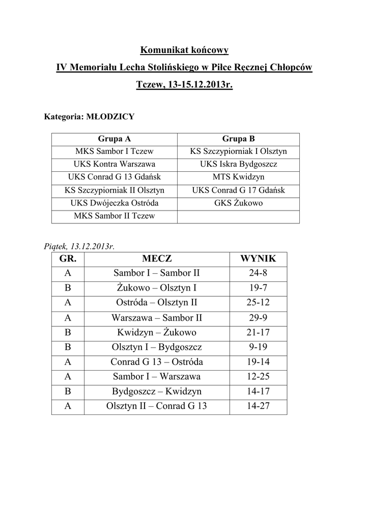 Komunikat końcowy IV Memoriału Lecha Stolińskiego w Piłce Ręcznej Chłopców Tczew, 13-15.12.2013r. Kategoria: MŁODZICY Grupa A MKS Sambor I Tczew UKS Kontra Warszawa UKS Conrad G 13 Gdańsk Grupa B KS Szczypiorniak I Olsztyn UKS Iskra Bydgoszcz MTS Kwidzyn KS Szczypiorniak II Olsztyn UKS Dwójeczka Ostróda MKS Sambor II Tczew UKS Conrad G 17 Gdańsk GKS Żukowo Piątek, 13.12.2013r. GR. A B A MECZ Sambor I – Sambor II Żukowo – Olsztyn I Ostróda – Olsztyn II WYNIK 24-8 19-7 25-12 A B B A A B A Warszawa – Sambor II Kwidzyn – Żukowo Olsztyn I – Bydgoszcz Conrad G 13 – Ostróda Sambor I – Warszawa Bydgoszcz – Kwidzyn Olsztyn II – Conrad G 13 29-9 21-17 9-19 19-14 12-25 14-17 14-27 Sobota, 14.12.2013r. GR. B B A A A A A B B B A A A B A 5-8 5-8 1-4 1-4 MECZ Kwidzyn – Olsztyn I Conrad G 17 – Bydgoszcz Ostróda – Sambor II Conrad G 13 – Sambor I Warszawa – Olsztyn II Ostróda – Sambor I Conrad G 13 – Warszawa Conrad G 17 – Kwidzyn Bydgoszcz – Żukowo Olsztyn I – Conrad G 17 Sambor II – Conrad G 13 Olsztyn II – Sambor I Warszawa – Ostróda Żukowo – Conrad G 17 Sambor II – Olsztyn II Sambor I – Conrad G 17 Ostróda - Bydgoszcz Conrad G 13 - Kwidzyn Warszawa - Żukowo WYNIK 20-7 11-10 17-14 17-21 33-5 20-16 19-19 11-18 6-12 15-16 8-18 12-23 19-13 14-8 19-12 18-14 15-14 10-14 19-10 Niedziela, 15.12.2013r. GR. MECZ WYNIK 9-11 Olsztyn II – Olsztyn I 10-25 9-11 Sambor II – Olsztyn I 14-13 7-8 Conrad G 17 - Bydgoszcz 21-14 5-6 Sambor I - Ostróda 20-20 k.5-6 3-4 Conrad G 13 - Żukowo 16-13 1-2 Kwidzyn - Warszawa 14-18 Tabela końcowa: 1. UKS Kontra Warszawa 2. MTS Kwidzyn 3. UKS Conrad G 13 Gdańsk 4. GKS Żukowo 5. UKS Dwójeczka Ostróda 6. MKS Sambor I Tczew 7. UKS Conrad G 17 Gdańsk 8. UKS Iskra Bydgoszcz 9. MKS Sambor II Tczew 10.KS Szczypiorniak II Olsztyn 11.KS Szczypiorniak II Olsztyn Król strzelców: Michał Puchajda (Szczypiorniak I) – 49 bramek Najlepszy bramkarz turnieju: Marcin Cybulski (Kontra W-wa) Najlepszy zawodnik turnieju: Łukasz Orlich (MTS Kwidzyn) Najlepsi zawodnicy w swoich zespołach: Kontra Warszawa – Mateusz Louesdon MTS Kwidzyn – Patryk Dembowski Conrad G 13 Gdańsk – Kajetan Laskowski GKS Żukowo – Wojciech Wreza Dwójeczka Ostróda – Dawid Krauzewicz Sambor I Tczew – Maciej Binasiak Conrad G 17 Gdańsk – Adrian Szypniewski Iskra Bydgoszcz – Dominik Leprince Sambor II Tczew – Piotr Lietz Szczypiorniak I Olsztyn – Michał Puchajda Szczypiorniak II Olsztyn – Damian Waśkiewicz Najlepsi egzekutorzy rzutów karnych: Karol Ubowski (Sambor II Tczew) Szymon Jabłonecki (Sambor I Tczew) Kategoria: DZIECI Grupa C Grupa D MKS Sambor I Tczew UKS Kontra I Warszawa PTF Gdańsk UKS Siódemka-Osowa Gdańsk SP 18 Koszalin UKS SP 48 Bydgoszcz UKS Kontra II Warszawa MKS Sambor II Tczew Piątek, 13.12.2013r. GR. MECZ WYNIK C PTF Gdańsk – Sambor I 6-16 D Sambor II – Siódemka Osowa 7-16 D Bydgoszcz – Warszawa I 14-15 C Koszalin – PTF Gdańsk 24-6 D Warszawa I – Sambor II 22-6 C Sambor I – Warszawa II 21-10 D Siódemka Osowa – Bydgoszcz 9-18 C Warszawa II - Koszalin 5-25 Sobota, 14.12.2013r. GR. MECZ WYNIK D Sambor II - Bydgoszcz 7-17 C Sambor I - Koszalin 11-16 D Siódemka Osowa – Warszawa I 10-17 C PTF Gdańsk – Warszawa II 19-11 1C-4D Koszalin – Sambor II 20-9 2C-3D Sambor I – Siódemka Osowa 9-13 3C-2D PTF Gdańsk – Bydgoszcz 2-19 4C-1D Warszawa II – Warszawa I 6-16 5-8 Sambor II – PTF Gdańsk 12-14 5-8 Sambor I – Warszawa II 11-10 1-4 Koszalin - Bydgoszcz 7-10 1-4 Siódemka Osowa – Warszawa I 5-20 Niedziela, 15.12.2013r. GR. MECZ WYNIK 7-8 Sambor II – Warszawa II 20-12 5-6 PTF Gdańsk – Sambor I 5-15 3-4 Koszalin – Siódemka Osowa 13-4 1-2 Bydgoszcz – Warszawa I 12-16 Tabela końcowa: 1. UKS Kontra I Warszawa 2. UKS SP 48 Bydgoszcz 3. SP 18 Koszalin 4. UKS Siódemka-Osowa Gdańsk 5. MKS Sambor I Tczew 6. PTF Gdańsk 7. MKS Sambor II Tczew 8. UKS Kontra II Warszawa Król strzelców: Dominik Cegielski (SP 18 Koszalin) – 38 bramek Najlepszy bramkarz turnieju: Kacper Ligarzewski (Bydgoszcz) Najlepszy zawodnik turnieju: Maksymilian Troczyński (Kontra I) Najlepsi zawodnicy w swoich zespołach: Kontra I Warszawa – Gustaw Supeł UKS SP 48 Bydgoszcz – Mateusz Urbański SP 18 Koszalin – Jakub Bujnowski Siódemka-Osowa Gdańsk – Jakub Szydłowski Sambor I Tczew – Szymon Pytka PTF Gdańsk – Mateusz Bieńkowski Sambor II Tczew – Jakub Rajda Kontra II Warszawa – Cezary Kobryń Najlepszy egzekutor rzutów karnych: Jakub Kunowski (Sambor I) Organizatorzy: MKS Sambor Tczew, Gimnazjum nr 3 w Tczewie. Partnerzy i sponsorzy IV Memoriału: Urząd Miejski w Tczewie, Starostwo Powiatowe w Tczewie, PWZPR w Gdańsku, Rada Rodziców przy Gimnazjum nr 3 w Tczewie, ZWiK Tczew, TTBS, PPHU Latocha, Aussie Development, ATC, PPHU Profiplast, Piekarnia J.Wąs, Piekarnia Sambor, Dorota Szramke, Sklep Vega, Hotel Link, Dariusz Godlewski, SP 12 w Tczewie, Silgan Metal Packaging.
