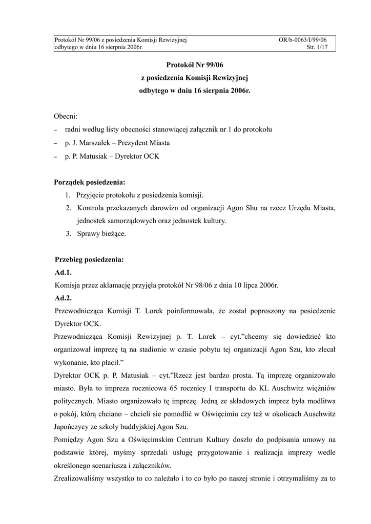 Protokół Nr 99/06 z posiedzenia Komisji Rewizyjnej odbytego w dniu 16 sierpnia 2006r. OR/b-0063/I/99/06 Str. 1/17 Protokół Nr 99/06 z posiedzenia Komisji Rewizyjnej odbytego w dniu 16 sierpnia 2006r. Obecni: – radni według listy obecności stanowiącej załącznik nr 1 do protokołu – p. J. Marszałek – Prezydent Miasta – p. P. Matusiak – Dyrektor OCK Porządek posiedzenia: 1. Przyjęcie protokołu z posiedzenia komisji. 2. Kontrola przekazanych darowizn od organizacji Agon Shu na rzecz Urzędu Miasta, jednostek samorządowych oraz jednostek kultury. 3. Sprawy bieżące. Przebieg posiedzenia: Ad.1. Komisja przez aklamację przyjęła protokół Nr 98/06 z dnia 10 lipca 2006r. Ad.2. Przewodnicząca Komisji T. Lorek poinformowała, że został poproszony na posiedzenie Dyrektor OCK. Przewodnicząca Komisji Rewizyjnej p. T. Lorek – cyt.”chcemy się dowiedzieć kto organizował imprezę tą na stadionie w czasie pobytu tej organizacji Agon Szu, kto zlecał wykonanie, kto płacił.” Dyrektor OCK p. P. Matusiak – cyt.”Rzecz jest bardzo prosta. Tą imprezę organizowało miasto. Była to impreza rocznicowa 65 rocznicy I transportu do KL Auschwitz więźniów politycznych. Miasto organizowało tę imprezę. Jedną ze składowych imprez była modlitwa o pokój, którą chciano – chcieli sie pomodlić w Oświęcimiu czy też w okolicach Auschwitz Japończycy ze szkoły buddyjskiej Agon Szu. Pomiędzy Agon Szu a Oświęcimskim Centrum Kultury doszło do podpisania umowy na podstawie której, myśmy sprzedali usługę przygotowanie i realizacja imprezy wedle określonego scenariusza i załączników. Zrealizowaliśmy wszystko to co należało i to co było po naszej stronie i otrzymaliśmy za to Protokół Nr 99/06 z posiedzenia Komisji Rewizyjnej odbytego w dniu 16 sierpnia 2006r. OR/b-0063/I/99/06 Str. 2/17 określone pieniądze. Na nasze konto prowadzone w Banku Spółdzielczym w Zatorze. Umowa została podpisana 13 kwietnia br. Określała bardzo precyzyjnie warunki wykonania i przygotowania. Potem na pewien czas jak Państwo wiecie było bardzo gorąco wokół tej imprezy i nie było wiadomo czy ona dojdzie do skutku czy też nie. I od tego czasu pieniądze od 1-go dnia jak trafiły na nasze konto myśmy założyli lokatę. Te pieniądze po prostu procentowały można powiedzieć na naszą korzyść. I ja zabroniłem uruchomienia choćby 1 złotówki z konta na wypadek, gdyby do imprezy nie doszło. Wówczas trzeba było pieniądze kontrachentowi zwrócić. Była to klasyczna umowa handlowa – po prostu sprzedaż usługi. Ostatecznie na dwa tygodnie przed imprezą Pan Prezydent podjął decyzję o realizacji imprezy modlitwy o pokój. Japończycy przedstawili jakby można powiedzieć korektę tych warunków, ponieważ odbywała się w innym miejscu niż pierwotnie zakładano. W związku z tym trzeba było przystosować teren. No i po wstępnej wizji lokalnej na stadionie MOSiR-u Japończycy zdecydowali, że to miejsce bardzo ich zadawala i bardzo by chcieli, aby impreza tam się odbyła. Impreza została zrealizowana, odbyła się zgodnie z przewidywaniami i planami. Myśmy nie źle zarobili jako OCK. I to tyle ile mogę na ten temat powiedzieć." P. T. Lorek – cyt."proszę mi powiedzieć jaka kwota wpłynęła na konto OCK." P. P. Matusiak – cyt."400 tyś. Dolarów to znaczy równowartość w złotówkach." P. T. Lorek – cyt."400 tyś. A przecież Komisja Rewizyjna pytała, pytała się .." P. P. Matusiak- cyt."pytała się o darowiznę, myśmy żadnej darowizny nie otrzymali pieniądze na wykonanie usługi." Radny K. Kuczek – cyt."czyli Panie Dyrektorze impreza kosztowała 400 tyś" P. P. Matusiak – cyt."nie. Kosztowała co najmniej połowę mniej, reszta to nasz zarobek." Radny K. Kuczek – cyt."czyli Panie Dyrektorze połowa mniej to II połowa powinna być darowizna." P. P. Matusiak – cyt."nie. To nasz zarobek. Myśmy się po prostu wysoko wycenili. Ponieważ istniało zagrożenie, że np. Pieniądze zostaną wydatkowane a do imprezy nie dojdzie, kto mi wówczas pokryje koszty. Nie darowizna. Darowizna jest wtedy, kiedy są przelane środki bez zobowiązań. To zobowiązanie było bardzo konkretne." Radny K. Kuczek – cyt."czyli rozumiem Panie Dyrektorze, że koszty wykonania tej imprezy są o połowę niższe, natomiast strona podpisująca umowę - strona Japońska zapłaciła za nią Protokół Nr 99/06 z posiedzenia Komisji Rewizyjnej odbytego w dniu 16 sierpnia 2006r. OR/b-0063/I/99/06 Str. 3/17 400 tyś. Dolarów a nie ma ... Prezydent Miasta J. Marszałek – cyt."taka była ich wola". P. P. Matusiak – cyt."do tego stopnia, że wszystkie rzeczy trwałe, które zostały zakupione na tę imprezę- oni się o to nie upominali. Myśmy sie pytali co stanie się z meblami, krzesłami itd. My tego nie chcemy. W związku z tym jest to środek trwały i kolejne 55 tyś. dla nas. Dzięki temu pozyskaliśmy 200 krzeseł składanych, 140 krzeseł wyścielanych, 25 stołów, lodówkę, komplet mebli skórzanych i całe mnóstwo tzw. drobiazgów typu wieszaki stojące itd. W tej chwili jest to na stanie OCK jako nasz stan materialny, więc po prostu uważam, że ... Radny K. Kuczek – cyt. " jako środek trwały OCK Dyrektor P. Matusiak - cyt. "tak jest" P. T. Lorek cyt. "Ale proszę mi powiedzieć ile praktycznie kosztowała organizacja tej imprezy? Dyrektor P. Matusiak – cyt."No to musiałbym zapytać główną księgową" P. T. Lorek - cyt."Ale mnie tam nie chodzi dokładnie" P. P. Matusiak – cyt."ale w granicach 300 – 400 tyś. zł." P. T. Lorek – cyt."No ale mnie się wydaje, że jeżeli komisja rewizyjna pytała się czy wpłynęła jakaś darowizna, czy to tak by elegancko było gdybyście państwo wpisali, że darowizna nie wpłynęła a wpłynęły tam 400 tys. Dolarów. P. P. Matusiak – cyt. "600 tys. na imprezy związane z 66 rocznicą, ale to nie tylko japońska impreza, mówiąc krótko tych faktów było tak strasznie dużo, tu p