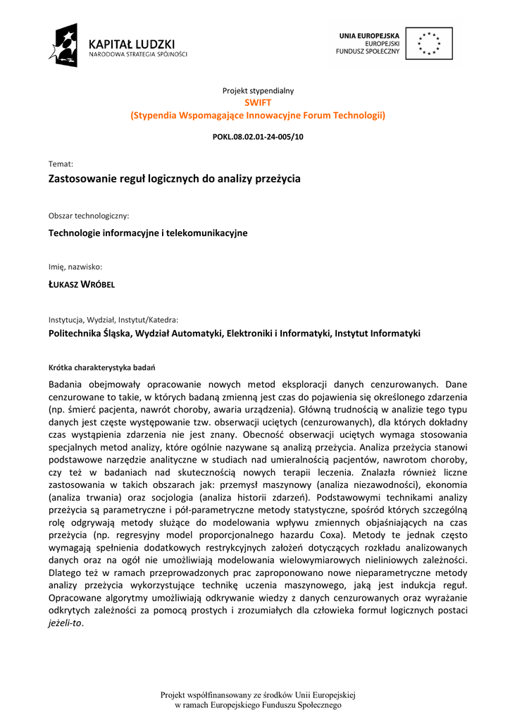 Projekt stypendialny SWIFT (Stypendia Wspomagające Innowacyjne Forum Technologii) POKL.08.02.01-24-005/10 Temat: Zastosowanie reguł logicznych do analizy przeżycia Obszar technologiczny: Technologie informacyjne i telekomunikacyjne Imię, nazwisko: ŁUKASZ WRÓBEL Instytucja, Wydział, Instytut/Katedra: Politechnika Śląska, Wydział Automatyki, Elektroniki i Informatyki, Instytut Informatyki Krótka charakterystyka badań Badania obejmowały opracowanie nowych metod eksploracji danych cenzurowanych. Dane cenzurowane to takie, w których badaną zmienną jest czas do pojawienia się określonego zdarzenia (np. śmierć pacjenta, nawrót choroby, awaria urządzenia). Główną trudnością w analizie tego typu danych jest częste występowanie tzw. obserwacji uciętych (cenzurowanych), dla których dokładny czas wystąpienia zdarzenia nie jest znany. Obecność obserwacji uciętych wymaga stosowania specjalnych metod analizy, które ogólnie nazywane są analizą przeżycia. Analiza przeżycia stanowi podstawowe narzędzie analityczne w studiach nad umieralnością pacjentów, nawrotom choroby, czy też w badaniach nad skutecznością nowych terapii leczenia. Znalazła również liczne zastosowania w takich obszarach jak: przemysł maszynowy (analiza niezawodności), ekonomia (analiza trwania) oraz socjologia (analiza historii zdarzeń). Podstawowymi technikami analizy przeżycia są parametryczne i pół-parametryczne metody statystyczne, spośród których szczególną rolę odgrywają metody służące do modelowania wpływu zmiennych objaśniających na czas przeżycia (np. regresyjny model proporcjonalnego hazardu Coxa). Metody te jednak często wymagają spełnienia dodatkowych restrykcyjnych założeń dotyczących rozkładu analizowanych danych oraz na ogół nie umożliwiają modelowania wielowymiarowych nieliniowych zależności. Dlatego też w ramach przeprowadzonych prac zaproponowano nowe nieparametryczne metody analizy przeżycia wykorzystujące technikę uczenia maszynowego, jaką jest indukcja reguł. Opracowane algorytmy umożliwiają odkrywanie wiedzy z danych cenzurowanych oraz wyrażanie odkrytych zależności za pomocą prostych i zrozumiałych dla człowieka formuł logicznych postaci jeżeli-to. Projekt współfinansowany ze środków Unii Europejskiej w ramach Europejskiego Funduszu Społecznego