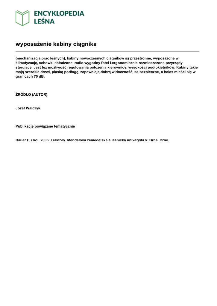 wyposażenie kabiny ciągnika (mechanizacja prac leśnych), kabiny nowoczesnych ciągników są przestronne, wyposażone w klimatyzację, schowki chłodzone, radio wygodny fotel i ergonomicznie rozmieszczone przyrządy sterujące. Jest też możliwość regulowania położenia kierownicy, wysokości podłokietników. Kabiny takie mają szerokie drzwi, płaską podłogę, zapewniają dobrą widoczność, są bezpieczne, a hałas mieści się w granicach 70 dB. ŹRÓDŁO (AUTOR) Józef Walczyk Publikacje powiązane tematycznie Bauer F. i kol. 2006. Traktory. Mendelova zemědělská a lesnická univeryita v Brně. Brno.