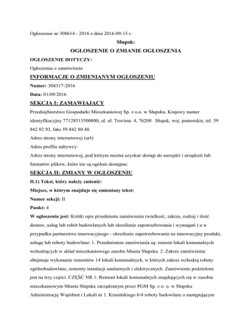Ogłoszenie nr 308614 - 2016 z dnia 2016-09-15 r. Słupsk: OGŁOSZENIE O ZMIANIE OGŁOSZENIA OGŁOSZENIE DOTYCZY: Ogłoszenia o zamówieniu INFORMACJE O ZMIENIANYM OGŁOSZENIU Numer: 304317-2016 Data: 01/09/2016 SEKCJA I: ZAMAWIAJĄCY Przedsiębiorstwo Gospodarki Mieszkaniowej Sp. z o.o. w Słupsku, Krajowy numer identyfikacyjny 77128515500000, ul. ul. Tuwima 4, 76200 Słupsk, woj. pomorskie, tel. 59 842 82 93, faks 59 842 80 48. Adres strony internetowej (url): Adres profilu nabywcy: Adres strony internetowej, pod którym można uzyskać dostęp do narzędzi i urządzeń lub formatów plików, które nie są ogólnie dostępne: SEKCJA II: ZMIANY W OGŁOSZENIU II.1) Tekst, który należy zmienić: Miejsce, w którym znajduje się zmieniany tekst: Numer sekcji: II Punkt: 4 W ogłoszeniu jest: Krótki opis przedmiotu zamówienia (wielkość, zakres, rodzaj i ilość dostaw, usług lub robót budowlanych lub określenie zapotrzebowania i wymagań ) a w przypadku partnerstwa innowacyjnego - określenie zapotrzebowania na innowacyjny produkt, usługę lub roboty budowlane: 1. Przedmiotem zamówienia są: remont lokali komunalnych wchodzących w skład mieszkaniowego zasobu Miasta Słupska. 2. Zakres zamówienia: obejmuje wykonanie remontów 14 lokali komunalnych, w których zakres wchodzą roboty ogólnobudowlane, remonty instalacji sanitarnych i elektrycznych. Zamówienie podzielone jest na trzy części. CZĘŚĆ NR 1: Remont lokali komunalnych znajdujących się w zasobie mieszkaniowym Miasta Słupska zarządzanym przez PGM Sp. z o. o. w Słupsku Administrację Wspólnot i Lokali nr 1. Krasińskiego 6/4 roboty budowlane o następującym zakresie: - wymiana tynków na sufitach i ścianach, montaż płyt karton – gips, - malowanie ścian i sufitów, - wykupie otworów okiennych i drzwiowych, - wymiana drzwi wewnętrznych i zewnętrznych, - wymiana 3 szt. okien wraz z podokiennikami, - naprawa podłóg i położenie wykładziny PCV, - remont łazienki, - wymiana osprzętu i urządzeń sanitarnych, - montaż bojlera elektrycznego, - remont instalacji elektrycznej z wymianą osprzętu, - montaż kuchenki elektrycznej. - wykonanie ogrzewania elektrycznego w kuchni i łazience - przestawienie pieca kaflowego. H. Pobożnego 17/2a roboty budowlane o następującym zakresie: - uzupełnienie i malowanie tynków ścian i sufitów, - wymiana stolarki drzwiowej wewnętrznej i zewnętrznej, - wymiana stolarki okiennej, - naprawa podłóg płytą OSB i położenie wykładziny PCV i paneli - rozbiórka pieca kaflowego - wymiana instalacji elektrycznej wraz z osprzętem naprawa instalacji sanitarnej, - wymiana urządzeń i osprzętu sanitarnego, - montaż bojlera elektrycznego, - montaż ogrzewania elektrycznego. Nad Śluzami 13/11 roboty budowlane o następującym zakresie: - uzupełnienie i malowanie tynków ścian i sufitów, - wymiana stolarki drzwiowej wewnętrznej i zewnętrznej, - malowanie stolarki okiennej i drzwiowej, - naprawa podłóg płytą OSB i położenie wykładziny PCV - naprawa instalacji sanitarnej, - wymiana urządzeń i osprzętu sanitarnego, - montaż bojlera elektrycznego, - wymiana kuchenki gazowej, - montaż grzejników elektrycznych - wymiana instalacji elektrycznej wraz z osprzętem. Wojska Polskiego 44/5a roboty budowlane o następującym zakresie: - wykonanie izolacji podposadzkowych wraz z wcześniejszą naprawa istniejącego podłoża, - położenie wykładzin z PCV i paneli podłogowych, - postawienie ścianki działowej, - montaż skrzydła drzwiowego, - uzupełnienie i malowanie tynków ścian i sufitów, - wymiana stolarki okiennej, - wymiana instalacji elektrycznej wraz z osprzętem, - montaż kuchni elektrycznej, - naprawa instalacji sanitarnej, - wymiana urządzeń i osprzętu sanitarnego, - montaż bojlera elektrycznego, - wykonanie instalacji centralnego ogrzewania ( z sieci miejskiej). CZĘŚĆ NR 2: Remont lokali komunalnych znajdujących się w zasobie mieszkaniowym Miasta Słupska zarządzanym przez PGM Sp. z o. o. w Słupsku Administrację Wspólnot i Lokali nr 2. Niemcewicza 21/7 roboty budowlane o następującym zakresie: - przestawienie pieca kaflowego, - rozbiórka ścian, - wykonanie ścianki działowej z płyt karton gips, - uzupełnienie i malowanie tynków ścian i sufitów, - położenie płytek ściennych, - naprawa podłóg drewnianych, - położenie wykładzin z PCV, - remont wc na klatce schodowej, - wymiana drzwi wewnętrznych i zewnętrznych, - wymiana stolarki okiennej, - wymiana instalacji elektrycznej wraz z osprzętem, - naprawa instalacji sanitarnej, - wymiana urządzeń i osprzętu sanitarnego. Partyzantów 32/4A roboty budowlane o następującym zakresie: - wymiana drzwi wewnętrznych i zewnętrznych, - przestawienie pieca kaflowego, - uzupełnienie i malowanie tynków ścian i sufitów, - wymiana częściowej instalacji elektrycznej wraz z osprzętem, naprawa instalacji sanitarnej, - wymiana urządzeń i osprzętu sanitarnego, - likwidacja instalacji gazowej. Wolności 17/2 roboty budowlane o następującym zakresie: - wymiana i malowanie tynków, - naprawa podłóg drewnianych, - położenie wykładzin z PCV, - wymiana drzwi wewnętrznych i zewnętrznych, - wymiana stolarki okiennej, - wymiana instalacji elektrycznej wraz z osprzętem, - wykonanie pomieszczenia łazienki, - naprawa instalacji sanitarnej, - wymiana urządzeń i osprzętu sanitarnego, - rozbiórka pieców kaflowych, wykonanie ogrzewania elektrycznego. Kołłątaja 8/7 roboty budowlane o następującym zakresie: - naprawa podłóg drewnianych, - położenie wykładzin z PCV, - wymiana drzwi wewnętrznych, - wymiana stolarki okiennej, - uzupełnienie i malowanie tynków ścian i sufitów, - postawienie ścianki działowej, - wykonanie sufitów podwieszanych i obudowa poddasza płytami karton – gips, - rozbiórka pieców kaflowych, - wymiana instalacji elektrycznej wraz z osprzętem, - naprawa instalacji sanitarnej, - wymiana urządzeń i osprzętu sanitarnego, - wykonani