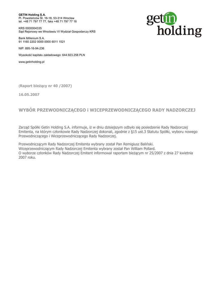 GETIN Holding S.A. Pl. Powstańców Śl. 16-18, 53-314 Wrocław tel. +48 71 797 77 77, faks +48 71 797 77 16 KRS 0000004335 Sąd Rejonowy we Wrocławiu VI Wydział Gospodarczy KRS Bank Millenium S.A. 91 1160 2202 0000 0000 6011 1521 NIP: 895-16-94-236 Wysokość kapitału zakładowego: 644.923.258 PLN www.getinholding.pl (Raport bieżący nr 40 /2007) 16.05.2007 WYBÓR PRZEWODNICZĄCEGO i WICEPRZEWODNICZĄCEGO RADY NADZORCZEJ Zarząd Spółki Getin Holding S.A. informuje, iż w dniu dzisiejszym odbyło się posiedzenie Rady Nadzorczej Emitenta, na którym członkowie Rady Nadzorczej dokonali, zgodnie z §15 ust.3 Statutu Spółki, wyboru nowego Przewodniczącego i Wiceprzewodniczącego Rady Nadzorczej. Przewodniczącym Rady Nadzorczej Emitenta wybrany został Pan Remigiusz Baliński. Wiceprzewodniczącym Rady Nadzorczej Emitenta wybrany został Pan William Pollard. O wyborze członków Rady Nadzorczej Emitent informował raportem bieżącym nr 25/2007 z dnia 27 kwietnia 2007 roku.
