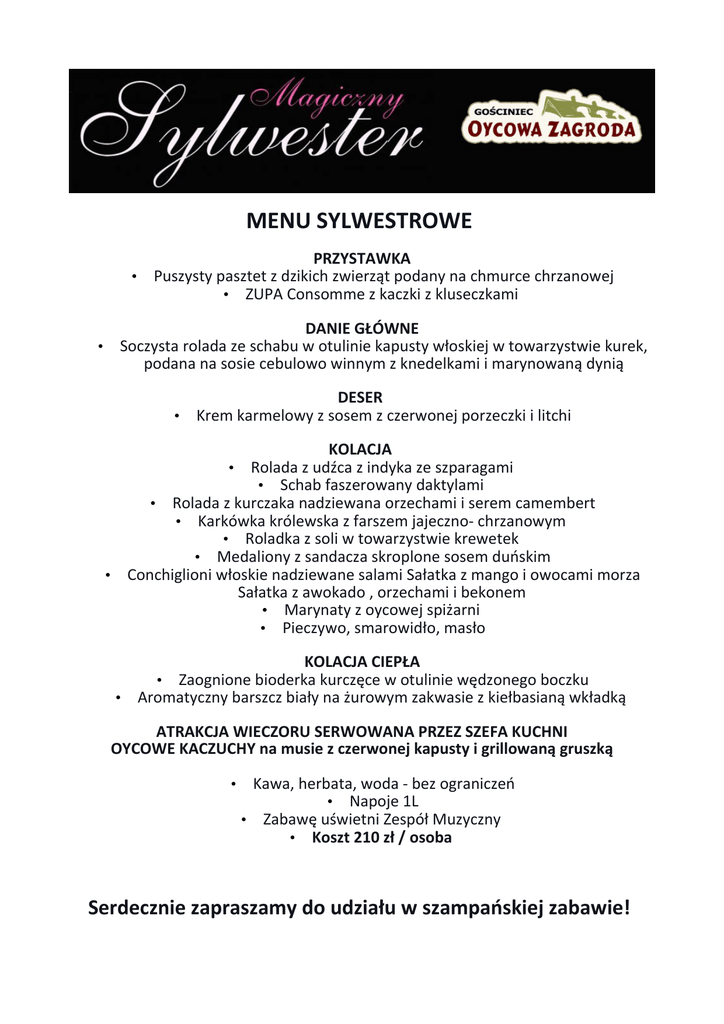 MENU SYLWESTROWE • PRZYSTAWKA Puszysty pasztet z dzikich zwierząt podany na chmurce chrzanowej • ZUPA Consomme z kaczki z kluseczkami DANIE GŁÓWNE • Soczysta rolada ze schabu w otulinie kapusty włoskiej w towarzystwie kurek, podana na sosie cebulowo winnym z knedelkami i marynowaną dynią DESER • Krem karmelowy z sosem z czerwonej porzeczki i litchi KOLACJA • Rolada z udźca z indyka ze szparagami • Schab faszerowany daktylami • Rolada z kurczaka nadziewana orzechami i serem camembert • Karkówka królewska z farszem jajeczno- chrzanowym • Roladka z soli w towarzystwie krewetek • Medaliony z sandacza skroplone sosem duńskim • Conchiglioni włoskie nadziewane salami Sałatka z mango i owocami morza Sałatka z awokado , orzechami i bekonem • Marynaty z oycowej spiżarni • Pieczywo, smarowidło, masło KOLACJA CIEPŁA Zaognione bioderka kurczęce w otulinie wędzonego boczku • Aromatyczny barszcz biały na żurowym zakwasie z kiełbasianą wkładką • ATRAKCJA WIECZORU SERWOWANA PRZEZ SZEFA KUCHNI OYCOWE KACZUCHY na musie z czerwonej kapusty i grillowaną gruszką • Kawa, herbata, woda - bez ograniczeń • Napoje 1L • Zabawę uświetni Zespół Muzyczny • Koszt 210 zł / osoba Serdecznie zapraszamy do udziału w szampańskiej zabawie!