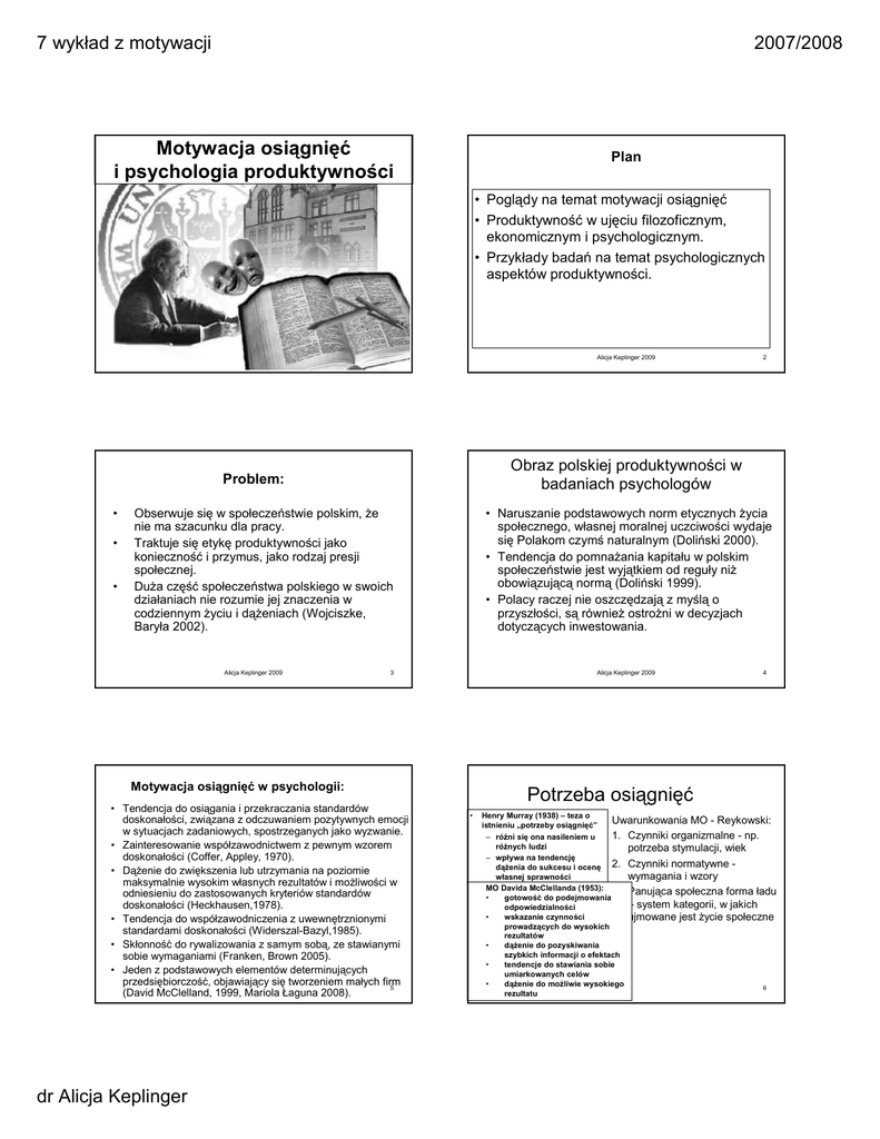 7 wykład z motywacji 2007/2008 Motywacja osiągnięć i psychologia produktywności Plan • Poglądy na temat motywacji osiągnięć • Produktywność w ujęciu filozoficznym, ekonomicznym i psychologicznym. • Przykłady badań na temat psychologicznych aspektów produktywności. Alicja Keplinger 2009 1 Alicja Keplinger 2009 Obraz polskiej produktywności w badaniach psychologów Problem: • • • Obserwuje się w społeczeństwie polskim, Ŝe nie ma szacunku dla pracy. Traktuje się etykę produktywności jako konieczność i przymus, jako rodzaj presji społecznej. DuŜa część społeczeństwa polskiego w swoich działaniach nie rozumie jej znaczenia w codziennym Ŝyciu i dąŜeniach (Wojciszke, Baryła 2002). Alicja Keplinger 2009 • Naruszanie podstawowych norm etycznych Ŝycia społecznego, własnej moralnej uczciwości wydaje się Polakom czymś naturalnym (Doliński 2000). • Tendencja do pomnaŜania kapitału w polskim społeczeństwie jest wyjątkiem od reguły niŜ obowiązującą normą (Doliński 1999). • Polacy raczej nie oszczędzają z myślą o przyszłości, są równieŜ ostroŜni w decyzjach dotyczących inwestowania. 3 Alicja Keplinger 2009 Motywacja osiągnięć w psychologii: • Tendencja do osiągania i przekraczania standardów doskonałości, związana z odczuwaniem pozytywnych emocji w sytuacjach zadaniowych, spostrzeganych jako wyzwanie. • Zainteresowanie współzawodnictwem z pewnym wzorem doskonałości (Coffer, Appley, 1970). • DąŜenie do zwiększenia lub utrzymania na poziomie maksymalnie wysokim własnych rezultatów i moŜliwości w odniesieniu do zastosowanych kryteriów standardów doskonałości (Heckhausen,1978). • Tendencja do współzawodniczenia z uwewnętrznionymi standardami doskonałości (Widerszal-Bazyl,1985). • Skłonność do rywalizowania z samym sobą, ze stawianymi sobie wymaganiami (Franken, Brown 2005). • Jeden z podstawowych elementów determinujących przedsiębiorczość, objawiający się tworzeniem małych firm 5 (David McClelland, 1999, Mariola Łaguna 2008). dr Alicja Keplinger 2 4 Potrzeba osiągnięć • Henry Murray (1938) – teza o Uwarunkowania MO - Reykowski: istnieniu „potrzeby osiągnięć” 1. Czynniki organizmalne - np. – róŜni się ona nasileniem u róŜnych ludzi potrzeba stymulacji, wiek – wpływa na tendencję dąŜenia do sukcesu i ocenę 2. Czynniki normatywne wymagania i wzory własnej sprawności MO Davida McClellanda (1953): 3. Panująca społeczna forma ładu • gotowość do podejmowania – system kategorii, w jakich odpowiedzialności • wskazanie czynności ujmowane jest Ŝycie społeczne prowadzących do wysokich rezultatów • dąŜenie do pozyskiwania szybkich informacji o efektach • tendencje do stawiania sobie umiarkowanych celów • dąŜenie do moŜliwie wysokiego 6 rezultatu 7 wykład z motywacji 2007/2008 Model motywacji osiągnięć Atkinsona Hipotetyczna tendencja do osiągania sukcesu (TS) Atrybucyjny model motywacji osiągnięć: Hipotetyczna tendencja do unikania poraŜki (TP) TS = PS * W S W S = (1 – PS) • więcej satysfakcji z sukcesu będącego wynikiem moŜliwości i umiejętności, niŜ szczęśliwego zbiegu okoliczności lub działań innych ludzi. • potrzeba uzyskania wiedzy o własnych umiejętnościach i moŜliwościach TP = PP * W P W P = -PS PS = 1 – P P • Alternatywne ujęcia motywacji osiągnięć: Motywacja osiągnięć (TC) jest sumą: • Orientacja na poziom wykonania (performance). • Orientacja na osiągnięcie mistrzostwa (mastery). TC = TS + TP Alicja Keplinger 2009 7 Alicja Keplinger 2009 Naturalizm, kierunek uznający prawa przyrody za jedyne, które rządzą rzeczywistością i ją tłumaczą – np. wiek Motywy rywalizacji według Frankena i Browna (2005): 1. Chęć wygrania, okazać się lepszym od innych 2. Maksymalizacja wysiłku w realizacji zadania • • 3. Chęć ciągłej poprawy własnego wykonania określonych zadań 4. Satysfakcja płynąca z poczucia dobrze wykonanego zadania przy preferencji trudnych zadań Alicja Keplinger 2009 9 Etyczne aspekty rozumienia produktywności • • • Etap adolescencji : subiektywizm w myśleniu, znaczenia są zaleŜne od osoby, Heckhausena koncepcja wieku nie ma absolutnej prawdy, krytycznego dla rozwoju brak jest obiektywnych kryteriów motywacji osiągnięć. prawdziwości twierdzeń. • Fakty są wytwarzane (product), a nie 1.8-2.8 r.Ŝ być sprawcą zbierane, czy otrzymywane w gotowej, McClleland (za Reykowski niezaleŜnej od zbierającego postaci. 1975). • W alokacjach integracja zasady Etap przedszkolny: produktywności i fizycznego naiwny realizm (Chandler 1987), upośledzenia (Thomas, Jones, 2005). wiedza jest mozaiką faktów • Wraz z wiekiem branie pod uwagę więcej niŜ jedno kryterium. Przedszkolaki – w alokacjach nagród stosują zasadę sprawiedliwości opartej na równości i produktywności (Thomas, Jones, 2005). 10 Paradoks ludzkiej egzystencji według Ericha Fromma (1994) •Jeremiasz Benthama (1748-1832) •Etyka utylitaryzmu - korzyści, poŜytku, wygody, przyjemność, hedonizm, tzw. zasada minimaksu. •Max Weber (1864-1920) Etyka protestancka: etos pracy, uŜyteczność, oszczędność i inwestowanie (dóbr i czasu), podejmowanie decyzji, skuteczność, uczciwość. Grzechy główne: bezproduktywność, lenistwo, marnotrawstwo (dóbr, czasu), pospieszna konsumpcja, lekkomyślność, poraŜka. • Człowiek jednocześnie szuka: • Bliskości i niezaleŜności • Wyjątkowości i odrębności •Jana Paweł II (1920-2005) Etyka katolicka: •pracowitość - nie dla zysku i własności, ale dla miłości i dobra społecznego. 11 dr Alicja Keplinger Alicja Keplinger 2009 12 7 wykład z motywacji 2007/2008 Rozwiązaniem tego paradoksu, a zarazem moralnego problemu moŜe stać się produktywność • • • • • • • • Praca i jej efekty Miłość produktywna: troska, odpowiedzialność, szacunek (przyglądać się), Rozum: wied