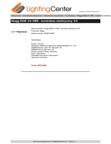 Utworzono: środa, 08 marzec 2017 Instrumenty > Instrumenty klasyczne > Instrumenty smyczkowe > Kontrabasy > Stagg EDB 3/4 VBR - kontrabas elektrycz Stagg EDB 3/4 VBR - kontrabas elektryczny 3/4 Nazwa produktu: Stagg EDB 3/4 VBR - kontrabas elektryczny 3/4 Producent: Stagg Model produktu: SEDB3/4VBR Specyfikacja: Korpus: Lity klon Regulacja: Głośność i Ton Wyjścia: Jack 1/4", Mini-jack 1/8" Wejście: Mini-jack 1/8" Klucze: Diecast P-Bass, niklowane Kolor: Violin Brown Wykończenie: Lakierowane Akcesoria: Pokrowiec Cena: 2833.00zł http://www.lightingcenter.pl | [email protected] | | Strona 1/1