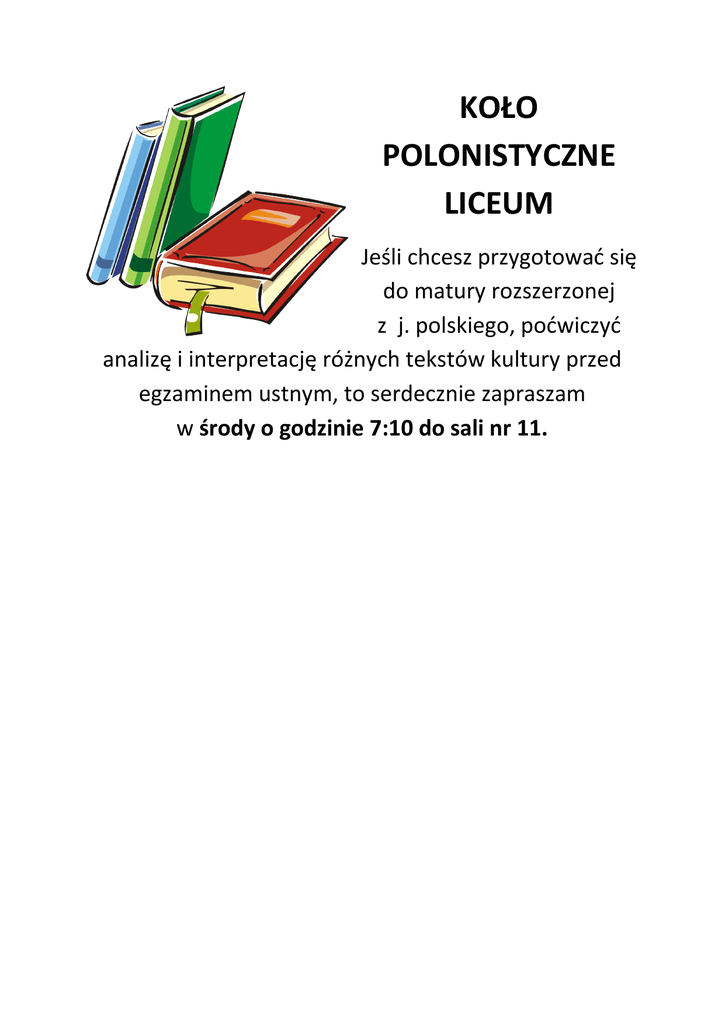KOŁO POLONISTYCZNE LICEUM Jeśli chcesz przygotować się do matury rozszerzonej z j. polskiego, poćwiczyć analizę i interpretację różnych tekstów kultury przed egzaminem ustnym, to serdecznie zapraszam w środy o godzinie 7:10 do sali nr 11. KOŁO POLONISTYCZNE GIMNAZJUM Jeśli chcesz przygotować się do egzaminu gimnazjalnego z j. polskiego, poćwiczyć analizę i interpretację różnych tekstów kultury, powtórzyć gramatykę i zasady ortografii, to serdecznie zapraszam w czwartki o godzinie 7:10 do sali nr 14.