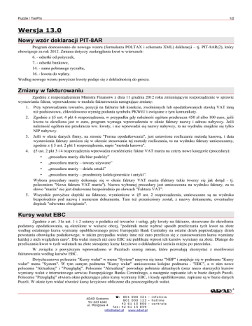 Puzzle / TaxPro 1/2 Wersja 13.0 Nowy wzór deklaracji PIT-8AR Program dostosowano do nowego wzoru (formularza POLTAX i schematu XML) deklaracji – tj. PIT-8AR(2), który obowiązuje za rok 2012. Zmiana dotyczy zaokrąglania kwot w wierszach: 6. - odsetki od pożyczek, 7. - odsetki bankowe, 14. - suma pobranego ryczałtu, 16. - kwota do wpłaty. Według nowego wzoru powyższe kwoty podaje się z dokładnością do grosza. Zmiany w fakturowaniu Zgodnie z rozporządzeniem Ministra Finansów z dnia 11 grudnia 2012 roku zmieniającym rozporządzenie w sprawie wystawiania faktur, wprowadzono w module fakturowania następujące zmiany: 1. Przy wprowadzaniu towarów, pozycji na fakturze lub korekcie, zwolnionych lub opodatkowanych stawką VAT inną niż podstawowa, zlikwidowano wymóg podania symbolu PKWiU i związane z tym komunikaty. 2. Zgodnie z §5 ust. 4 pkt 6 rozporządzenia, w przypadku gdy należność ogółem przekracza 450 zł albo 100 euro, jeśli kwota ta określona jest w euro, program wymaga wprowadzenia w oknie faktury nazwy i adresu nabywcy. Jeśli należność ogółem nie przekracza ww. kwoty, i nie wprowadzi się nazwy nabywcy, to na wydruku znajdzie się tylko NIP nabywcy. 3. Jeśli w oknie danych firmy, na stronie "Forma opodatkowania", jest ustawione rozliczanie metodą kasową, i data wystawienia faktury zawiera się w okresie stosowania tej metody rozliczania, to na wydruku faktury umieszczamy, zgodnie z § 5 ust. 2 pkt 1 rozporządzenia, napis "metoda kasowa". 4. §5 ust. 2 pkt 3 i 4 rozporządzenia wprowadza rozróżnienie faktur VAT marża na cztery nowe kategorie (procedury): 5. • „procedura marży dla biur podróży” • „procedura marży – towary używane” • „procedura marży – dzieła sztuki” • „procedura marży – przedmioty kolekcjonerskie i antyki”. Wyboru procedury marży dokonuje się w oknie faktury VAT marża (faktury takie tworzy się jak dotąd - tj. poleceniem "Nowa faktura VAT marża"). Nazwa wybranej procedury jest umieszczana na wydruku faktury, za to słowo "marża" nie jest drukowane bezpośrednio po słowach "Faktura VAT". Wszystkie powyższe dopiski na fakturze, wymienione w §5 ust. 2 rozporządzenia, umieszczane są na wydruku bezpośrednio pod nazwą i numerem dokumentu. Tam też przeniesiony został, z nazwy dokumentu, ewentualny dopisek "odwrotne obciążenie". Kursy walut EBC Zgodnie z art. 31a ust. 1 i 2 ustawy o podatku od towarów i usług, gdy kwoty na fakturze, stosowane do określenia podstawy opodatkowania, są określone w walucie obcej, "podatnik może wybrać sposób przeliczania tych kwot na złote według ostatniego kursu wymiany opublikowanego przez Europejski Bank Centralny na ostatni dzień poprzedzający dzień powstania obowiązku podatkowego; w takim przypadku waluty inne niż euro przelicza się z zastosowaniem kursu wymiany każdej z nich względem euro". Dla walut innych niż euro EBC nie publikuje wprost ich kursów wymiany na złote. Dlatego do przeliczania kwot w tych walutach na złote stosujemy kursy krzyżowe o dokładności sześciu miejsc po przecinku. W związku z powyższym wprowadzono w Puzzlach szereg zmian, które pozwalają skorzystać z możliwości fakturowania według kursów EBC. Dotychczasowe polecenie "Kursy walut" w menu "System" nazywa się teraz "NBP" i znajduje się w podmenu "Kursy walut" menu "System". W tym samym podmenu "Kursy walut" umieszczono kolejne podmenu - "EBC", a w nim nowe polecenia "Aktualizuj" i "Przeglądaj". Polecenie "Aktualizuj" powoduje pobranie aktualnych (oraz nieco starszych) kursów wymiany walut z internetowego serwisu Europejskiego Banku Centralnego, a następnie zapisanie ich w bazie danych Puzzli. Polecenie "Przeglądaj" otwiera okno pokazujące jakie kursy wymiany EBC, i kiedy opublikowane, zapisane są w bazie danych Puzzli. W oknie tym widać również kursy krzyżowe obliczone dla poszczególnych walut. 801 000 321 – infolinia 801 000 123 – hotline 42 61 15 800 – centrala fax: 42 61 15 859 [email protected] www.adad.pl ADAD Systems 91-223 Łódź ul. Morgowa 4 : Puzzle / TaxPro 2/2 Aby korzystać w Puzzlach z kursów wymiany EBC, przynajmniej jeden komputer podłączony do bazy danych Puzzli musi mieć dostęp do Internetu. Użytkownik tego komputera powinien raz dziennie, przed rozpoczęciem fakturowania, wywołać aktualizację kursów wymiany EBC (o ile nie zrobił tego poprzedniego dnia roboczego, po godzinie 15-tej, kiedy to zwykle kursy z danego dnia są już opublikowane). Po zaktualizowaniu kursów EBC można przystąpić do fakturowania z ich wykorzystaniem. W tym celu wystarczy w oknie faktury wybrać walutę obcą. Jeśli korzystano wcześniej z kursów NBP, to pojawi się okno wyboru kursu waluty obcej. Wybrać można kurs opublikowany przez NBP albo przez EBC. W obu przypadkach podana jest wartość kursu oraz data jego opublikowania. Jeśli kurs opublikowano wcześniej niż w dniu roboczym poprzedzającym wystawienie faktury, to użytkownik ma możliwość zaktualizowania kursu, zarówno w przypadku EBC jak i NBP. Po wybraniu kursu wymiany informacja o tym, czy jest to kurs EBC czy NBP, jest widoczna zarówno w oknie faktury jak i na jej wydruku. Jeśli w bazie danych są zapisane kursy wymiany tylko jednego banku (np. tylko kursy średnie NBP), i są to kursy aktualne, to wybór kursu w oknie faktury jest dokonywany automatycznie - bez pytania użytkownika. Uwaga: Starsze wersje Puzzli nie odczytają poprawnie faktur, w których zastosowano kurs wymiany EBC. Dlatego, w przypadku stosowania kursów EBC, należy używać wyłącznie wersji programu 13.0 lub nowszej. Inne zmiany i ulepszenia • W menu "Analizy" okna firm dodano polecenie "Wykaz właścicieli", które powoduje wyświetlenie informacji kto posiada jakie udziały w bieżącej firmie, w domyślnym miesiącu. Ułatwia to wykrycie ewentualnych błędów popełnionych przy definiowaniu udziałów, które mogą skutkować np. tym, że firma nie jest przez prog