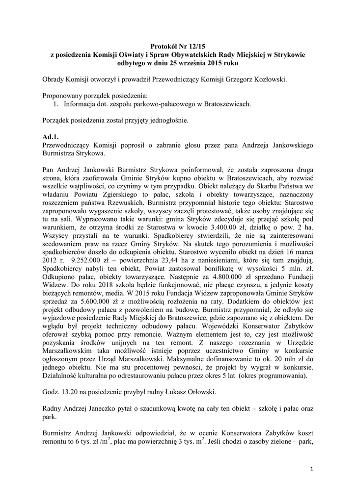Protokół Nr 12/15 z posiedzenia Komisji Oświaty i Spraw Obywatelskich Rady Miejskiej w Strykowie odbytego w dniu 25 września 2015 roku Obrady Komisji otworzył i prowadził Przewodniczący Komisji Grzegorz Kozłowski. Proponowany porządek posiedzenia: 1. Informacja dot. zespołu parkowo-pałacowego w Bratoszewicach. Porządek posiedzenia został przyjęty jednogłośnie. Ad.1. Przewodniczący Komisji poprosił o zabranie głosu przez pana Andrzeja Jankowskiego Burmistrza Strykowa. Pan Andrzej Jankowski Burmistrz Strykowa poinformował, że została zaproszona druga strona, która zaoferowała Gminie Stryków kupno obiektu w Bratoszewicach, aby rozwiać wszelkie wątpliwości, co czynimy w tym przypadku. Obiekt należący do Skarbu Państwa we władaniu Powiatu Zgierskiego to pałac, szkoła i obiekty towarzyszące, naznaczony roszczeniem państwa Rzewuskich. Burmistrz przypomniał historie tego obiektu: Starostwo zaproponowało wygaszenie szkoły, wszyscy zaczęli protestować, także osoby znajdujące się tu na sali. Wypracowano takie warunki: gmina Stryków zdecyduje się przejąć szkołę pod warunkiem, że otrzyma środki ze Starostwa w kwocie 3.400.00 zł, działkę o pow. 2 ha. Wszyscy przystali na te warunki. Spadkobiercy stwierdzili, że nie są zainteresowani scedowaniem praw na rzecz Gminy Stryków. Na skutek tego porozumienia i możliwości spadkobierców doszło do odkupienia obiektu. Starostwo wyceniło obiekt na dzień 16 marca 2012 r. 9.252.000 zł – powierzchnia 23,44 ha z naniesieniami, które się tam znajdują. Spadkobiercy nabyli ten obiekt, Powiat zastosował bonifikatę w wysokości 5 mln. zł. Odkupiono pałac, obiekty towarzyszące. Następnie za 4.800.000 zł sprzedano Fundacji Widzew. Do roku 2018 szkoła będzie funkcjonować, nie płacąc czynszu, a jedynie koszty bieżących remontów, media. W 2015 roku Fundacja Widzew zaproponowała Gminie Stryków sprzedaż za 5.600.000 zł z możliwością rozłożenia na raty. Dodatkiem do obiektów jest projekt odbudowy pałacu z pozwoleniem na budowę. Burmistrz przypomniał, że odbyło się wyjazdowe posiedzenie Rady Miejskiej do Bratoszewice, gdzie zapoznano się z obiektem. Do wglądu był projekt techniczny odbudowy pałacu. Wojewódzki Konserwator Zabytków oferował szybką pomoc przy remoncie. Ważnym elementem jest to, czy jest możliwość pozyskania środków unijnych na ten remont. Z naszego rozeznania w Urzędzie Marszałkowskim taka możliwość istnieje poprzez uczestnictwo Gminy w konkursie ogłoszonym przez Urząd Marszałkowski. Maksymalne dofinansowanie to ok. 20 mln zł do jednego obiektu. Nie ma stu procentowej pewności, że projekt by wygrał w konkursie. Działalność kulturalna po odrestaurowaniu pałacu przez okres 5 lat (okres programowania). Godz. 13.20 na posiedzenie przybył radny Łukasz Orłowski. Radny Andrzej Janeczko pytał o szacunkową kwotę na cały ten obiekt – szkołę i pałac oraz park. Burmistrz Andrzej Jankowski odpowiedział, że w ocenie Konserwatora Zabytków koszt remontu to 6 tys. zł /m2, płac ma powierzchnię 3 tys. m2. Jeśli chodzi o zasoby zielone – park, 1 zależy od tego co byśmy zamierzali robić. Mogą być ciągi piesze, oświetlenie, monitoring, konserwację zasobów leśnych. Przewodniczący Komisji mówił, że infrastruktura podziemna także jest w opłakanym stanie, do wymiany, ponieważ były prowadzone tylko bieżące remonty. Radny Krzysztof Bandurowicz pytał co Fundacja zamierza zrobić, gdy Gmina nie kupi tego obiektu. Pan Grzegorz Bakalarczyk z Fundacji Widzew powiedział, że założenia były następujące: właścicielem Fundacji był p. Cacek, od roku 2012 nie jest to Fundacja Widzew, ale Pałac Bratoszewice Akademia Futbolu w Bratoszewicach. Cel działalności – ośrodek sportowy dla szerokiej grupy, nie tylko dla Widzewa. Powstała klasa licealna, funkcjonowała przez okres 5 lat. Fundacja liczyła, że ten ośrodek z edukacją i kulturą powstanie. Sytuacja ekonomiczna nie pozwoliła na realizację planów. Na samym początku przedstawiciel p. Rzewuskich nie miał zamiaru sprzedaży tego obiektu, dopiero po licznych rozmowach zdecydowano na procedowanie sprzedaży zespołu Fundacji Widzew. Fundacja starała się o dotację z Funduszy Norweskich w wysokości 17 mln. zł na renowacje pałacu. Dotacji nie przyznano. Fundacja ma zobowiązania, są odsetki, których wartość rośnie. Zdaniem pana Bakalarczyka cały zespół powinien zostać we władzach lokalnych. Jeżeli gmina nie kupi, to obiekt zostanie skomercjalizowany, zamknięty do publicznego użytkowania. Przewodniczący Rady Paweł Kasica zapytał, czy Fundacja rozważała obniżenie wartości nieruchomości lub dołożenie innych obiektów. Pan Bakalarczyk odpowiedział, że innych obiektów nie ma. Nie możliwe jest obniżenie wartości, Fundacja nie prowadzi działalności gospodarczej, musi oddać pożyczkę. Przewodniczący Rady Paweł Kasica powiedział, że chyba naszej gminy nie stać na 40 mln i okres 10 lat, aby doprowadzić obiekt do użyteczności. Radny Bogdan Walczak- mam ogromne obawy o wiele spraw. Jeżeli miałoby dojść do ustaleń trzeba byłoby uzyskać pewne zapewnienia: 1. Czy podejmując się tego zakupu z punktu widzenia gminy byłby dobrym z punktu widzenia ekonomicznego – będą do wykorzystania budynki np. na szkoły, przedszkole, 2. Dlaczego do tego doszło, dlaczego tak się stało. 3. Brak tutaj konserwatora zabytków, który złagodziłby warunki konserwatorskie. 4. Nie podoba mi się forma zakupu Widzewa, była olbrzymia euforia, co to miało nie być w tym obiekcie. Pojawia się pytanie, co będzie jeżeli nie kupimy tego terenu. Jest to sprawa zbyt ważna , aby podjąć dziś decyzję. Trzeba rozmawiać z konserwatorem zabytków, przejrzeć dokumenty, sprawdzić czy nie przejdą na nas jakieś zobowiązania, obciążenia. Dopóki konserwator zabytków nie zdejmie obostrzeń, to trzeba się zastanowić. Pan Bakalarczyk: jest dokumen