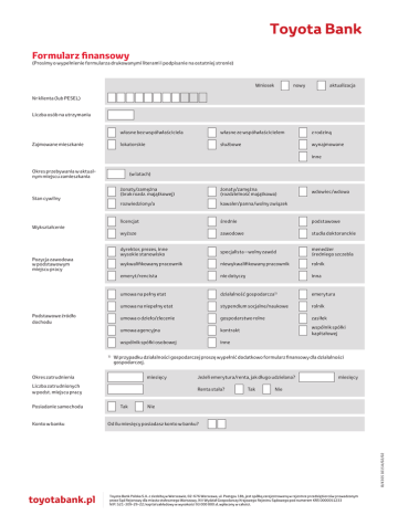 Formularz finansowy (Prosimy o wypełnienie formularza drukowanymi literami i podpisanie na ostatniej stronie) Wniosek nowy aktualizacja Nr klienta (lub PESEL) Liczba osób na utrzymaniu Zajmowane mieszkanie własne bez współwłaściciela własne ze współwłaścicielem z rodziną lokatorskie służbowe wynajmowane inne Okres przebywania w aktualnym miejscu zamieszkania (w latach) Stan cywilny Wykształcenie Pozycja zawodowa w podstawowym miejscu pracy Podstawowe źródło dochodu 1) żonaty/zamężna (brak rozdz. majątkowej) żonaty/zamężna (rozdzielność majątkowa) rozwiedziony/a kawaler/panna/wolny związek licencjat średnie podstawowe wyższe zawodowe studia doktoranckie dyrektor, prezes, inne wysokie stanowisko specjalista – wolny zawód menedżer średniego szczebla wykwalifikowany pracownik niewykwalifikowany pracownik rolnik emeryt/rencista nie dotyczy inna umowa na pełny etat działalność gospodarcza1) emerytura umowa na niepełny etat stypendium socjalne/naukowe rolnik umowa o dzieło/zlecenie gospodarstwo rolne zasiłek umowa agencyjna kontrakt wspólnik spółki kapitałowej wspólnik spółki osobowej inne W przypadku działalności gospodarczej proszę wypełnić dodatkowo formularz finansowy dla działalności gospodarczej. Okres zatrudnienia miesięcy Liczba zatrudnionych w podst. miejscu pracy Konto w banku Jeżeli emerytura/renta, jak długo udzielana? Renta stała? Tak Tak miesięcy Nie Nie Od ilu miesięcy posiadasz konto w banku? B/43 05 1015 A/02/02 Posiadanie samochodu wdowiec/wdowa Zobowiązania finansowe Miesięczny dochód w gospodarstwie domowym zł Twój całkowity miesięczny dochód zł Miesięczna suma rat od zaciągniętych i poręczonych kredytów zł Miesięczna suma innych stałych płatności zł Suma limitów odnawialnych (karta kredytowa, limit debetowy) zł Inne niż kredytowe stałe miesięczne zobowiązania finansowe (np. alimenty) zł Suma całkowitego zadłużenia z tytułu kredytów i pożyczek w bankach i innych podmiotach zł B/43 05 1015 A/02/02 Wysokość dochodów