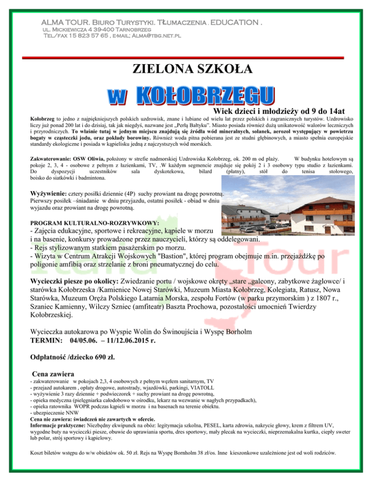 ALMA TOUR. Biuro Turystyki. TŁumaczenia . EDUCATION . ul. Mickiewicza 4 39-400 Tarnobrzeg Tel/fax 15 823 57 65 , e-mail; [email protected] ZIELONA SZKOŁA Wiek dzieci i młodzieży od 9 do 14at Kołobrzeg to jedno z najpiękniejszych polskich uzdrowisk, znane i lubiane od wielu lat przez polskich i zagranicznych turystów. Uzdrowisko liczy już ponad 200 lat i do dzisiaj, tak jak niegdyś, nazwane jest „Perłą Bałtyku”. Miasto posiada również dużą unikatowość walorów leczniczych i przyrodniczych. To właśnie tutaj w jednym miejscu znajdują się źródła wód mineralnych, solanek, aerozol występujący w powietrzu bogaty w cząsteczki jodu, oraz pokłady borowiny. Również woda pitna pobierana jest ze studni głębinowych, a miasto spełnia europejskie standardy ekologiczne i posiada w kąpielisku jedną z najczystszych wód morskich. Zakwaterowanie: OSW Oliwia, położony w strefie nadmorskiej Uzdrowiska Kołobrzeg, ok. 200 m od plaży. W budynku hotelowym są pokoje 2, 3, 4 - osobowe z pełnym z łazienkami, TV, .W każdym segmencie znajduje się pokój 2 i 3 osobowy typu studio z łazienkami. Do dyspozycji uczestników sala dyskotekowa, bilard (płatny), stół do tenisa stołowego, boisko do siatkówki i badmintona. Wyżywienie: cztery posiłki dziennie (4P) suchy prowiant na drogę powrotną. Pierwszy posiłek –śniadanie w dniu przyjazdu, ostatni posiłek - obiad w dniu wyjazdu oraz prowiant na drogę powrotną. PROGRAM KULTURALNO-ROZRYWKOWY: - Zajęcia edukacyjne, sportowe i rekreacyjne, kąpiele w morzu i na basenie, konkursy prowadzone przez nauczycieli, którzy są oddelegowani. - Rejs stylizowanym statkiem pasażerskim po morzu. - Wizyta w Centrum Atrakcji Wojskowych "Bastion", której program obejmuje m.in. przejażdżkę po poligonie amfibią oraz strzelanie z broni pneumatycznej do celu. Wycieczki piesze po okolicy: Zwiedzanie portu / wojskowe okręty „stare „galeony, zabytkowe żaglowce/ i starówka Kołobrzeska /Kamienice Nowej Starówki, Muzeum Miasta Kołobrzeg, Kolegiata, Ratusz, Nowa Starówka, Muzeum Oręża Polskiego Latarnia Morska, zespołu Fortów (w parku przymorskim ) z 1807 r., Szaniec Kamienny, Wilczy Szniec (amfiteatr) Baszta Prochowa, pozostałości umocnień Twierdzy Kołobrzeskiej. Wycieczka autokarowa po Wyspie Wolin do Świnoujścia i Wyspę Borholm TERMIN: 04/05.06. – 11/12.06.2015 r. Odpłatność /dziecko 690 zł. Cena zawiera - zakwaterowanie w pokojach 2,3, 4 osobowych z pełnym węzłem sanitarnym, TV - przejazd autokarem , opłaty drogowe, autostrady, wjazdówki, parkingi, VIATOLL - wyżywienie 3 razy dziennie + podwieczorek + suchy prowiant na drogę powrotną, - opieka medyczna (pielęgniarka całodobowo w ośrodku, lekarz na wezwanie w nagłych przypadkach), - opieka ratownika WOPR podczas kąpieli w morzu i na basenach na terenie obiektu. - ubezpieczenie NNW Cena nie zawiera: świadczeń nie zawartych w ofercie. Informacje praktyczne: Niezbędny ekwipunek na obóz: legitymacja szkolna, PESEL, karta zdrowia, nakrycie głowy, krem z filtrem UV, wygodne buty na wycieczki piesze, obuwie do uprawiania sportu, dres sportowy, mały plecak na wycieczki, nieprzemakalna kurtka, ciepły sweter lub polar, strój sportowy i kąpielowy. Koszt biletów wstępu do w/w obiektów ok. 50 zł. Rejs na Wyspę Bornholm 38 zł/os. Inne kieszonkowe uzależnione jest od woli rodziców.