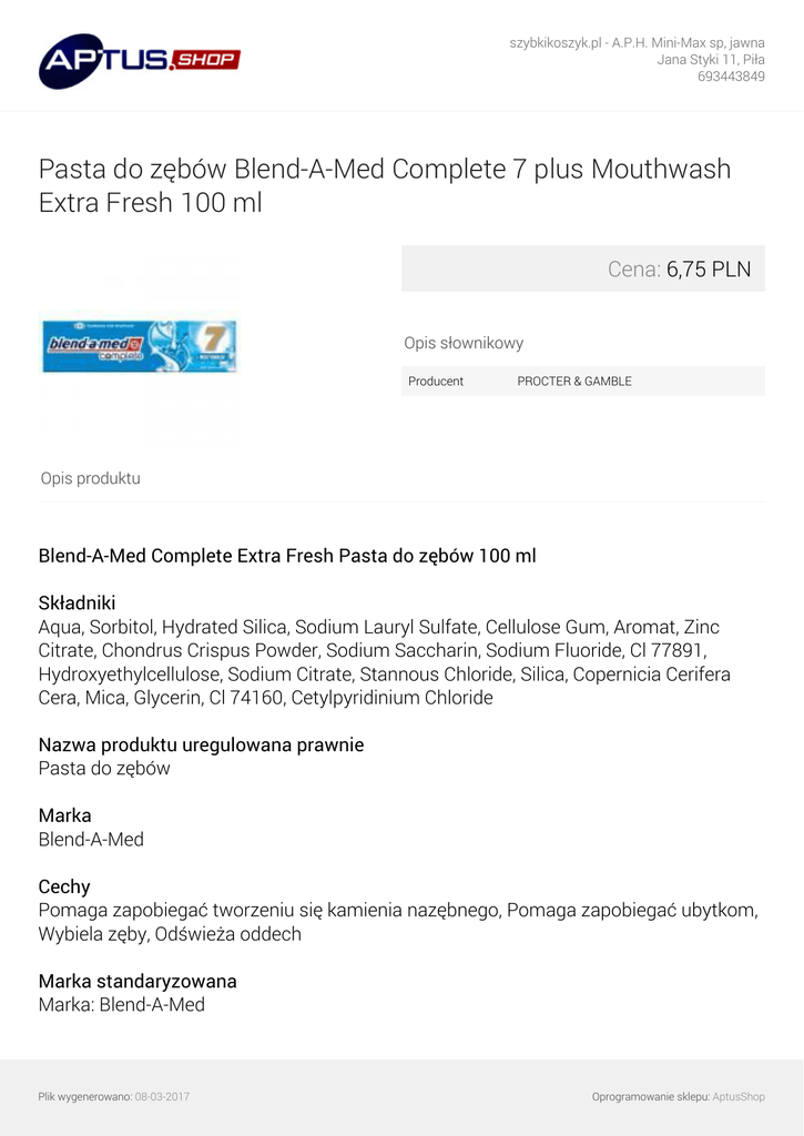 szybkikoszyk.pl - A.P.H. Mini-Max sp, jawna Jana Styki 11, Piła 693443849 Pasta do zębów Blend-A-Med Complete 7 plus Mouthwash Extra Fresh 100 ml Cena: 6,75 PLN Opis słownikowy Producent PROCTER & GAMBLE Opis produktu Blend-A-Med Complete Extra Fresh Pasta do zębów 100 ml Składniki Aqua, Sorbitol, Hydrated Silica, Sodium Lauryl Sulfate, Cellulose Gum, Aromat, Zinc Citrate, Chondrus Crispus Powder, Sodium Saccharin, Sodium Fluoride, Cl 77891, Hydroxyethylcellulose, Sodium Citrate, Stannous Chloride, Silica, Copernicia Cerifera Cera, Mica, Glycerin, Cl 74160, Cetylpyridinium Chloride Nazwa produktu uregulowana prawnie Pasta do zębów Marka Blend-A-Med Cechy Pomaga zapobiegać tworzeniu się kamienia nazębnego, Pomaga zapobiegać ubytkom, Wybiela zęby, Odświeża oddech Marka standaryzowana Marka: Blend-A-Med Plik wygenerowano: 08-03-2017 Oprogramowanie sklepu: AptusShop szybkikoszyk.pl - A.P.H. Mini-Max sp, jawna Jana Styki 11, Piła 693443849 Opis alternatywny Opis od dostawcy: Blend-A-Med Complete Extra Fresh Pasta do zębów 100 ml Podmarka Podmarka: Complete Adres firmy ul. Zabraniecka 20 03-872 Warszawa Opis produktu Pasta do zębów Blend-a-med Complete Extra Fresh zapewnia ochronę i poczucie niezwykłej świeżości, a w dodatku pomaga zadbać o świeży oddech. Pomaga zapobiegać tworzeniu się kamienia nazębnego i ubytków, a w dodatku wybiela zęby. Company Name Procter and Gamble DS Polska Sp. z o.o. Przygotowanie i stosowanie Myj zęby 3 razy dziennie szczoteczką manualną Oral-B i pastą Blend-a-med. Rodzaj przechowywania Typ: Przechowywać w temperaturze otoczenia Rozmiar opakowania 100 Jednostka (tekst opisowy) ml Średnia miara Średnia miara (e) Rodzaj opakowania Typ: Karton Wymiar liczbowy Wymiar liczbowy: 100 Plik wygenerowano: 08-03-2017 Oprogramowanie sklepu: AptusShop szybkikoszyk.pl - A.P.H. Mini-Max sp, jawna Jana Styki 11, Piła 693443849 Wymiar Wymagana wysokość na półce: 180 Wymagana szerokość na półce: 48 Wymagana głębokość na półce: 38 Waga Waga brutto: 153 Sprzedaż jednostkowa Wysokość: 140 Szerokość: 48 Głębokość: 38 Adres producenta Procter & Gamble, Weybridge, Surrey KT13 OXP, UK Adres zwrotny Procter and Gamble DS Polska Sp. z o.o. ul. Zabraniecka 20 03-872 Warszawa 801 25 88 25 Aby uzyskać dalsze informacje, należy skontaktować się z działem obsługi klienta. Telefon/Fax kontaktowy 801 25 88 25 Ostrzeżenie dotyczące bezpieczeństwa Dla dorosłych i młodzieży powyżej 12. roku życia. W przypadku dzieci powyżej 7. roku życia przed użyciem produktu należy skonsultować się z dentystą. Zawiera fluorek cyny i fluorek sodu (1450 ppm fluorku). Języki na opakowaniu angielski, polski Język produktu Główny język opisu: angielski Język danych: polski Podzielony opis produktu Plik wygenerowano: 08-03-2017 Oprogramowanie sklepu: AptusShop szybkikoszyk.pl - A.P.H. Mini-Max sp, jawna Jana Styki 11, Piła 693443849 Nazwa funkcjonalna: Pasta do zębów Wariant: Extra Fresh Plik wygenerowano: 08-03-2017 Powered by TCPDF (www.tcpdf.org) Oprogramowanie sklepu: AptusShop