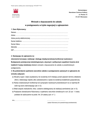 Numer sprawy nadany przez zamawiającego: NCK/ZP/ 79/11 Zamawiający: Narodowe Centrum Kultury ul. Płocka 13 01-231 Warszawa Wniosek o dopuszczenie do udziału w postępowaniu w trybie negocjacji z ogłoszeniem 1. Dane Wykonawcy: Nazwa:……………………………………………………………………………………….. Adres:………………………………………………………………………………………… Adres poczty elektronicznej:……………………………………………………………...….. Numer telefonu: ………………………………………………………………………..…..... Numer faksu: ……...……………………………………………………………………….... REGON: …………………………………………………………………………………….. NIP:...……………………………………………………………………………................... 2. Nawiązując do ogłoszenia na: stworzenie koncepcji, realizację i obsługę międzynarodowej konferencji naukowej w Budapeszcie poświęconej metodologicznym, etycznym i politycznym aspektom liczenia strat ludzkich II wojny światowej składam wniosek o dopuszczenie do udziału w przedmiotowym postępowaniu. 3. Na potwierdzenie spełniania warunków udziału w postępowaniu opisanych w ogłoszeniu do wniosku załączam: a) Aktualny wypis / odpis (wystawiony nie wcześniej niż 6 miesięcy przed upływem terminu składania ofert) z właściwego rejestru albo zaświadczenie o wpisie do ewidencji działalności gospodarczej. b) Wykaz zrealizowanych konferencji lub sympozjów naukowych przewidzianych na co najmniej 50 osób wg wzoru stanowiącego (zał. nr 2). c) Skład zespołu realizatorów, który zostanie oddelegowany do realizacji zamówienia (zał. nr 3); d) Podpisane oświadczenie Wykonawcy o spełnianiu warunków określonych w art. 22 ust. 1 i braku podstaw do wykluczenie na podst. Art. 24 ustawy (zał. nr 1.) dnia,………………………………….. ……..…............................................ (podpis Wykonawcy lub upoważnionego przedstawiciela) Numer sprawy nadany przez zamawiającego: NCK/ZP/ 79/11 Załącznik nr 1 do wniosku o dopuszczenie do udziału w postępowaniu OŚWIADCZENIE (pieczęć Wykonawcy/Wykonawców) (zgodnie z art. 24 oraz 22 ust. 1 ustawy Pzp) Składając ofertę w postępowaniu prowadzonym w trybie negocjacji z ogłoszeniem na podstawie art. 55 ust. 1 pkt. 3 stworzenie koncepcji, realizację i obsługę międzynarodowej konferencji naukowej w Budapeszcie poświęconej metodologicznym, etycznym i politycznym aspektom liczenia strat ludzkich II wojny światowej, oświadczamy, że spełniamy warunki dotyczące: 1) Posiadania uprawnień do wykonywania określonej działalności lub czynności, wymagane przepisami prawa, 2) Posiadania wiedzy i doświadczenia; 3) Dysponowania odpowiednim potencjałem technicznym oraz osobami zdolnymi do wykonania zamówienia oraz na każde wezwanie Zamawiającego przedstawimy pisemne zobowiązanie innych podmiotów do udostępnienia potencjału technicznego i osób zdolnych do wykonania zamówienia; 4) Sytuacji ekonomicznej i finansowej; 5) Nie podlegania wykluczeniu z postępowania o udzielenie zamówienia na podst. art. 24 ustawy Pzp.; Wszystkie mające lub mogące mieć wpływ na wynik niniejszego postępowania o udzielenie zamówienia informacje i oświadczenia złożone przez Wykonawcę/Wykonawców w związku z niniejszym postępowaniem o udzielenie zamówienia są prawdziwe w dacie ich przekazywania do Zamawiającego. dnia,………………………………….. ……..…............................................ (podpis Wykonawcy lub upoważnionego przedstawiciela) Numer sprawy nadany przez zamawiającego: NCK/ZP/ 79/11 Załącznik Nr 2 do wniosku o dopuszczenie do udziału w postępowaniu ......................................................... Pieczęć Wykonawcy Wykaz zrealizowanych w okresie ostatnich trzech lat, a jeśli okres działalności jest krótszy to w tym okresie, konferencji lub sympozjów naukowych przewidzianych na co najmniej 50 osób. potwierdzający spełnianie przez Wykonawcę warunku, o którym mowa w pkt. b) wymagań od wykonawców z Ogłoszenia o zamówieniu w trybie negocjacji z ogłoszeniem. Lp. Opis konferencji lub sympozjum Liczba uczestników Daty realizacji i lokalizacja Zamawiający ................................................................... podpisy oraz pieczątki imienne upoważnionych przedstawicieli Wykonawcy Numer sprawy nadany przez zamawiającego: NCK/ZP/ 79/11 Załącznik Nr 3 do wniosku o dopuszczenie do udziału w postępowaniu ......................................................... Pieczęć Wykonawcy Skład zespołu realizatorów, który zostanie oddelegowany do realizacji zamówienia potwierdzający spełnianie przez Wykonawcę warunku, o którym mowa w pkt. c) wymagań od wykonawców z Ogłoszenia o zamówieniu w trybie negocjacji z ogłoszeniem. Lp. Imię i nazwisko Zakres obowiązków przy realizacji projektu Tytuł naukowy 1 2 3 … ................................................................... podpisy oraz pieczątki imienne upoważnionych przedstawicieli Wykonawcy