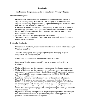 Regulamin Konkursu na film promujący Europejską Szkołę Wyższą w Sopocie I Postanowienia ogólne 1. Organizatorem konkursu na film promujący Europejską Szkołę Wyższą w 2. 3. 4. 5. Sopocie (zwanego dalej „Konkursem”) jest Europejska Szkoła Wyższa w Sopocie (zwana dalej „Organizatorem”), reprezentowana przez Prorektora ESW prof. dra hab. inż. Józefa Grochowicza. Cel konkursu stanowi rekomendacja Europejskiej Szkoły Wyższej w Sopocie (zwanej dalej „Uczelnią”) oraz wyróżnienie kreatywnych studentów Uczelni. Przedmiot Konkursu to krótkie filmy, trwające maksymalnie 3 minuty oraz rekomendujące Uczelnię. Niniejszy regulamin jest podstawą prawną Konkursu. W uzasadnionych przypadkach Organizator zastrzega sonie prawo do zmiany postanowień regulaminu. II Udział w Konkursie 1. Uczestnikami Konkursu, a zarazem autorami krótkich filmów rekomendujących Uczelnię, mogą być: - studenci Europejskiej Szkoły Wyższej w Sopocie studiujący w trybie stacjoarnym lub niestacjonarnym - inne osoby zainteresowane wzięciem udziału w konkursie. Pracownicy Uczelni oraz Akademii Sp. z o.o. nie mogą brać udziału w Konkursie. 2. Udział w Konkursie jest równoznaczny z akceptacją niniejszego regulaminu. 3. Udział w Konkursie jest równoznaczny z wyrażeniem zgody na przetwarzanie danych osobowych uczestnika na potrzeby Konkursu i Uczelni zgonie z ustawą z 29 sierpnia 1997 r. o ochronie danych osobowych (DZ.U. Z 2002 r. Nr 101,poz.926 z późn. zm.). 4. Regulamin Konkursu przewiduje nakręcenie krótkiego filmu z laureatem Nagrody Głównej oraz umieszczenie go i rozpowszechnianie w Internecie. 5. Udział w Konkursie jest równoznaczny z oświadczenie, że prace konkursowe nie naruszają praw osób trzecich, autor posiada zgodę na wykorzystywanie i przetwarzanie wizerunków osób i miejsc zarejestrowanych w filmie oraz ścieżki dźwiękowej stanowiącej podkład muzyczny do przedłożonego materiału audiowizualnego. 6. Organizator zastrzega sobie prawo do bezpłatnego korzystania z dostarczonych na Konkurs form filmowych na potrzeby związane z promocją Uczelni, z podaniem imienia i nazwiska autora pracy. 7. Przekazanie materiału audiowizualnego jest równoznaczne ze zbyciem się autorskich praw majątkowych do niego w myśl ustawy z dnia 4 lutego 1994 r. o prawie autorskim i prawach pokrewnych (DZ.U. 94, Nr 24, poz. 83). III Zasady zgłaszania prac konkursowych 1. Prace konkursowe należy dostarczyć do 30 kwietnia 2013 roku. 2. Film powinien zostać zapisany na płycie w dwóch egzemplarzach CD lub DVD, w powszechnie możliwym do odtworzenia formacie. 3. Na płytach z pracą konkursową należy umieścić plik tekstowy zawierający dane uczestnika Konkursu (imię i nazwisko, adres, telefon kontaktowy oraz adres emailowy) 4. Płytę należy dostarczyć do rektoratu ESW. IV Nagrody 1. Jury Konkursu w składzie ustalonym przez organizatora przyznaje I, II i III miejsce w Konkursie . 2. Nagrodą za zajęcie I miejsca w Konkursie jest weekendowy pobyt w SPA w Dworku Novello dla 4 osób o wartości 4 000 zł obejmujący: - nocleg o wartości 300 zł dla 1 os. - wyżywienie o wartości 200 zł dla 1 os. - ekskluzywne zabiegi SPA o wartości 500 zł dla 1 os. 3. Nagrodą za zajęcie II miejsca w Konkursie jest kolacja dla 4 osób o łącznej wartości 500 zł. 4. Nagrodą za zajęcie III miejsca w Konkursie jest kolacja dla 2 osób o łącznej wartości 5. 200 zł. 6. Ogłoszeni wyników Konkursu nastąpi do 13 maja 2013 roku. 7. Wyniki Konkursu zostaną ogłoszenie na stronie internetowej ESW, Facebooku oraz bezpośrednio przekazane laureatom. 8. W uzasadnionych przypadkach jury Konkursu może podjąć decyzję o innym rozdziale nagród o tej samej wartości. 9. Termin wykorzystania nagrody upływa z dniem 30 sierpnia 2013 roku. 10. Laureaci są zobowiązani do poinformowania organizatora z 7 dniowym wyprzedzeniem o wybranym terminie realizacji nagrody. 11. Każdemu uczestnikowi w konkursie przysługuje nagroda niespodzianka. V Postanowienia końcowe 1. Wszelkie nieujęte w niniejszym regulaminie kwestie regulują przepisy ustawy kodeks cywilny (DZ.U. 64, Nr 16, poz. 93 z późn. zm.). Organizator