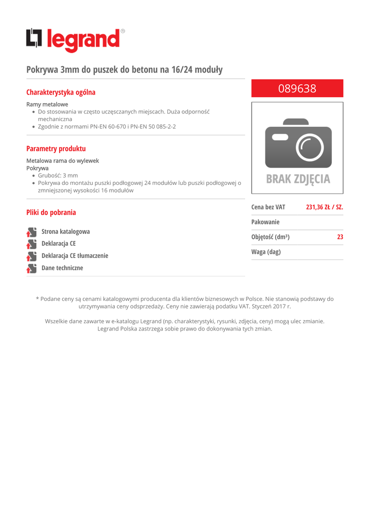 Pokrywa 3mm do puszek do betonu na 16/24 moduły Charakterystyka ogólna 089638 Ramy metalowe Do stosowania w często uczęsczanych miejscach. Duża odporność mechaniczna Zgodnie z normami PN-EN 60-670 i PN-EN 50 085-2-2 Parametry produktu Metalowa rama do wylewek Pokrywa Grubość: 3 mm Pokrywa do montażu puszki podłogowej 24 modułów lub puszki podłogowej o zmniejszonej wysokości 16 modułów Pliki do pobrania Cena bez VAT 231,36 ZŁ / SZ. Pakowanie Strona katalogowa Deklaracja CE Deklaracja CE tłumaczenie Objętość (dm³) Waga (dag) Dane techniczne * Podane ceny są cenami katalogowymi producenta dla klientów biznesowych w Polsce. Nie stanowią podstawy do utrzymywania ceny odsprzedaży. Ceny nie zawierają podatku VAT. Styczeń 2017 r. Wszelkie dane zawarte w e-katalogu Legrand (np. charakterystyki, rysunki, zdjęcia, ceny) mogą ulec zmianie. Legrand Polska zastrzega sobie prawo do dokonywania tych zmian. 23