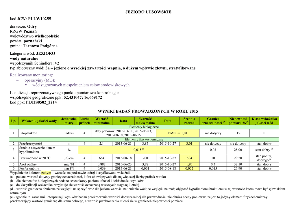JEZIORO LUSOWSKIE kod JCW: PLLW10255 dorzecze: Odry RZGW Poznań województwo wielkopolskie powiat: poznański gmina: Tarnowo Podgórne kategoria wód: JEZIORO wody naturalne współczynnik Schindlera: >2 typ abiotyczny wód: 3a – jezioro o wysokiej zawartości wapnia, o dużym wpływie zlewni, stratyfikowane Realizowany monitoring: operacyjny (MO): wód zagrożonych niespełnieniem celów środowiskowych Lokalizacja reprezentatywnego punktu pomiarowo-kontrolnego: współrzędne geograficzne ppk: 52,431047; 16,669172 kod ppk: PL02S0502_2214 WYNIKI BADAŃ PROWADZONYCH W ROKU 2015 Lp. Wskaźnik jakości wody 1 Fitoplankton 2 Przeźroczystość Średnie nasycenie tlenem hypolimnionu 3 4 Przewodność w 20 °C Jednostka Liczba miary próbek indeks 4 m 4 Wartość minimalna Wartość Średnia Data maksymalna roczna Elementy biologiczne daty poborów: 2015-03-11, 2015-06-23, PMPL = 1,01 2015-08-18, 2015-10-15 Elementy fizykochemiczne 2,1 2015-06-23 3,85 2015-10-27 3,01 Data % μS/cm 0,015 4 664 2015-08-18 (c 700 2015-10-27 684 Granica oznaczalności (a Niepewność pomiaru %(b Klasa wskaźnika jakości wód nie dotyczy 15 II nie dotyczy nie dotyczy stan dobry 0,03 28,00 stan dobry (d 10 29,20 stan poniżej dobrego (e stan dobry stan dobry 5 Azot ogólny mg N/l 4 0,882 2015-06-23 3,82 2015-10-27 1,93 0,3 32,10 6 Fosfor ogólny mg P/l 4 0,039 2015-06-23 0,061 2015-08-18 0,052 0,015 26,90 Wypełnienie kolorem żółtym – wartość, na podstawie której klasyfikowano wskaźnik (a – podana wartość dotyczy granicy oznaczalności, która obowiązywała dla największej liczby próbek w roku (b – dla elementów biologicznych podano szacunkowy poziom ufności i dokładności wyników (c – do klasyfikacji wskaźnika przyjmuje się wartość oznaczoną w szczycie stagnacji letniej (d – wartość graniczna obniżona ze względu na specyficzne dla jeziora wartości natlenienia wód; ze względu na małą objętość hypolimnionu brak tlenu w tej warstwie latem może być zjawiskiem naturalnym (e - zgodnie z zasadami interpretacji wyników badań przekroczenie wartości dopuszczalnej dla przewodności nie obniża oceny ponieważ, że jest to jedyny element fizykochemiczny przekraczający wartość graniczną dla stanu dobrego, a wartość przekroczenia mieści się w granicach niepewności pomiaru KLASYFIKACJA ELEMENTÓW BIOLOGICZNYCH, FIZYKOCHEMICZNYCH I HYDROMORFOLOGICZNYCH W JEDNOLITEJ CZĘŚCI WÓD Klasyfikacja elementów: biologicznych – II (DOBRY) fizykochemicznych – STAN DOBRY hydromorfologicznych – I KLASA