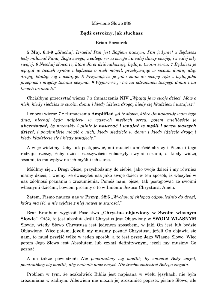 Mówione Słowo #38 Bądź ostrożny, jak słuchasz Brian Kocourek 5 Moj. 6:4-9 „Słuchaj, Izraelu! Pan jest Bogiem naszym, Pan jedynie! 5 Będziesz tedy miłował Pana, Boga swego, z całego serca swego i a całej duszy swojej, i z całej siły swojej. 6 Niechaj słowa te, które Ja ci dziś nakazuję, będą w twoim sercu. 7 Będziesz je wpajał w twoich synów i będziesz o nich mówił, przebywając w swoim domu, idąc drogą, kładąc się i wstając. 8 Przywiążesz je jako znak do swojej ręki i będą jako przepaska między twoimi oczyma. 9 Wypiszesz je też na odrzwiach twojego domu i na twoich bramach.” Chciałbym przeczytać wiersz 7 z tłumaczenia NIV „Wpajaj je w swoje dzieci. Mów o nich, kiedy siedzisz w swoim domu i kiedy idziesz drogą, kiedy się kładziesz i wstajesz.” I znowu wiersz 7 z tłumaczenia Amplified „A te słowa, które Ja nakazuję wam tego dnia, niechaj będą najpierw w waszych myślach serca, potem mielibyście je akcentować, by przenikły i pilnie je nauczać i wpajać w myśli i serca waszych dzieci, i powinniście mówić o nich, kiedy siedzicie w domu i kiedy idziecie drogą i kiedy kładziecie się i kiedy wstajecie.” A więc widzimy, żeby tak postępować, oni musieli umieścić obrazy i Pisma i tego rodzaju rzeczy, żeby dzieci rzeczywiście zobaczyły swymi oczami, a kiedy widzą oczami, to ma wpływ na ich myśli i ich serca. Módlmy się…. Drogi Ojcze, przychodzimy do ciebie, jako twoje dzieci i my również mamy dzieci, i wiemy, że ćwiczyłeś nas jako swoje dzieci w ten sposób, iż włożyłeś w nas zdolność poznania i zrozumienia. Pomóż nam, ojcze, tak postępować ze swoimi własnymi dziećmi, bowiem prosimy o to w Imieniu Jezusa Chrystusa. Amen. Zatem, Pismo naucza nas w Przyp. 22:6 „Wychowuj chłopca odpowiednio do drogi, którą ma iść, a nie zejdzie z niej nawet w starości.” Brat Branham wygłosił Poselstwo „Chrystus objawiony w Swoim własnym Słowie”. Otóż, to jest absolut. Jeśli Chrystus jest Objawiony w SWOIM WŁASNYM Słowie, wtedy Słowo Chrystusa jest jedynym sposobem, w jaki On jest lub będzie Objawiony. Więc potem, jeżeli my musimy poznać Chrystusa, jeżeli On objawia się nam, to musi przyjść tylko w jeden sposób, a to jest przez Jego Własne Słowo. Więc potem Jego Słowo jest Absolutem lub czymś definitywnym, jeżeli my musimy Go poznać. A on także powiedział: Nie powinniśmy się modlić, by zmienić Boży zmysł; powinniśmy się modlić, aby zmienić nasz zmysł. Nie trzeba zmieniać Bożego zmysłu. Problem w tym, że aczkolwiek Biblia jest napisana w wielu językach, nie była zrozumiana w żadnym. Albowiem nie można jej zrozumieć poprzez pisane Słowo, ale poprzez Zmysł Chrystusa. Chociaż Słowo jest przedstawione prawie każdej cywilizacji, która ma pisany język, jednak nie jest to język, w którym jest zrozumiana, ale poprzez Objawienie. 1 Kor. 2:9-16 „ Głosimy tedy, jak napisano: Czego oko nie widziało i ucho nie słyszało, i co do serca ludzkiego nie wstąpiło, to przygotował Bóg tym, którzy go miłują. 10 Albowiem nam objawił to Bóg przez Ducha; gdyż Duch bada wszystko, nawet głębokości Boże. 11 Bo któż z ludzi wie, kim jest człowiek, prócz ducha ludzkiego, który w nim jest? Tak samo kim jest Bóg, nikt nie poznał, tylko Duch Boży. 12 A myśmy otrzymali nie ducha świata, lecz Ducha, który jest z Boga, abyśmy wiedzieli, czym nas Bóg łaskawie obdarzył. 13 Głosimy to nie w uczonych słowach ludzkiej mądrości, lecz w słowach, których naucza Duch, przykładając do duchowych rzeczy duchową miarę. 14 Ale człowiek zmysłowy nie przyjmuje tych rzeczy, które są z Ducha Bożego, bo są dlań głupstwem, i nie może ich poznać, gdyż należy je duchowo rozsądzać. 15 Człowiek zaś duchowy rozsądza wszystko, sam zaś nie podlega niczyjemu osądowi. 16 Bo któż poznał myśl Pana? Któż może go pouczać? Ale my jesteśmy myśli Chrystusowej.” Zatem, to miejsce pisma mówi nam, że w żaden sposób nie zrozumiemy spraw Bożych, dopóki Duch Boży nie jest w nas. Więc ponad wszystko módl się do Boga, by dał nam Swego Ducha. Otóż, w 1 Piotra 1:10-13 on mówi o Łasce czasu końca, która jest po to, aby nas przyprowadzić do miejsca objawienia Jezusa Chrystusa. „10 Zbawienia tego poszukiwali i wywiadywali się o nie prorocy, którzy prorokowali o przeznaczonej dla was łasce, 11 Starając się wybadać, na który albo na jaki to czas wskazywał działający w nich Duch Chrystusowy, który przepowiadał cierpienia, mające przyjść na Chrystusa, ale też mające potem nastać uwielbienie. 12 Im to zostało objawione, że nie sobie samym, lecz wam usługiwali w tym, co teraz wam zostało zwiastowane przez tych, którzy w Duchu Świętym zesłanym z nieba opowiadali wam radosną nowinę; a są to rzeczy, w które sami aniołowie wejrzeć pragną. 13 Dlatego okiełzajcie umysły wasze i trzeźwymi będąc, połóżcie całkowicie nadzieję waszą w łasce, która wam jest dana w objawieniu się Jezusa Chrystusa.” I widzimy, że Paweł księdze do Koryntian mówi o Łasce czasu końca, iż ona jest po to, by przyprowadzić nas do zupełnego zmysłu Chrystusowego. 1 Kor. 1:4-10 „Dziękuję Bogu zawsze za was, za łaskę Bożą, która wam jest dana w Chrystusie Jezusie, 5 Iżeście w nim ubogaceni zostali we wszystko, we wszelkie słowo i wszelkie poznanie, 6 Ponieważ świadectwo o Chrystusie zostało utwierdzone w was, 7 Tak iż nie brak wam żadnego daru łaski, wam, którzy oczekujecie objawienia Pana naszego Jezusa Chrystusa, 8 Który też utwierdzi was aż do końca, tak iż będziecie bez nagany w dniu Pana naszego Jezusa Chrystusa. 9 Wierny jest Bóg, który was powołał do społeczności Syna swego Jezusa Chrystusa, Pana naszego. 10 A proszę was, bracia, w imieniu Pana naszego, Jezusa Chrystusa, abyście wszyscy byli jednomyślni i aby nie było między wami rozłamów, lecz abyście byli zespoleni jednośc