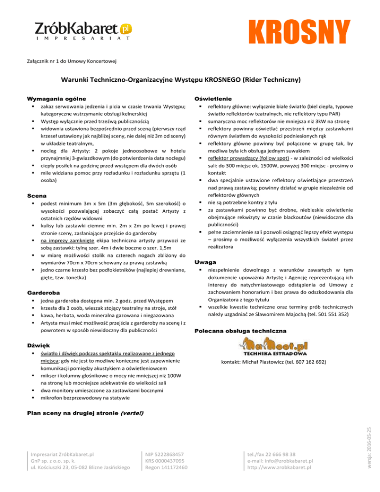 Załącznik nr 1 do Umowy Koncertowej Warunki Techniczno-Organizacyjne Występu KROSNEGO (Rider Techniczny) Wymagania ogólne zakaz serwowania jedzenia i picia w czasie trwania Występu; kategoryczne wstrzymanie obsługi kelnerskiej Występ wyłącznie przed trzeźwą publicznością widownia ustawiona bezpośrednio przed sceną (pierwszy rząd krzeseł ustawiony jak najbliżej sceny, nie dalej niż 3m od sceny) w układzie teatralnym, nocleg dla Artysty: 2 pokoje jednoosobowe w hotelu przynajmniej 3-gwiazdkowym (do potwierdzenia data noclegu) ciepły posiłek na godzinę przed występem dla dwóch osób mile widziana pomoc przy rozładunku i rozładunku sprzętu (1 osoba) Scena podest minimum 3m x 5m (3m głębokość, 5m szerokość) o wysokości pozwalającej zobaczyć całą postać Artysty z ostatnich rzędów widowni kulisy lub zastawki ciemne min. 2m x 2m po lewej i prawej stronie sceny, zasłaniające przejście do garderoby na imprezy zamknięte ekipa techniczna artysty przywozi ze sobą zastawki: tylną szer. 4m i dwie boczne o szer. 1,5m w miarę możliwości stolik na czterech nogach zbliżony do wymiarów 70cm x 70cm schowany za prawą zastawką jedno czarne krzesło bez podłokietników (najlepiej drewniane, gięte, tzw. tonetka) Garderoba jedna garderoba dostępna min. 2 godz. przed Występem krzesła dla 3 osób, wieszak stojący teatralny na stroje, stół kawa, herbata, woda mineralna gazowana i niegazowana Artysta musi mieć możliwość przejścia z garderoby na scenę i z powrotem w sposób niewidoczny dla publiczności Dźwięk światło i dźwięk podczas spektaklu realizowane z jednego miejsca; gdy nie jest to możliwe konieczne jest zapewnienie komunikacji pomiędzy akustykiem a oświetleniowcem mikser i kolumny głośnikowe o mocy nie mniejszej niż 100W na stronę lub mocniejsze adekwatnie do wielkości sali dwa monitory umieszczone za zastawkami bocznymi mikrofon bezprzewodowy na statywie Oświetlenie reflektory główne: wyłącznie białe światło (biel ciepła, typowe światło reflektorów teatralnych, nie reflektory typu PAR) sumaryczna moc reflektorów nie mniejsza niż 3kW na stronę reflektory powinny oświetlać przestrzeń między zastawkami równym światłem do wysokości podniesionych rąk reflektory główne powinny być połączone w grupę tak, by możliwa była ich obsługa jednym suwakiem reflektor prowadzący (follow spot) - w zależności od wielkości sali: do 300 miejsc ok. 1500W, powyżej 300 miejsc - prosimy o kontakt dwa specjalnie ustawione reflektory oświetlające przestrzeń nad prawą zastawką; powinny działać w grupie niezależnie od reflektorów głównych nie są potrzebne kontry z tyłu za zastawkami powinno być drobne, niebieskie oświetlenie obejmujące rekwizyty w czasie blackoutów (niewidoczne dla publiczności) pełne zaciemnienie sali pozwoli osiągnąć lepszy efekt występu – prosimy o możliwość wyłączenia wszystkich świateł przez realizatora Uwaga niespełnienie dowolnego z warunków zawartych w tym dokumencie upoważnia Artystę i Agencję reprezentującą ich interesy do natychmiastowego odstąpienia od Umowy z zachowaniem honorarium i bez prawa do odszkodowania dla Organizatora z tego tytułu wszelkie kwestie techniczne oraz terminy prób technicznych należy uzgadniać ze Sławomirem Majochą (tel. 501 551 352) Polecana obsługa techniczna kontakt: Michał Piastowicz (tel. 607 162 692) Impresariat ZróbKabaret.pl GnP sp. z o.o. sp. k. ul. Kościuszki 23, 05-082 Blizne Jasińskiego NIP 5222868457 KRS 0000437095 Regon 141172460 tel./fax 22 666 98 38 e-mail: [email protected] http://www.zrobkabaret.pl wersja: 2016-05-25 Plan sceny na drugiej stronie (verte!) NIP 5222868457 KRS 0000437095 Regon 141172460 tel./fax 22 666 98 38 e-mail: [email protected] http://www.zrobkabaret.pl wersja: 2016-05-25 Impresariat ZróbKabaret.pl GnP sp. z o.o. sp. k. ul. Kościuszki 23, 05-082 Blizne Jasińskiego