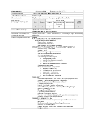 Kod przedmiotu 13.3-08-23-D/06 LICZBA PUNKTÓW ECTS Nazwa przedmiotu FIZYKA MATERIAŁÓW KOMPOZYTOWYCH Jednostka prowadząca Instytut Fizyki Kierunek studiów Fizyka, studia stacjonarne II stopnia, specjalność nanofizyka Rok, semestr, formy zajęć i liczba godzin Formy zajęć Rok Semestr wykład I II 15 Konwersatorium laboratorium ćwiczenia 15 2 Punkty ECTS 2 Kierownik i realizatorzy Wykład: dr Stanisław Tkaczyk Konwersatorium: dr Stanisław Tkaczyk Przedmioty wprowadzające i wymagania wstępne Wiedza podstawowa z zakresu podstaw fizyki , ciała stałego ,fizyki molekularnej, elektroniki . Wykład: NANAOSTUKTURY I NANOKOMPOZYTY Pojęcia podstawowe i objaśnienia - Nanostruktury naturalne - Nanostruktury w kosmosie - Nanostruktury w warunkach ziemskich STRUKTURY NANOSKOPOWE - NANORURKI WĘGLOWE - Skale wielkości nanocząstek - Struktury węgli - Nanorurki węglowe jednowarstwowe - Nanorurki węglowe wielowarstwowe - Otrzymywanie nanorurek - Transformacja nanopłaszczyzn o metoda katalityczna • metoda chemicznego osadzania • metoda laserowa • metoda wysokociśnieniowej konwersji - Oczyszczanie nanorurek - Własności nanorurek i kompozytów • własności elektryczne • źródła światła i wyświetlacze • nanorurki w elektronoce • manipulacja nanorurkami • inne zastosowania nanorurek POLIMERY - Powstawanie polimerów i ich nazwy ( nazwy międzynarodowe) - Struktura a taktyczność polimerów - morfologia - Własności fizyczne charakteryzujące polimery - Kompozyty polimerowe - Energia dysocjacji wiazań w polimerach - Termostabilność polimerów o złoŜonym łańcuchu głównym - Polimery ciekłokrystaliczne - Homopolimery i ich pochdne - Kopolimery i termopolimery - Kauczuki syntetyczne i lateksy - Wybrane ( najwaŜniejsze) pojęcia, ich synonimy oraz objeśnienia - Przejścia fazowe a struktura polimerów PRZEJŚCIE SZKLISTE – Tg - Budowa makrocząsteczek polimerów ( ukształtowanie łańcuch głównego) - Konformacja a konfiguracja łańcucha polimerowego - Struktury Im II i III rzędowe - Zmiana objętości właściwej w zaleŜności od temperatury - Przejście szkliste Ramowy program przedmiotu - Przejscie α, β, γ i δ dla polimerów MASA CZĄSTECZKOWA POLIMERU Metody wyznaczania temperatury zeszklenia - metoda dylatometryczna - metoda refraktometryczna - metoda termooptyczna - metoda termomechaniczna - metoda kalorymetryczna - metoda dynamiczna ( mechaniczna i dielektryczna) - metoda DSC w badaniu przejść fazowych ( przejście szkliste) - ZaleŜnośc Tg od masy cząsteczkowej i stopnia usieciowania ZJAWISKA POWIERZCHNIOWE - Powierzchnia i jej definicje - Zjawiska na granicy faz ( ciecz – gaz, ciecz – ciało stałe, ciało stałe – gaz NAPIĘCIE POWIERZCHNIOWE Powierzchnia i energia swobodna - Pomiar napięcia powierzchniowego cieczy przy uŜyciu kapilary - Włoskowatość - Kąt zwilŜania i jego pomiar - Pomiar napięcia powierzchniowego stopionych polimerów - metoda wiszącej kropli - metoda leŜącej kropli - Zjawisko histerezy zwilŜania MOLEKULARNE WARSTWY LANGMUIRA I LANGMUIRA – BLODGETT - Granica faz ciecz – gaz (ciecz nza powierzchni hydrofobowej i hydrofilowej) - Izoterma warstw molekularnych - Warstwy Langmuira - Blodgett typu X , Y , Z - Przenoszenie filmu LB na podłoŜe stałe - Schemat układu do nakładania cienkich warstw - Wanna Langmuira - Blodgett - Związki o charakterze warstwotwórczym - Struktury wytwarzane metodą LB - Analiza otrzymywanych warstw i kompozytów • mikroskopia optyczna i eklektronowa • elipsometria • skaningowa mikroskopia próbkująca (SPM) • spektroskopia XPS • spektroskopia elektronów Augera - Zastosowanie warstw Langmuira - Blodgett • optyka nieliniowa • elektronika • sensoryka (czujniki) - Struktury molekularne –nanokompozyty NANOTECHNOLOGIA – CO OZNACZA I CO W SOBIE KRYJĄ ZJAWISKA FIZYCZNE W NANOELEMENTACH Kropki kwantowe WYTWARZANIE NANOSTRUKTUR – 3D Fotolitografia Litografia rentgenowska Gamma litografia SPOSOBY OBSERWACJI NANOSTRUKTUR Mikroskop skaningowy Mikroskop tunelowy INśYNERIA TWORZENIA CZĄSTECZEK CHEMICZNYCH NANOMASZYNY I PERSPEKTYWY ROZWOJU Konwersatorium : Forma zaliczenia zajęć Metoda dydaktyczna Literatura Obliczenia teoretyczne z zakresu oddziaływań fundamentalnych atomów i cząsteczek molekularnych ,zjawisk powierzchniowych na granicy faz, obliczenia prowadzące do otrzymywania kompozytów : polimer – nanocząsti , otrzymywanie cienkich warstw kompozytowych i ich charakterystyka . Zaliczenie , wysłuchanie wykładów + wykonanie wszystkich problemów teoretycznych i praktycznych w laboratorium Wykład ,Konwersatorium :- rozwiązywanie problemów teoretycznych i praktycznych w laboratorium 1. Irma Gruin – „ Materiały polimerowe” Wydawnictwo Naukowe PWN Warszawa 2003 2. Maria Mucha – „ Polimery a ekologia” Politechnika Łódzka Łódź 2002 3. Guozhong Cao – „ Nanostructures & Nanomaterials” Lmperial College Press 2004 USA 4. R. Farchioni , G.Grosso (Eds.) – “Organoc Electronoc Materials” Springer Series in Materials Science 2001 5. M.Dragoman , D. Dragoman – „ Nanoelectronics“ , Artech House Inc.2006,USA 6. Alexi Nabok – “Organic and Inorganic Nanostructures” Artech House Inc.2005,USA