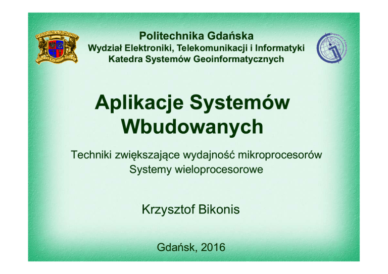 Politechnika Gdańska Wydział Elektroniki, Telekomunikacji i Informatyki Katedra Systemów Geoinformatycznych Aplikacje Systemów Wbudowanych Techniki zwiększające wydajność mikroprocesorów Systemy wieloprocesorowe Krzysztof Bikonis Gdańsk, 2016 Techniki zwiększające wydajność mikroprocesorów Przerwania • Przerwanie – sygnał powodujący zmianę przepływu sterowania, niezależnie od aktualnie wykonywanego programu i wykonanie przez procesor kodu jego obsługi • Przerwania dzielą się na: - Sprzętowe: - zewnętrzne – sygnał pochodzi z zewnętrznego układu - wewnętrzne – zgłaszane przez procesor dla sygnalizowania sytuacji wyjątkowych (np. dzielenie przez zero) • Programowe – z kodu programu wywołana jest procedura obsługi przerwania (najczęściej wykorzystywane do komunikacji z systemem operacyjnym) 2 Techniki zwiększające wydajność mikroprocesorów Bezpośredni dostęp do pamięci DMA • DMA ma za zadanie odciążyć procesor główny od samego przesyłania danych z miejsca na miejsce (np. z urządzenia wejściowego do pamięci), a procesor w tym czasie może robić co innego 3 Techniki zwiększające wydajność mikroprocesorów Pamięć podręczna CACHE procesora • Pamięć podręczna CACHE to mechanizm, w którym ostatnio pobierane dane dostępne ze źródła o dłuższym czasie dostępu i niższej przepustowości są przechowywane w pamięci o lepszych parametrach • Przyspiesza dostęp do relatywnie wolnej pamięci RAM • Charakteryzuje się bardzo krótkim czasem dostępu • Przechowuje dane, które będą w niedługim czasie przetwarzane 4 Techniki zwiększające wydajność mikroprocesorów Pamięć podręczna CACHE dysku twardego • Przyspiesza dostęp do bardzo wolnej pamięci masowej • Daje to możliwość przechowania danych w buforze i wysłania do kontrolera bez wykonywania cyklu dostępu do nośnika oraz wpływa pozytywnie na szybkość całego systemu 5 Techniki zwiększające wydajność mikroprocesorów Linia potokowa • Operacja obliczeniowa jest rozkładana na zbiór prostszych operacji elementarnych wykonywanych w kolejnych blokach • Bezpośrednio po zakończeniu pierwszego kroku, pierwsza porcja przetworzonych danych przekazana zostanie do drugiej itd. • W tym czasie na wejście pierwszego bloku mogą zostać podane nowe argumenty • W rezultacie procesor może wykonywać n instrukcji równocześnie CPU Sterowanie lokalne RAM blok1 blok2 blok3 blok4 6 Techniki zwiększające wydajność mikroprocesorów Zrównoleglenie • Zwiększenie szybkości działania pojedynczego procesora wcześniej, czy później napotka na barierę technologiczną • Choć nie wszystkie algorytmy sekwencyjne da się zastąpić równoległymi, istotnym podejściem do zwiększenia ogólnej wydajności jest wprowadzenie większej ilości procesorów do systemu • Ma to znaczenie w sytuacji, gdy od komputera oczekuje się między innymi interakcji z wieloma użytkownikami, lub wykonywania współbieżnie wielu aplikacji • Wprowadzenie współbieżności CPU1 wprowadza dodatkowe utrudnienia RAM CPU2 w projektowaniu oprogramowania oraz niedeterminizm CPU3 7 Techniki zwiększające wydajność mikroprocesorów • Proces – program w czasie wykonywania, wykonywanie musi przebiegać sekwencyjnie • W skład procesu wchodzi: - program - licznik rozkazów - stos - sekcja danych • Stany procesów: - nowy – proces został utworzony - wykonywany – są wykonywane instrukcje programu - oczekujący – proces czeka na zajście jakiegoś zdarzenia - gotowy – proces czeka na przydzielenie procesora - zakończony – proces zakończył wykonanie 8 Techniki zwiększające wydajność mikroprocesorów Diagram stanów procesu 9 Techniki zwiększające wydajność mikroprocesorów • Blok kontrolny procesu zawiera informacje o: - stanie procesu - stanie licznika rozkazów - stanie rejestrów procesora - informacje o szeregowaniu zadań przez procesor - informacje o pamięci zajętej przez proces - informacje o stanie wejściawejścia-wyjścia • Kolejki szeregowania procesów - kolejka zadań – zbiór wszystkich procesów w systemie - kolejka gotowych – zbiór wszystkich procesów umieszczonych w pamięci głównej, gotowych i czekających na wykonanie - kolejki do urządzeń – zbiór procesów czekających na określone urządzenie wejściawejścia-wyjścia 10 Techniki zwiększające wydajność mikroprocesorów Szeregowanie procesów • Szeregowanie długoterminowe - wybór procesów, które przejdą do kolejki gotowych - wykonywane rzadko (sekundy, minuty) - może być wolne • Szeregowanie krótkoterminowe - wybór następnego procesu do wykonania - przydział CPU - wykonywane często (milisekundy) - musi być szybkie 11 Techniki zwiększające wydajność mikroprocesorów Procesy można określić jako • zorientowane na urządzenia wejściewejście-wyjście • zorientowane na obliczenia Przełączanie kontekstu • przełączanie procesora do innego procesu wymaga przechowania stanu starego procesu i załadowanie przechowanego stanu nowego • czas przełączania kontekstu jest narzutem na działanie systemu • czas przełączania kontekstu zależy od wsparcia ze strony sprzętu 12 Techniki zwiększające wydajność mikroprocesorów Szeregowanie procesów – kryteria szeregowania • Wykorzystanie CPU – procent czasu zajętości CPU (max) • Przepustowość – liczba procesów, które zakończyły wykonanie w jednostce czasu (max) • Czas obrotu – czas potrzebny na wykonanie procesu (min) • Czas oczekiwania – czas spędzony przez proces w kolejce procesów gotowych (min) • Czas reakcji – czas liczony od chwili dostarczenia żądania do chwili uzyskania odpowiedzi (min) 13 Techniki zwiększające wydajność mikroprocesorów Algorytmy (krótkoterminowego) szeregowania procesów – kolejka prosta (FIFO) • Procesy wykonywane w kolejności przybywania • Brak wywłaszczania • Przykład Procesy i ich zapotr