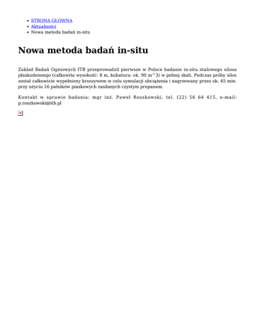 STRONA GŁÓWNA Aktualności Nowa metoda badań in-situ Nowa metoda badań in-situ Zakład Badań Ogniowych ITB przeprowadził pierwsze w Polsce badanie in-situ stalowego silosa płaskodennego (całkowita wysokość: 8 m, kubatura: ok. 90 m^3) w pełnej skali. Podczas próby silos został całkowicie wypełniony kruszywem w celu symulacji obciążenia i nagrzewany przez ok. 45 min. przy użyciu 16 palników piaskowych zasilanych czystym propanem. Kontakt w sprawie badania: mgr inż. Paweł Roszkowski, tel. (22) 56 64 415, e-mail: [email protected]