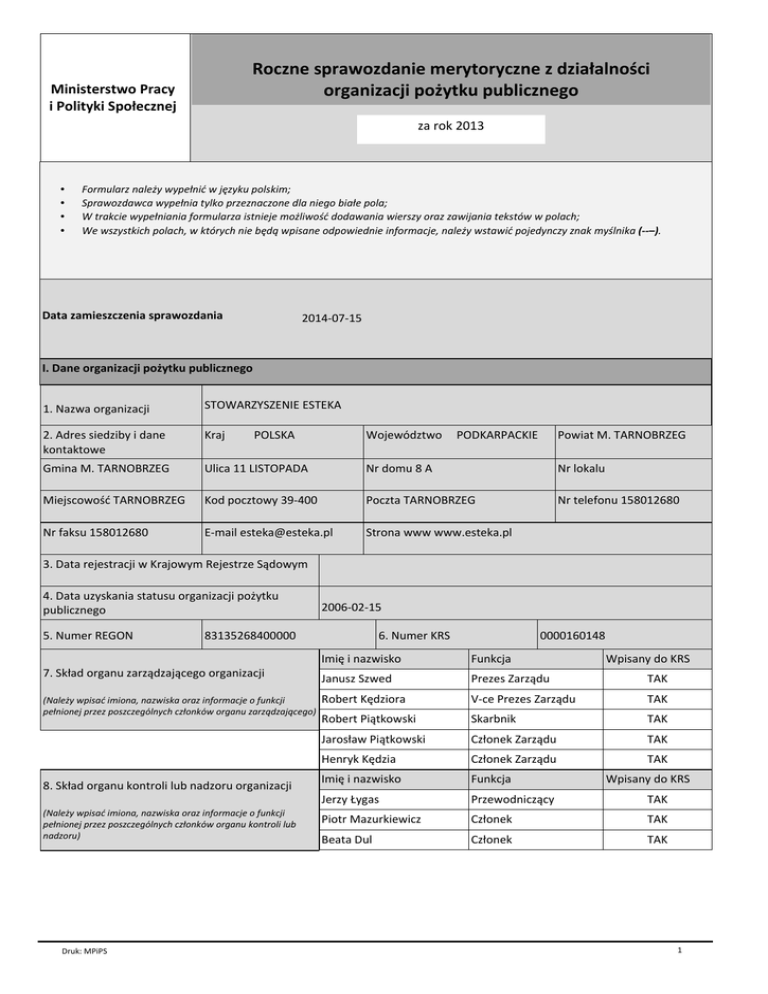 ZŽĐnjŶĞƐƉƌĂǁŽnjĚĂŶŝĞŵĞƌLJƚŽƌLJĐnjŶĞnjĚnjŝĂųĂůŶŽƑĐŝ ŽƌŐĂŶŝnjĂĐũŝƉŽǏLJƚŬƵƉƵďůŝĐnjŶĞŐŽ Ministerstwo Pracy ŝWŽůŝƚLJŬŝ^ƉŽųĞĐnjŶĞũ za rok 2013 • • • • &ŽƌŵƵůĂƌnjŶĂůĞǏLJǁLJƉĞųŶŝđǁũħnjLJŬƵƉŽůƐŬŝŵ͖ ^ƉƌĂǁŽnjĚĂǁĐĂǁLJƉĞųŶŝĂƚLJůŬŽƉƌnjĞnjŶĂĐnjŽŶĞĚůĂŶŝĞŐŽďŝĂųĞƉŽůĂ͖ tƚƌĂŬĐŝĞǁLJƉĞųŶŝĂŶŝĂĨŽƌŵƵůĂƌnjĂŝƐƚŶŝĞũĞŵŽǏůŝǁŽƑđĚŽĚĂǁĂŶŝĂǁŝĞƌƐnjLJŽƌĂnjnjĂǁŝũĂŶŝĂƚĞŬƐƚſǁǁƉŽůĂĐŚ͖ tĞǁƐnjLJƐƚŬŝĐŚƉŽůĂĐŚ͕ǁŬƚſƌLJĐŚŶŝĞďħĚČǁƉŝƐĂŶĞŽĚƉŽǁŝĞĚŶŝĞŝŶĨŽƌŵĂĐũĞ͕ŶĂůĞǏLJǁƐƚĂǁŝđƉŽũĞĚLJŶĐnjLJnjŶĂŬŵLJƑůŶŝŬĂ (--–). Data zamieszczenia sprawozdania 2014-07-15 /͘ĂŶĞŽƌŐĂŶŝnjĂĐũŝƉŽǏLJƚŬƵƉƵďůŝĐnjŶĞŐŽ 1. Nazwa organizacji STOWARZYSZENIE ESTEKA 2. Adres siedziby i dane kontaktowe Kraj Gmina M. TARNOBRZEG Ulica 11 LISTOPADA Nr domu 8 A Nr lokalu DŝĞũƐĐŽǁŽƑđdZEKZ' Kod pocztowy 39-400 Poczta TARNOBRZEG Nr telefonu 158012680 Nr faksu 158012680 E-mail [email protected] Strona www www.esteka.pl POLSKA Województwo PODKARPACKIE Powiat M. TARNOBRZEG ϯ͘ĂƚĂƌĞũĞƐƚƌĂĐũŝǁ<ƌĂũŽǁLJŵZĞũĞƐƚƌnjĞ^ČĚŽǁLJŵ ϰ͘ĂƚĂƵnjLJƐŬĂŶŝĂƐƚĂƚƵƐƵŽƌŐĂŶŝnjĂĐũŝƉŽǏLJƚŬƵ publicznego 5. Numer REGON 83135268400000 ϳ͘^ŬųĂĚŽƌŐĂŶƵnjĂƌnjČĚnjĂũČĐĞŐŽŽƌŐĂŶŝnjĂĐũŝ ;EĂůĞǏLJǁƉŝƐĂđŝŵŝŽŶĂ͕ŶĂnjǁŝƐŬĂŽƌĂnjŝŶĨŽƌŵĂĐũĞŽĨƵŶŬĐũŝ ƉĞųŶŝŽŶĞũƉƌnjĞnjƉŽƐnjĐnjĞŐſůŶLJĐŚĐnjųŽŶŬſǁŽƌŐĂŶƵnjĂƌnjČĚnjĂũČĐĞŐŽͿ ϴ͘^ŬųĂĚŽƌŐĂŶƵŬŽŶƚƌŽůŝůƵďŶĂĚnjŽƌƵŽƌŐĂŶŝnjĂĐũŝ ;EĂůĞǏLJǁƉŝƐĂđŝŵŝŽŶĂ͕ŶĂnjǁŝƐŬĂŽƌĂnjŝŶĨŽƌŵĂĐũĞŽĨƵŶŬĐũŝ ƉĞųŶŝŽŶĞũƉƌnjĞnjƉŽƐnjĐnjĞŐſůŶLJĐŚĐnjųŽŶŬſǁŽƌŐĂŶƵŬŽŶƚƌŽůŝůƵď nadzoru) Druk: MPiPS 2006-02-15 6. Numer KRS 0000160148 /ŵŝħŝŶĂnjǁŝƐŬŽ Funkcja Wpisany do KRS Janusz Szwed WƌĞnjĞƐĂƌnjČĚƵ TAK ZŽďĞƌƚ<ħĚnjŝŽƌĂ sͲĐĞWƌĞnjĞƐĂƌnjČĚƵ TAK ZŽďĞƌƚWŝČƚŬŽǁƐŬŝ Skarbnik TAK :ĂƌŽƐųĂǁWŝČƚŬŽǁƐŬŝ njųŽŶĞŬĂƌnjČĚƵ TAK ,ĞŶƌLJŬ<ħĚnjŝĂ njųŽŶĞŬĂƌnjČĚƵ TAK /ŵŝħŝŶĂnjǁŝƐŬŽ Funkcja :ĞƌnjLJBLJŐĂƐ WƌnjĞǁŽĚŶŝĐnjČĐLJ TAK Piotr Mazurkiewicz njųŽŶĞŬ TAK Beata Dul njųŽŶĞŬ TAK Wpisany do KRS 1 9. Cele statutowe organizacji ;EĂůĞǏLJŽƉŝƐĂđĐĞůĞŶĂƉŽĚƐƚĂǁŝĞƐƚĂƚƵƚƵŽƌŐĂŶŝnjĂĐũŝͿ ͲhƉŽǁƐnjĞĐŚŶŝĂŶŝĞǁŝĞĚnjLJŝƵŵŝĞũħƚŶŽƑĐŝŶĂƌnjĞĐnjŽďƌŽŶŶŽƑĐŝƉĂŷƐƚǁĂ͖ - Poznawanie, utrwalanie i propagowanie historii miasta i regionu Tarnobrzeskiego; ͲŽƌŐĂŶŝnjŽǁĂŶŝĞŬůƵďƵũĞǍĚnjŝĞĐŬŝĞŐŽ͖ - Stwarzanie warunków do wszechstronnego, intelektualnego, ĞŵŽĐũŽŶĂůŶĞŐŽ͕ƐƉŽųĞĐnjŶĞŐŽ͕ĚƵĐŚŽǁĞŐŽŝĨŝnjLJĐnjŶĞŐŽƌŽnjǁŽũƵĐnjųŽǁŝĞŬĂ͖ ͲEŝĞƐŬƌħƉŽǁĂŶĞŬƐnjƚĂųƚŽǁĂŶŝĞŽƐŽďŽǁŽƑĐŝĐnjųŽǁŝĞŬĂƉƌnjLJƉŽƐnjĂŶŽǁĂŶŝƵ ũĞŐŽƉƌĂǁĂĚŽǁŽůŶŽƑĐŝŝŐŽĚŶŽƑĐŝ͖ ͲhƉŽǁƐnjĞĐŚŶŝĂŶŝĞŝƵŵĂĐŶŝĂŶŝĞƉƌnjLJǁŝČnjĂŶŝĂĚŽǁĂƌƚŽƑĐŝƐƚĂŶŽǁŝČĐLJĐŚ ĨƵŶĚĂŵĞŶƚŽďLJǁĂƚĞůƐŬŝĐŚnjĂƐĂĚ͗ǁŽůŶŽƑĐŝ͕ƉƌĂǁĚLJ͕ŚŽŶŽƌƵ͕ ƐƉƌĂǁŝĞĚůŝǁŽƑĐŝ͕ĚĞŵŽŬƌĂĐũŝ͕ƌſǁŶŽƵƉƌĂǁŶŝĞŶŝĂ͕ƐĂŵŽƌnjČĚŶŽƑĐŝ͕ ƚŽůĞƌĂŶĐũŝŝƉƌnjLJũĂǍŶŝ͕ŽƌĂnjƵƉŽǁƐnjĞĐŚŶŝĂŶŝĞŝŽĐŚƌŽŶĂƉƌĂǁŬŽďŝĞƚƉŽƉƌnjĞnj ĚnjŝĂųĂůŶŽƑđŶĂƌnjĞĐnjƌſǁŶLJĐŚƉƌĂǁŬŽďŝĞƚŝŵħǏĐnjLJnjŶ͖ ͲhƉŽǁƐnjĞĐŚŶŝĂŶŝĞǁŝĞĚnjLJŽƑǁŝĞĐŝĞƉƌnjLJƌŽĚLJ͕ƉƌnjĞĐŝǁƐƚĂǁŝĂŶŝĞƐŝħũĞŐŽ ŶŝƐnjĐnjĞŶŝƵƉƌnjĞnjĐLJǁŝůŝnjĂĐũħ͕ŬƐnjƚĂųƚŽǁĂŶŝĞƉŽƚƌnjĞďLJŬŽŶƚĂŬƚƵnjŶŝĞƐŬĂǏŽŶČ ƉƌnjLJƌŽĚČ͖ ͲtƐƉŝĞƌĂŶŝĞƌŽnjǁŽũƵƐƉŽųĞĐnjĞŷƐƚǁĂŽďLJǁĂƚĞůƐŬŝĞŐŽŝĚnjŝĂųĂŶŝĞŶĂƌnjĞĐnj ƐǁŽďŽĚŶĞŐŽĚŽƐƚħƉƵĚŽŝŶĨŽƌŵĂĐũŝŶŝĞnjďħĚŶĞũĚůĂũĞŐŽƌŽnjǁŽũƵ͖ ͲtƐnjĞĐŚƐƚƌŽŶŶĞĚnjŝĂųĂŶŝĞŶĂƌnjĞĐnjŽƌŐĂŶŝnjĂĐũŝƉŽnjĂƌnjČĚŽǁLJĐŚ͖ ͲtƐƉŝĞƌĂŶŝĞƐƉŽųĞĐnjŶĞũĂŬƚLJǁŶŽƑĐŝŽďLJǁĂƚĞůŝ͕ŶĂƌnjĞĐnjƚĂŬŝĐŚŐƌƵƉ ƐƉŽųĞĐnjŶLJĐŚũĂŬ͗ŽƐŽďLJŶŝĞƉĞųŶŽƐƉƌĂǁŶĞ͕ƐĞŶŝŽƌnjLJ͕ďĞnjĚŽŵŶŝ͕ďĞnjƌŽďŽƚŶŝ͕ ĚnjŝĞĐŝ͕ŬŽďŝĞƚLJŽƌĂnjŝŶŶĞŐƌƵƉLJƐƉŽųĞĐnjŶĞǁLJŵĂŐĂũČĐĞǁƐƉĂƌĐŝĂ͕ ǁLJƌſǁŶLJǁĂŶŝĞƐnjĂŶƐƚLJĐŚŐƌƵƉŽƌĂnjƌĞĂůŝnjĂĐũĂnjĂĚĂŷǁnjĂŬƌĞƐŝĞƉŽŵŽĐLJ ƐƉŽųĞĐnjŶĞũ͖ ͲZŽnjǁŝũĂŶŝĞŝƉƌŽƉĂŐŽǁĂŶŝĞŝŶŝĐũĂƚLJǁ͕ƉŽƐƚĂǁŝĚnjŝĂųĂŷƐƉƌnjLJũĂũČĐLJĐŚ ƌŽnjǁŽũŽǁŝĚnjŝĞĐŝŝŵųŽĚnjŝĞǏLJͲŽƌŐĂŶŝnjŽǁĂŶŝĞǏLJĐŝĂŵųŽĚnjŝĞǏŽǁĞŐŽŝ ƌſǏŶLJĐŚũĞŐŽĚnjŝĞĚnjŝŶ͖ ͲKƌŐĂŶŝnjŽǁĂŶŝĞŝǁƐƉŝĞƌĂŶŝĞnjĂĚĂŷǁnjĂŬƌĞƐŝĞĚŽďƌŽĐnjLJŶŶŽƑĐŝ͕ƉŽŵŽĐLJ ƐƉŽųĞĐnjŶĞũŝŚƵŵĂŶŝƚĂƌŶĞũ͕ƉƌŽǁĂĚnjĞŶŝĞĚnjŝĂųĂůŶŽƑĐŝĐŚĂƌLJƚĂƚLJǁŶĞũ͖ - Prowadzenie rehabilitacji, rewalidacji i resocjalizacji dzieci i ŶŝĞƉĞųŶŽƐƉƌĂǁŶLJĐŚ͖ ͲŽƌŐĂŶŝnjŽǁĂŶŝĞŽƑƌŽĚŬĂƌĞŬƌĞĂĐũŝŝƌĞŚĂďŝůŝƚĂĐũŝƌƵĐŚŽǁĞũͲŚŝƉŽƚĞƌĂƉŝŝ͕ ͲhƉŽǁƐnjĞĐŚŶŝĂŶŝĞƐƉŽƌƚƵũĞǍĚnjŝĞĐŬŝĞŐŽ͕ŚŝƉƉŝŬŝ͕ǏĞŐůĂƌƐƚǁĂŝŝŶŶLJĐŚ ĚnjŝĞĚnjŝŶƐƉŽƌƚƵ͕ŬƵůƚƵƌLJĨŝnjLJĐnjŶĞũ͕njĚƌŽǁĞŐŽƐƚLJůƵ