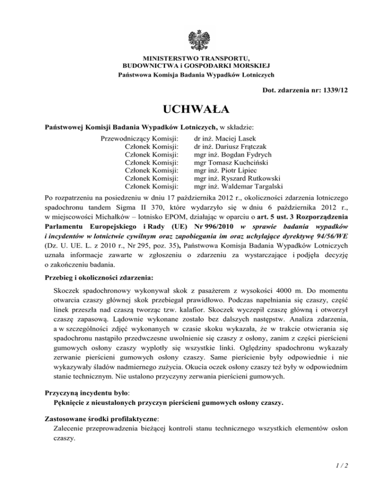 MINISTERSTWO TRANSPORTU, BUDOWNICTWA i GOSPODARKI MORSKIEJ Państwowa Komisja Badania Wypadków Lotniczych Dot. zdarzenia nr: 1339/12 UCHWAŁA Państwowej Komisji Badania Wypadków Lotniczych, w składzie: Przewodniczący Komisji: Członek Komisji: Członek Komisji: Członek Komisji: Członek Komisji: Członek Komisji: Członek Komisji: dr inż. Maciej Lasek dr inż. Dariusz Frątczak mgr inż. Bogdan Fydrych mgr Tomasz Kuchciński mgr inż. Piotr Lipiec mgr inż. Ryszard Rutkowski mgr inż. Waldemar Targalski Po rozpatrzeniu na posiedzeniu w dniu 17 października 2012 r., okoliczności zdarzenia lotniczego spadochronu tandem Sigma II 370, które wydarzyło się w dniu 6 października 2012 r., w miejscowości Michałków – lotnisko EPOM, działając w oparciu o art. 5 ust. 3 Rozporządzenia Parlamentu Europejskiego i Rady (UE) Nr 996/2010 w sprawie badania wypadków i incydentów w lotnictwie cywilnym oraz zapobiegania im oraz uchylające dyrektywę 94/56/WE (Dz. U. UE. L. z 2010 r., Nr 295, poz. 35), Państwowa Komisja Badania Wypadków Lotniczych uznała informacje zawarte w zgłoszeniu o zdarzeniu za wystarczające i podjęła decyzję o zakończeniu badania. Przebieg i okoliczności zdarzenia: Skoczek spadochronowy wykonywał skok z pasażerem z wysokości 4000 m. Do momentu otwarcia czaszy głównej skok przebiegał prawidłowo. Podczas napełniania się czaszy, część linek przeszła nad czaszą tworząc tzw. kalafior. Skoczek wyczepił czaszę główną i otworzył czaszę zapasową. Lądownie wykonane zostało bez dalszych następstw. Analiza zdarzenia, a w szczególności zdjęć wykonanych w czasie skoku wykazała, że w trakcie otwierania się spadochronu nastąpiło przedwczesne uwolnienie się czaszy z osłony, zanim z części pierścieni gumowych osłony czaszy wyplotły się wszystkie linki. Oględziny spadochronu wykazały zerwanie pierścieni gumowych osłony czaszy. Same pierścienie były odpowiednie i nie wykazywały śladów nadmiernego zużycia. Okucia oczek osłony czaszy też były w odpowiednim stanie technicznym. Nie ustalono przyczyny zerwania pierścieni gumowych. Przyczyną incydentu było: Pęknięcie z nieustalonych przyczyn pierścieni gumowych osłony czaszy. Zastosowane środki profilaktyczne: Zalecenie przeprowadzenia bieżącej kontroli stanu technicznego wszystkich elementów osłon czaszy. 1/2 Komisja postanowiła umieścić dodatkowo następujący komentarz: Pękanie pierścieni gumowych osłony czaszy oprócz zastosowania niewłaściwych rozmiarów pierścieni lub ich zużycia może być również powodowane przez wykonywanie zbyt dużych wplotów linek (co grozi również zakleszczeniem się linek – tzw. bag lock) lub nieostrożnym wkładaniem czaszy w osłonie do komory pokrowca. Z tych względów należy stosować pierścienie zgodne ze specyfikacją producenta, na bieżąco sprawdzać ich stan techniczny, a proces układania wykonywać ściśle z instrukcją. Nadzorujący badanie: mgr Tomasz Kuchciński podpis na oryginale 2/2