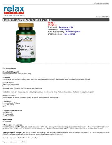 Informacje o produkcie Utworzono 08-03-2017 Swanson Kwercetyna 475mg 60 kaps. Cena : 93.50 zł Producent : Swanson, USA Dostępność : Dostępny Stan magazynowy : bardzo wysoki Średnia ocena : brak recenzji SUPLEMENT DIETY Zawartość 1 kapsułki: Kwercetyna (dihydrat kwercetyny) 475mg Składniki: Kwercetyna, hypromeloza, mąka ryżowa, laurynian wapnia(otoczka kapsułki), dwutlenek krzemu (substancje przeciwzbrylające). Sposób użycia: Jedna kapsułka dziennie. Nie przekraczać zalecanej porcji do spożycia w ciągu dnia. Produkt nie może być stosowany jako substytut prawidłowo zróżnicowanej diety. Produkt niewskazany dla kobiet w ciąży i karmiących. Przechowywanie: Przechowywać w temperaturze pokojowej, w sposób niedostępny dla małych dzieci. Producent: Swanson Health Products Fargo, ND 58108 USA Podmiot odpowiedzialny: Pro Sport S.C. ul. Pogodna 18 71-376 Szczecin Opakowanie: 60 kapsułek Informacje o producencie: Firma Swanson Health Products została założona w 1969 roku, jako wynik marzenia jednego człowieka o obdarowaniu całego świata dobrym zdrowiem. Do dzisiaj Firma kontynuując to marzenie, dociera do milionów ludzi świadomych swojego zdrowia w Stanach Zjednoczonych oraz na całym świecie. Swanson Health Products jest dumne ze swoich produktów i robi wszystko aby klienci byli w pełni zadowoleni. Te działania są czynione od początku istnienia firmy i przyniosły jej wiele splendoru oraz rzesze stałych, powracających klientów. Firma Swanson Health Products stara się aby: Wygenerowano w programie www.oscGold.com Cena produktu była możliwie najniższa. Czystość i Skuteczność była na jak najwyższym poziomie. Od kiedy firma szczyci się certyfikatem Dobrej Praktyki Wytwarzania (GMP) składniki są testowane na różnych etapach całego procesu produkcji w celu sprawdzenia czystości i mocy a gotowe produkty są badane przez niezależne laboratoria w celu potwierdzenia że, to co na etykiecie to jest w produkcie.
