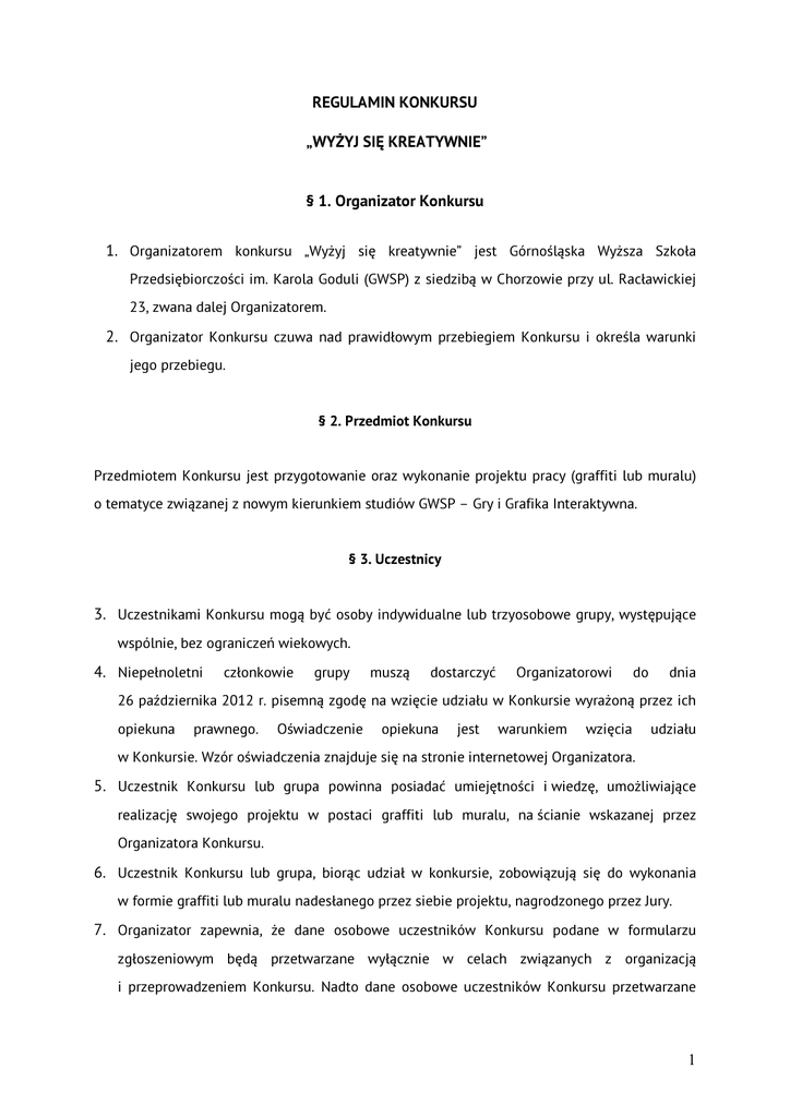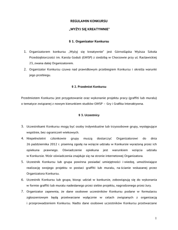 REGULAMIN KONKURSU „WYŻYJ SIĘ KREATYWNIE” § 1. Organizator Konkursu 1. Organizatorem konkursu „Wyżyj się kreatywnie” jest Górnośląska Wyższa Szkoła Przedsiębiorczości im. Karola Goduli (GWSP) z siedzibą w Chorzowie przy ul. Racławickiej 23, zwana dalej Organizatorem. 2. Organizator Konkursu czuwa nad prawidłowym przebiegiem Konkursu i określa warunki jego przebiegu. § 2. Przedmiot Konkursu Przedmiotem Konkursu jest przygotowanie oraz wykonanie projektu pracy (graffiti lub muralu) o tematyce związanej z nowym kierunkiem studiów GWSP – Gry i Grafika Interaktywna. § 3. Uczestnicy 3. Uczestnikami Konkursu mogą być osoby indywidualne lub trzyosobowe grupy, występujące wspólnie, bez ograniczeń wiekowych. 4. Niepełnoletni członkowie grupy muszą dostarczyć Organizatorowi do dnia 26 października 2012 r. pisemną zgodę na wzięcie udziału w Konkursie wyrażoną przez ich opiekuna prawnego. Oświadczenie opiekuna jest warunkiem wzięcia udziału w Konkursie. Wzór oświadczenia znajduje się na stronie internetowej Organizatora. 5. Uczestnik Konkursu lub grupa powinna posiadać umiejętności i wiedzę, umożliwiające realizację swojego projektu w postaci graffiti lub muralu, na ścianie wskazanej przez Organizatora Konkursu. 6. Uczestnik Konkursu lub grupa, biorąc udział w konkursie, zobowiązują się do wykonania w formie graffiti lub muralu nadesłanego przez siebie projektu, nagrodzonego przez Jury. 7. Organizator zapewnia, że dane osobowe uczestników Konkursu podane w formularzu zgłoszeniowym będą przetwarzane wyłącznie w celach związanych z organizacją i przeprowadzeniem Konkursu. Nadto dane osobowe uczestników Konkursu przetwarzane 1 będą przy zachowaniu zasad określonych w ustawie o ochronie danych osobowych (Dz. U. z 1997 r. Nr 133, poz. 883 z późn. zmianami); administratorem danych osobowych udostępnionych przez ww. osoby jest Górnośląska Wyższa Szkoła Przedsiębiorczości im. Karola Goduli w Chorzowie. 8. Podanie danych osobowych przez opiekuna prawnego uczestnika niepełnoletniego w związku z Konkursem ma charakter dobrowolny, ale ich brak uniemożliwia wzięcie udziału w Konkursie. Osobom udostępniającym dane przysługuje prawo do wglądu oraz możliwość ich poprawiania. 9. Uczestnikami nie mogą być pracownicy Organizatora oraz członkowie ich najbliższych rodzin. 10. Uczestnik Konkursu jest obowiązany do współdziałania z Organizatorem w zakresie prawidłowego przebiegu Konkursu i stosowania się do jego dyspozycji w tym zakresie. § 4. Praca Konkursowa 1. Zgłoszony do Konkursu projekt graffiti lub muralu musi być autorską pracą uczestnika Konkursu, nigdzie dotychczas niezrealizowaną. 2. Każda osoba lub grupa osób może zgłosić do Konkursu maksymalnie 2 projekty graffiti lub muralu. 3. Projekty muszą nawiązywać tematycznie do nowego kierunku studiów – Gry i Grafika Interaktywna. 4. Uczestnicy Konkursu biorą na siebie odpowiedzialność za nadesłane projekty i oświadczają, że posiadają do nich wszelkie prawa autorskie. § 5. Zgłoszenie do Konkursu 1. Zgłoszenie do Konkursu składa się na formularzu będącym załącznikiem do Regulaminu. 2. Wypełniony formularz zgłoszeniowy należy przesłać drogą elektroniczną na adres [email protected] w tytule maila wpisując: graffiti imię i nazwisko lub wysłać pocztą na adres Uczelni: Górnośląska Wyższa Szkoła Przedsiębiorczości, ul. Racławicka 23, 41-506 Chorzów, z dopiskiem Biuro Promocji „Konkurs Graffiti”, Do formularza należy dołączyć 2 projekt/projekty konkursowe oraz oświadczenie opiekuna prawnego jeśli jest to uczestnik małoletni. 3. Formularz zgłoszeniowy wraz z projektami należy przesłać do dnia 26 października 2012 r. (decyduje data nadania). 4. Projekt pracy konkursowej powinien spełniać następujące warunki: a) projekt może być wykonany dowolną techniką: rysunek, malarstwo, grafika komputerowa. b) projekty sporządzone odręcznie należy nadesłać pocztą tradycyjną w formacie A4 (210 x 297 mm), A3 (297 x 420 mm) lub A2 (420 x 594 mm) do wyboru lub drogą elektroniczną w formie skanu projektu, bądź pliku JPG. c) projekty wykonane komputerowo należy nadesłać pocztą elektroniczną lub tradycyjną wyłącznie na płycie CD w postaci plików *JPG, *tiff i *PDF, rozdzielczość min. 72 dpi. Do płyty załączyć należy wydruk projektu, zamieszczonego na płycie, w formacie A4 lub wysłać drogą elektroniczną z załącznikiem maks. 5 MG. 5. Formularze zgłoszeniowe wraz z projektem złożone po terminie nie będą rozpatrywane. 6. Nadesłane formularze zgłoszeniowe wraz z projektem nie będą zwracane. 7. Dokonując zgłoszenia projektu, każdy uczestnik Konkursu wyraża jednocześnie zgodę na nieodpłatne przeniesienie na Organizatora autorskich praw majątkowych do nadesłanego projektu, obejmujące następujące pola eksploatacji: a) utrwalanie i/lub zwielokrotnianie jakąkolwiek techniką, w tym m.in. drukiem, na kliszy fotograficznej, na taśmie magnetycznej, cyfrowo; b) wprowadzanie do pamięci komputera oraz do sieci komputerowej i/lub multimedialnej; c) publiczne udostępnianie w taki sposób, aby każdy mógł mieć do niego dostęp w miejscu i w czasie przez siebie wybranym (m.in. udostępniania w Internecie); d) publicznego wystawiania i wyświetlania; e) nieodpłatne wykorzystywanie w publikacjach, wystawach i filmach Górnośląskiej Wyższej Szkoły Przedsiębiorczości im. Karola Goduli – wyłącznie w ramach realizowanych przez Organizatora jego celów statutowych. § 6. Jury Zespołem powołanym do dokonania oceny spełniania przez uczestników konkursu wymagań określonych w regulaminie oraz do dokonania oceny złożonych prac konkursowych, a także wyboru i przyznania nagrody, jest Jury konkursowe. 3 § 7. Przebieg Konkursu 1. Konkurs jest jednoetapowy i otwarty. 2. Zgłoszone do Konkursu projekty graffiti/muralu Jury oceni i dokona wyboru jednego zwycięzcy/gru