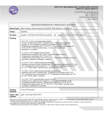 INSTYTUT METEOROLOGII I GOSPODARKI WODNEJ Państwowy Instytut Badawczy 51-616 Wrocław ul. Parkowa 30 tel: 71 320 01 50 fax: 71 348 73 37 [email protected] www.imgw.pl ŚREDNIOTERMINOWA PROGNOZA POGODY Nazwa biura Biuro Prognoz Meteorologicznych IMGW-PIB Oddział we Wrocławiu Obszar Opolskie Na okres od godz. 19:30 dnia 10.05.2012 (czwartek) do godz. 19:30 dnia 15.05.2012 (wtorek) Przebieg 10/11.05.-11.05. (czwartek/piątek-piątek) W nocy zachmurzenie małe i umiarkowane, w dzień wzrastające do dużego, aż do wystąpienia przelotnych opadów deszczu i burz. Temperatura minimalna od 13°C do 15°C. Temperatura maksymalna od 23°C do 26°C. Wiatr umiarkowany, w czasie burz porywisty, południowo-zachodni. 11/12.05.-12.05. (piątek/sobota-sobota) Zachmurzenie umiarkowane i duże i przelotne opady deszczu. Temperatura minimalna od 11°C do 14°C. Temperatura maksymalna od 14°C do 16°C. Wiatr umiarkowany, okresami porywisty, północno-zachodni i zachodni. 12/13.05.-13.05. (sobota/niedziela-niedziela) Zachmurzenie przeważnie umiarkowane. Temperatura minimalna od 1°C do 2°C. Przygruntowe przymrozki do -1°C. Temperatura maksymalna od 11°C do 13°C. Wiatr słaby i umiarkowany, północno-zachodni. 13/14.05.-14.05. (niedziela/poniedziałek-poniedziałek) Zachmurzenie małe i umiarkowane. Temperatura minimalna od 0°C do 2°C, przygruntowe przymrozki do -2°C. Temperatura maksymalna od 14°C do 16°C. Wiatr słaby, wschodni. 14/15.05.-15.05. (poniedziałek/wtorek-wtorek) Zachmurzenie umiarkowane stopniowo wzrastające do dużego, aż do wystąpienia opadów deszczu. Temperatura minimalna od 5°C do 8°C. Temperatura maksymalna od 17°C do 19°C. Wiatr słaby i umiarkowany, wschodni i południowo-wschodni. Dyżurny synoptyk Teresa Wilczyńska Godz. i data wydania godz. 14:01 dnia 08.05.2012 Opracowanie niniejsze jako przedmiot prawa autorskiego podlega ochronie prawnej, zgodnie z przepisami ustawy z dnia 4 lutego 1994r o prawie autorskim i prawach pokrewnych (dz. U. z 2006 r. Nr 90, poz. 631 z późn. zm.). Wszelkie dalsze udostępnianie, rozpowszechnianie (przedruk, kopiowanie, wiadomość sms) jest dozwolone wyłącznie w formie dosłownej z bezwzględnym wskazaniem źródła informacji tj. IMGW-PIB. Reklamacje dotyczące produktu można składać w terminie do 3 dni od daty wydania na adres [email protected].