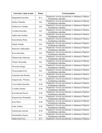 Nazwisko i imię ucznia Klasa Bargielska Karolina II A Dybicz Klaudia IIA Detkiewicz Natalia IIA Cwalina Karolina IIA Jankowska Izabela IIA Kościelecka Daria IIA Piątek Natalia IIA Ratuszna Aleksandra IIA Sowa Karolina IIA Śledziewska Martyna IIA Tokarz Weronika IIA Wysocka Kinga IIA Zwierzyńska Ewa IIA Gniazdowska Paulina II A Kurpiewska Wioleta IIA Czerwińska Karolina II B Cwalina Natalia II B Kowalewski Paweł II B Kurpiewska Dominika II B Kryś Piotr II B Łuba Adrian II B Sieniawska Justyna II B Dziemińska Żaneta II C Jankowska Ewa II C Tytuł projektu Kapliczki i krzyże przydrożne w dekanacie Piątnica . Architektura sakralna . Kapliczki i krzyże przydrożne w dekanacie Piątnica . Architektura sakralna . Kapliczki i krzyże przydrożne w dekanacie Piątnica . Architektura sakralna . Kapliczki i krzyże przydrożne w dekanacie Piątnica . Architektura sakralna . Kapliczki i krzyże przydrożne w dekanacie Piątnica . Architektura sakralna . Kapliczki i krzyże przydrożne w dekanacie Piątnica . Architektura sakralna . Kapliczki i krzyże przydrożne w dekanacie Piątnica . Architektura sakralna . Kapliczki i krzyże przydrożne w dekanacie Piątnica . Architektura sakralna . Kapliczki i krzyże przydrożne w dekanacie Piątnica . Architektura sakralna . Kapliczki i krzyże przydrożne w dekanacie Piątnica . Architektura sakralna . Kapliczki i krzyże przydrożne w dekanacie Piątnica . Architektura sakralna . Kapliczki i krzyże przydrożne w dekanacie Piątnica . Architektura sakralna . Kapliczki i krzyże przydrożne w dekanacie Piątnica . Architektura sakralna . Kapliczki i krzyże przydrożne w dekanacie Piątnica . Architektura sakralna . Kapliczki i krzyże przydrożne w dekanacie Piątnica . Architektura sakralna . Kapliczki i krzyże przydrożne w dekanacie Piątnica . Architektura sakralna . Kapliczki i krzyże przydrożne w dekanacie Piątnica . Architektura sakralna . Kapliczki i krzyże przydrożne w dekanacie Piątnica . Architektura sakralna . Kapliczki i krzyże przydrożne w dekanacie Piątnica . Architektura sakralna . Kapliczki i krzyże przydrożne w dekanacie Piątnica . Architektura sakralna . Kapliczki i krzyże przydrożne w dekanacie Piątnica . Architektura sakralna . Kapliczki i krzyże przydrożne w dekanacie Piątnica . Architektura sakralna . Kapliczki i krzyże przydrożne w dekanacie Piątnica . Architektura sakralna . Kapliczki i krzyże przydrożne w dekanacie Piątnica Szymański Łukasz II C Wawrzyniak Kamil II C Konopka Marcin II D Bagińska Martyna II D Matejkowski Przemysław II D Matejkowska Paulina II D Tarnacka Magdalena II D Mrozek Małgorzata II D Sakowski Artur II D Kołakowski Konrad II D Wykowska Kamila II D Szkaradziński Mateusz II D Zoń Damian II D Barczewska Izabela II E Wzorczuykowska Żaneta II E Borkowska Katarzyna II E Sochacki Jakub II E Litwińska Monika II E Faszyńska Patrycja II E Cwalina Magda II E Weronika Tokarz Natalia Piątek Izabela Jankowska Kinga Wysocka Karolina Bargielska Klaudia Dybicz Wiktoria Wilińska Katarzyna Borkowska II A II A II A II A II A II A II A II E . Architektura sakralna . Kapliczki i krzyże przydrożne w dekanacie Piątnica . Architektura sakralna . Kapliczki i krzyże przydrożne w dekanacie Piątnica . Architektura sakralna . Kapliczki i krzyże przydrożne w dekanacie Piątnica . Architektura sakralna . Kapliczki i krzyże przydrożne w dekanacie Piątnica . Architektura sakralna . Kapliczki i krzyże przydrożne w dekanacie Piątnica . Architektura sakralna . Kapliczki i krzyże przydrożne w dekanacie Piątnica . Architektura sakralna . Kapliczki i krzyże przydrożne w dekanacie Piątnica . Architektura sakralna . Kapliczki i krzyże przydrożne w dekanacie Piątnica . Architektura sakralna . Kapliczki i krzyże przydrożne w dekanacie Piątnica . Architektura sakralna . Kapliczki i krzyże przydrożne w dekanacie Piątnica . Architektura sakralna . Kapliczki i krzyże przydrożne w dekanacie Piątnica . Architektura sakralna . Kapliczki i krzyże przydrożne w dekanacie Piątnica . Architektura sakralna . Kapliczki i krzyże przydrożne w dekanacie Piątnica . Architektura sakralna . Kapliczki i krzyże przydrożne w dekanacie Piątnica . Architektura sakralna . Kapliczki i krzyże przydrożne w dekanacie Piątnica . Architektura sakralna . Kapliczki i krzyże przydrożne w dekanacie Piątnica . Architektura sakralna . Kapliczki i krzyże przydrożne w dekanacie Piątnica . Architektura sakralna . Kapliczki i krzyże przydrożne w dekanacie Piątnica . Architektura sakralna . Kapliczki i krzyże przydrożne w dekanacie Piątnica . Architektura sakralna . Kapliczki i krzyże przydrożne w dekanacie Piątnica . Architektura sakralna . Ochrona przyrody w gminie Piątnica Ochrona przyrody w gminie Piątnica Ochrona przyrody w gminie Piątnica Ochrona przyrody w gminie Piątnica Ochrona przyrody w gminie Piątnica Ochrona przyrody w gminie Piątnica Ochrona przyrody w gminie Piątnica Piątnica-gminą rolniczą Magda Cwalina Wioleta Ramotowska Adrian Kowalewski Kamil Serafiński Piotr Mertens Klaudia Zabielska Dominika Wądołowska Martyna Grużewska Gromek Paulina Demianowicz Magda Dutkowski Adrian Florczyk Maciej Gromek Paulina Lipiński Łukasz Wądołowska Dominika Wieczorek Paweł Wojewoda Izabela Zabielska Klaudia Zawadzka Urszula Sochacki Jakub Tarnacki Konrad Dziemińska Żaneta II E II E II E II E II E 2B 2B 2B 2B II B II B II B II B II B II B II B II B II B II B II E II E II C Piątnica-gminą rolniczą Piątnica-gminą rolniczą Piątnica-gminą rolniczą Piątnica-gminą rolniczą Piątnica-gminą rolniczą Struktura samorządu gminy Piątnica Struktura samorządu gminy Piątnica Struktura samorządu gminy Piątnica Struktura samorządu gminy Piątnica Metody oczyszczania ścieków na terenie Piątnicy. Metody oczyszczania ścieków na terenie Piątnicy. Metody oczyszczania ścieków na terenie Piątnicy. Metody oczyszczania ścieków na terenie Piątnicy. Metody oczy
